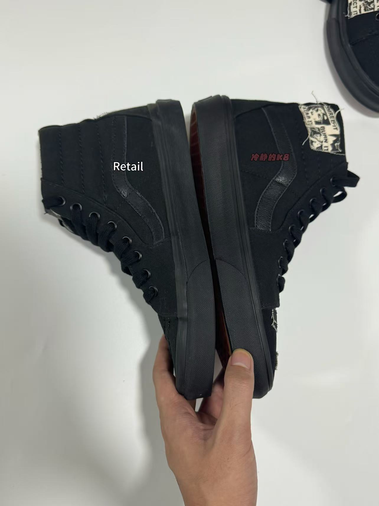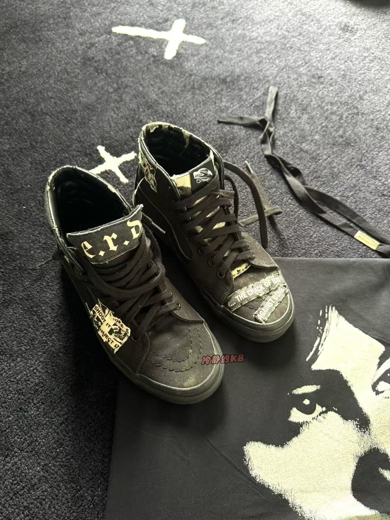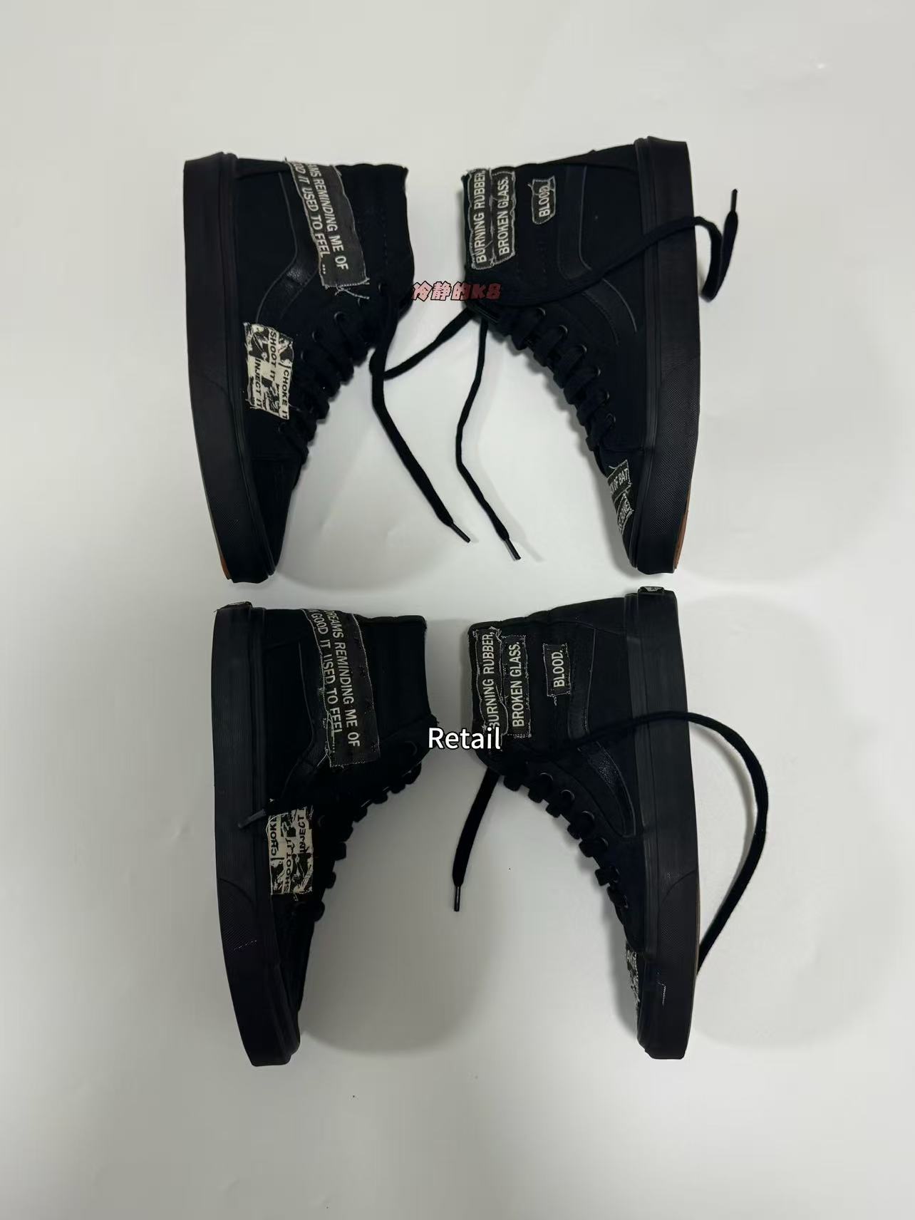 采用早期标志性厌世烟女和梵文logo标语贴布于鞋舌鞋身