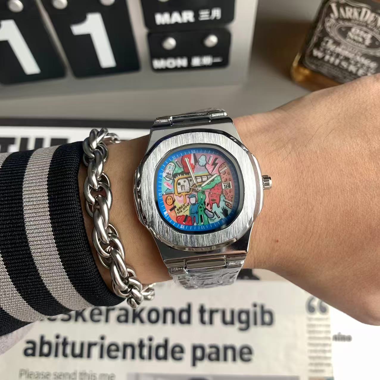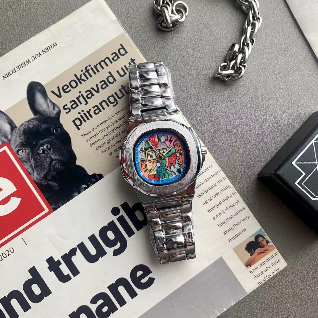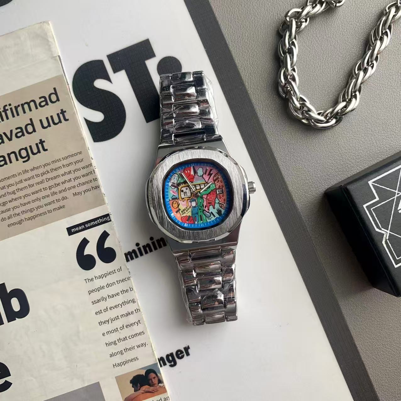 New Retro Square Graffiti Watch for Men, Two-Dimensional Comic Pixel ins High-End Niche Steel Band Quartz Watch