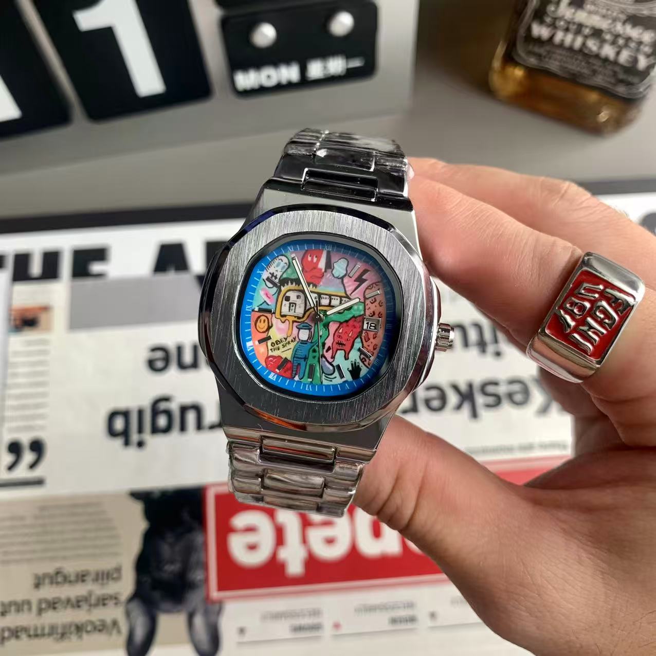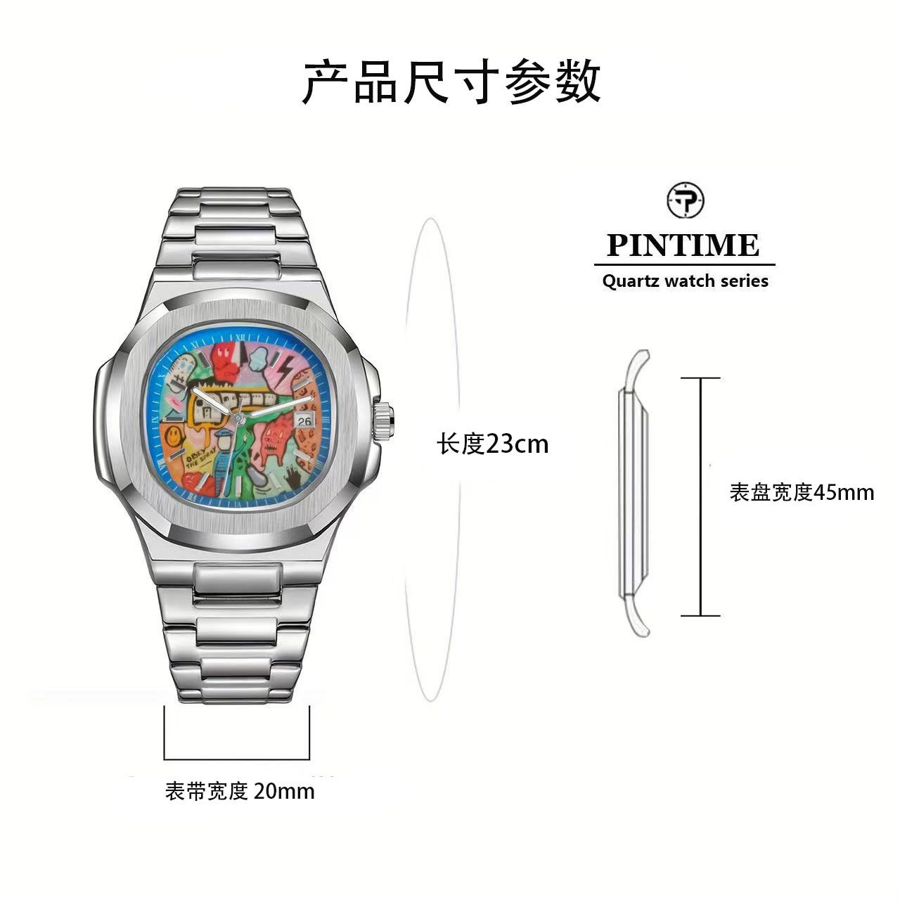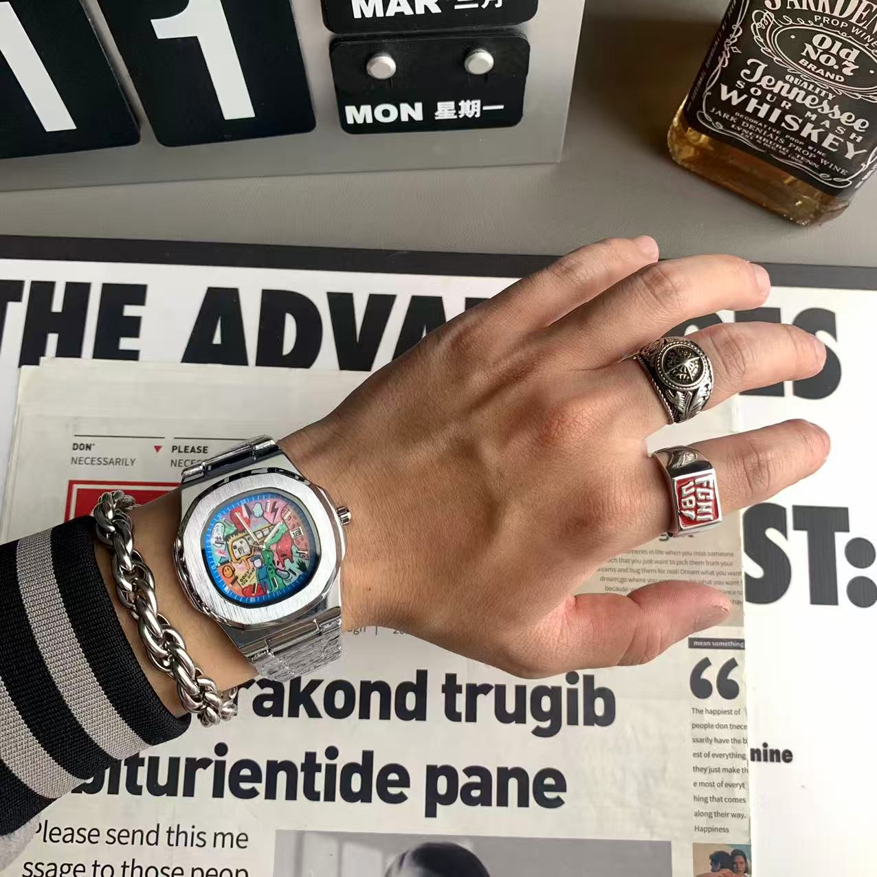 New Retro Square Graffiti Watch for Men, Two-Dimensional Comic Pixel ins High-End Niche Steel Band Quartz Watch