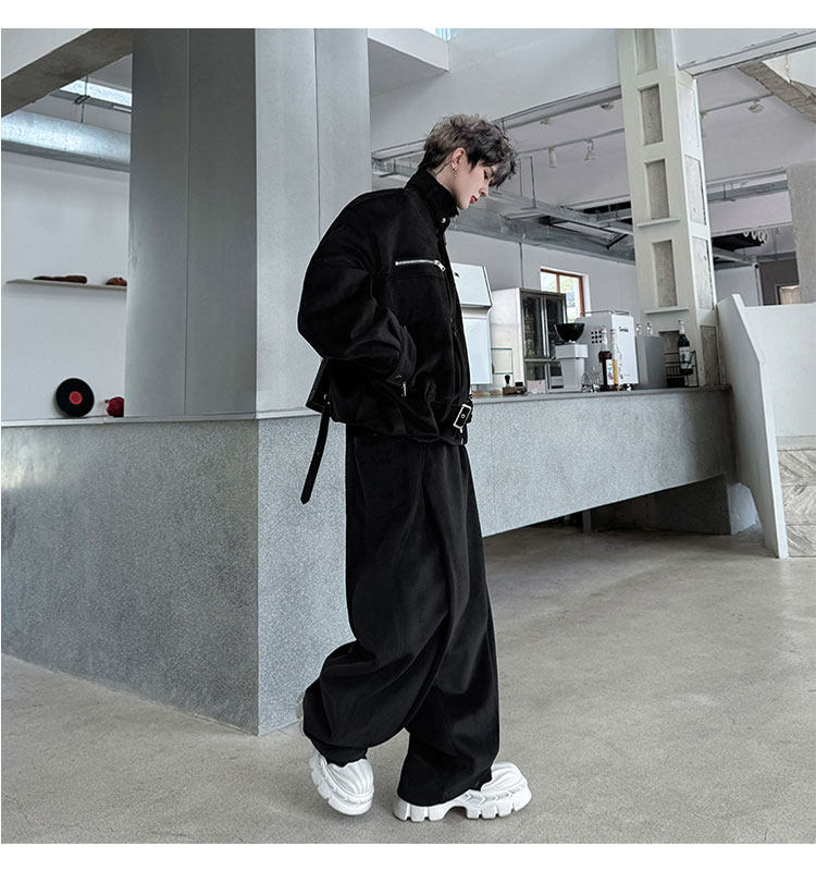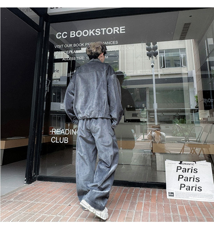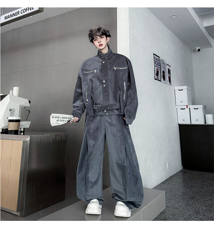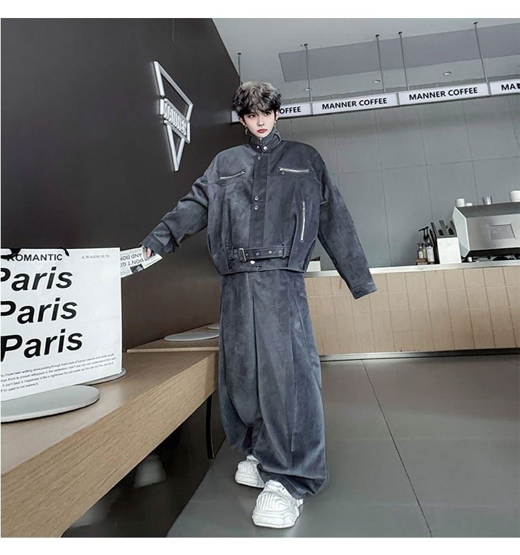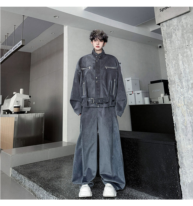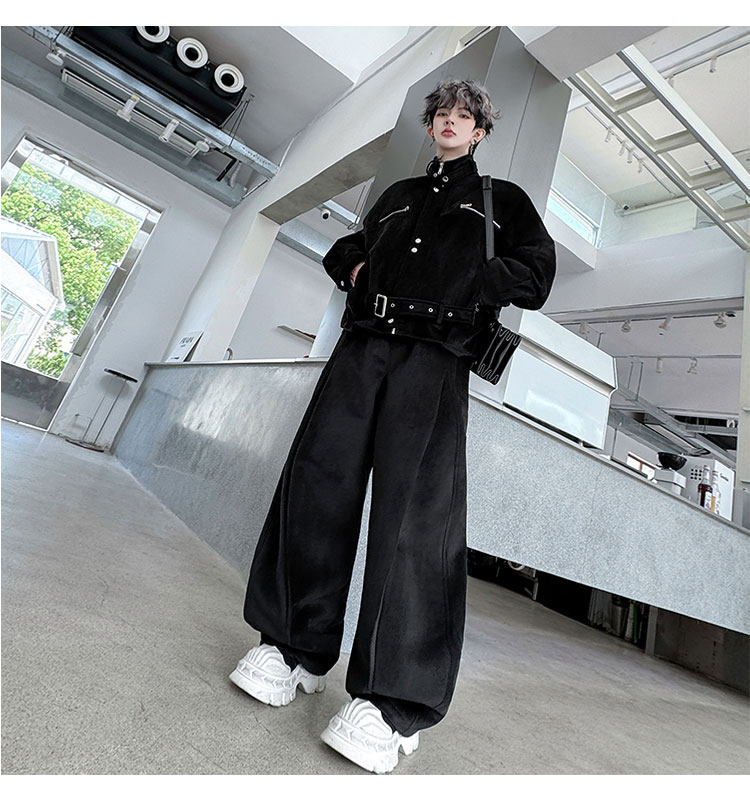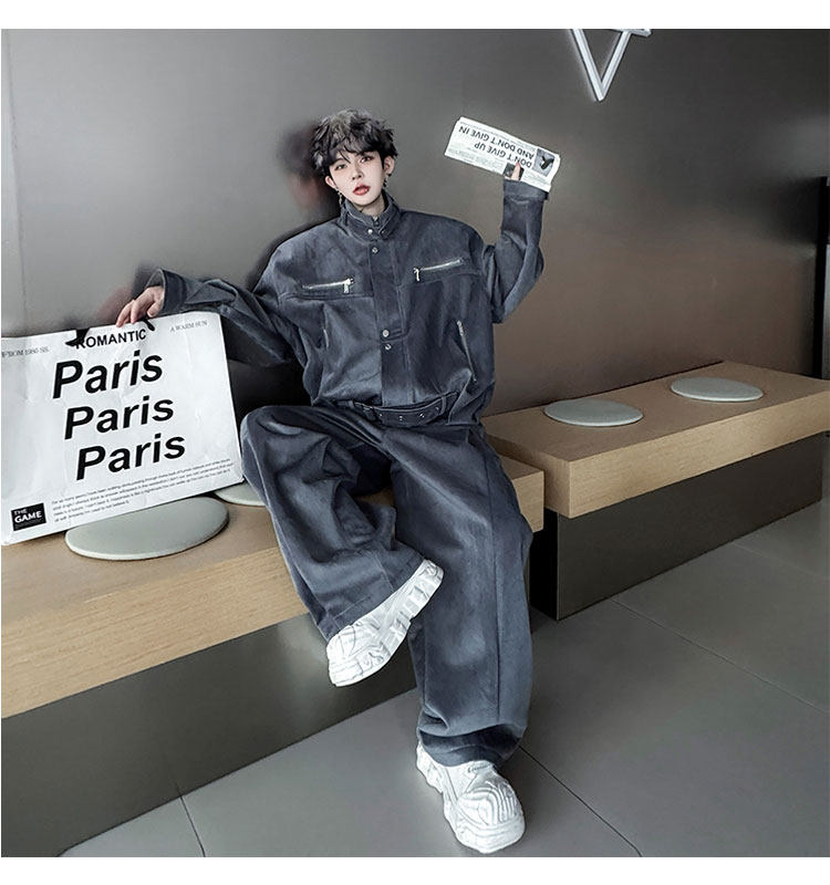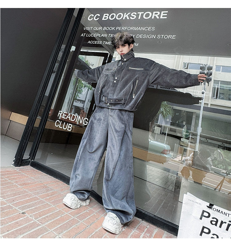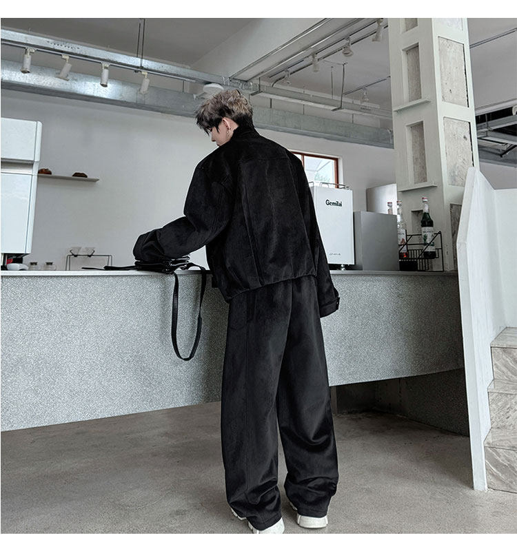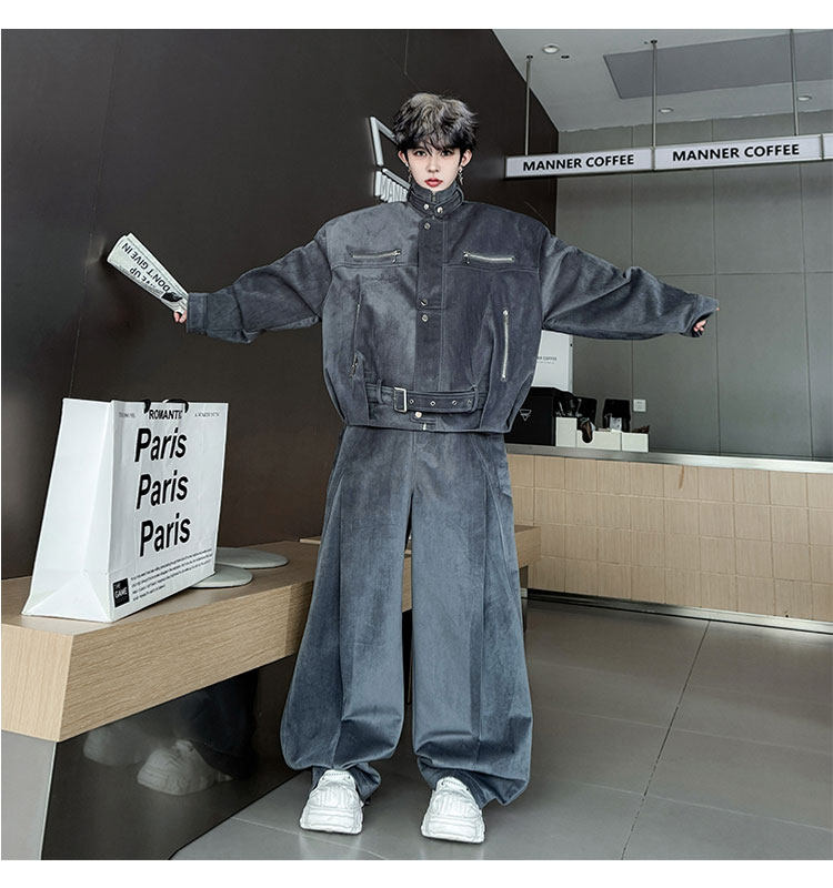 Winter American Retro Deconstructed Stand-Up Collar Zipper Jacket Set for Men, Stylish Wide-Leg Thickened Two-Piece Set