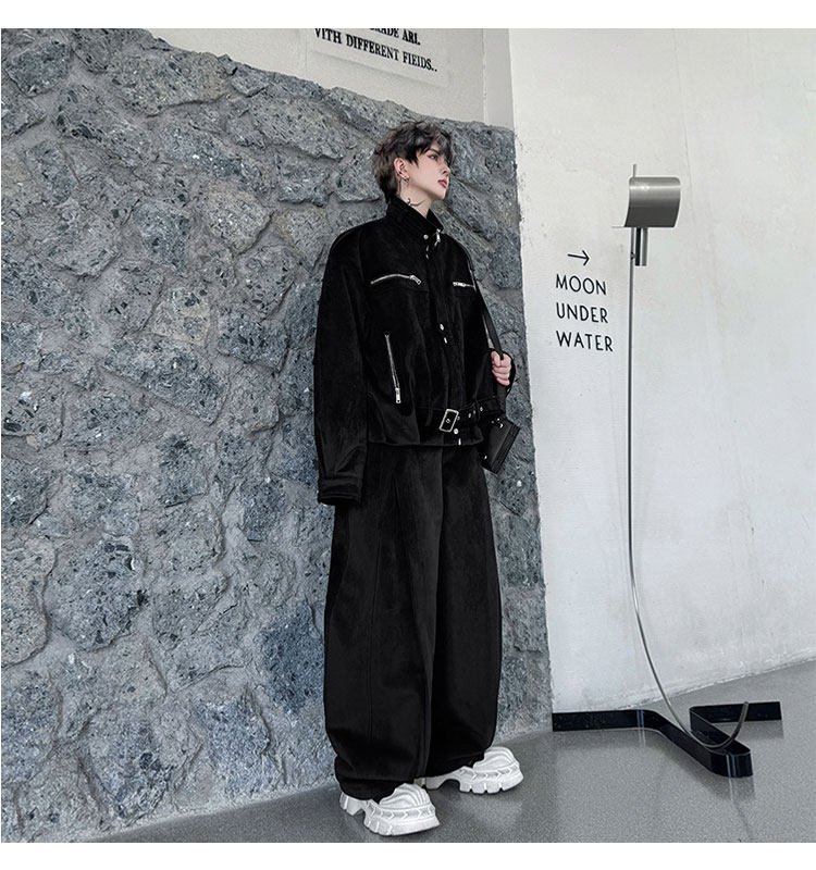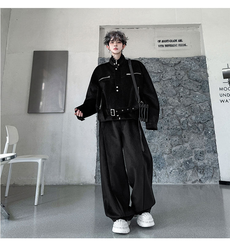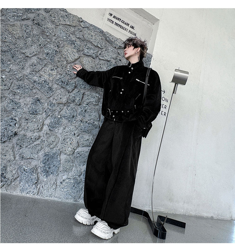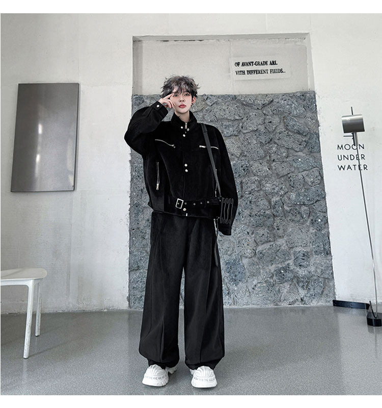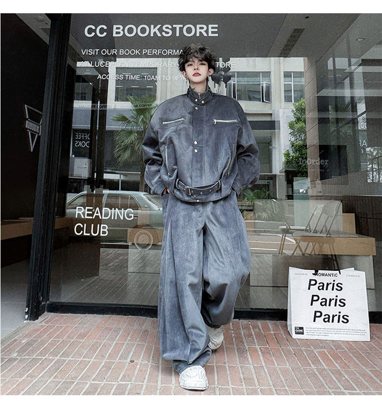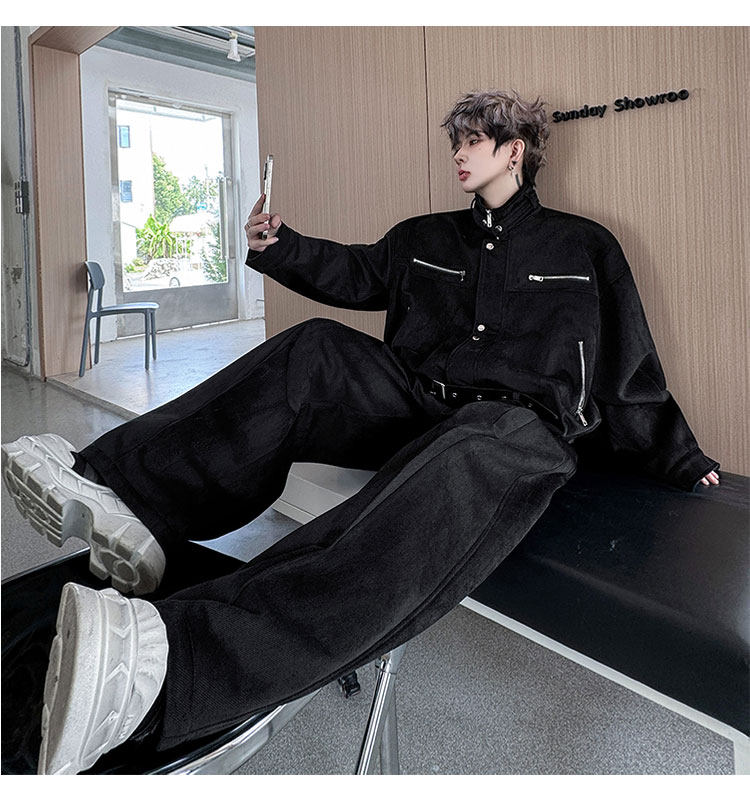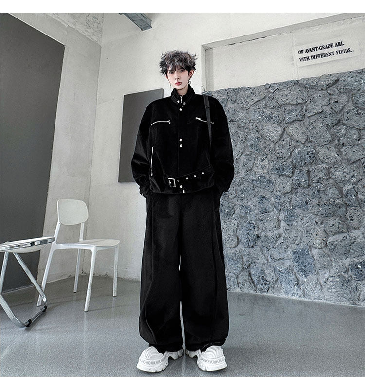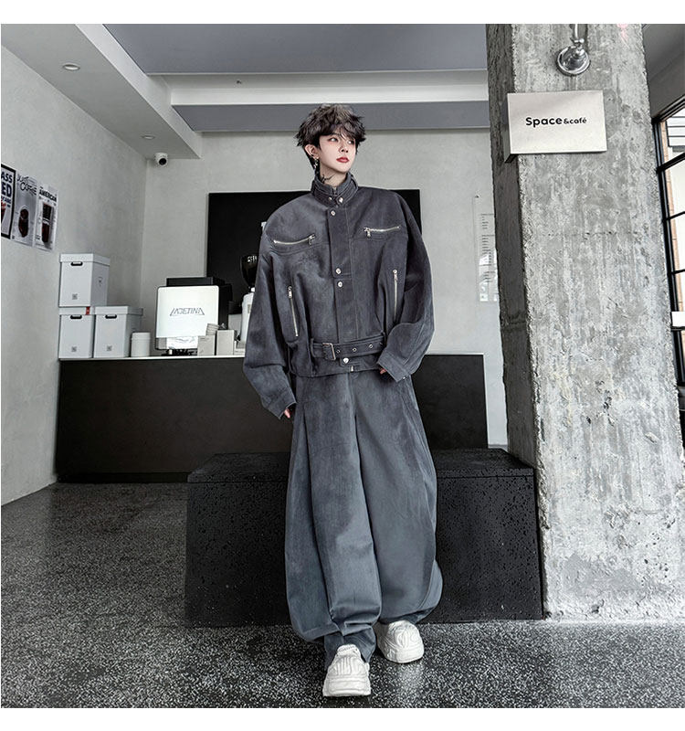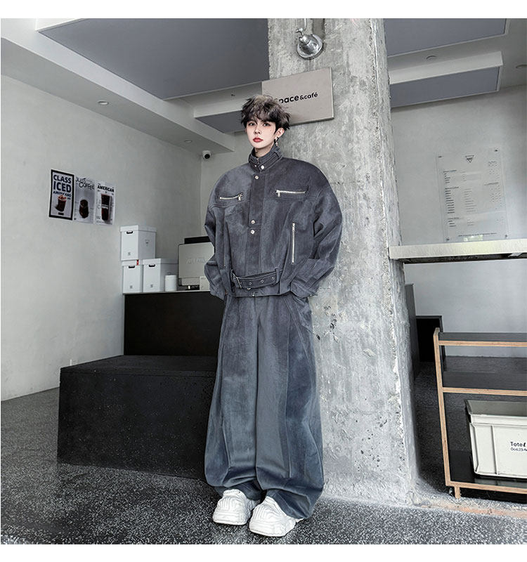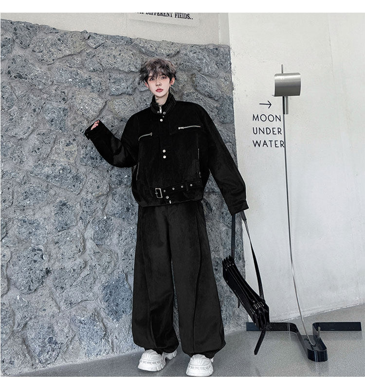 Winter American Retro Deconstructed Stand-Up Collar Zipper Jacket Set for Men, Stylish Wide-Leg Thickened Two-Piece Set