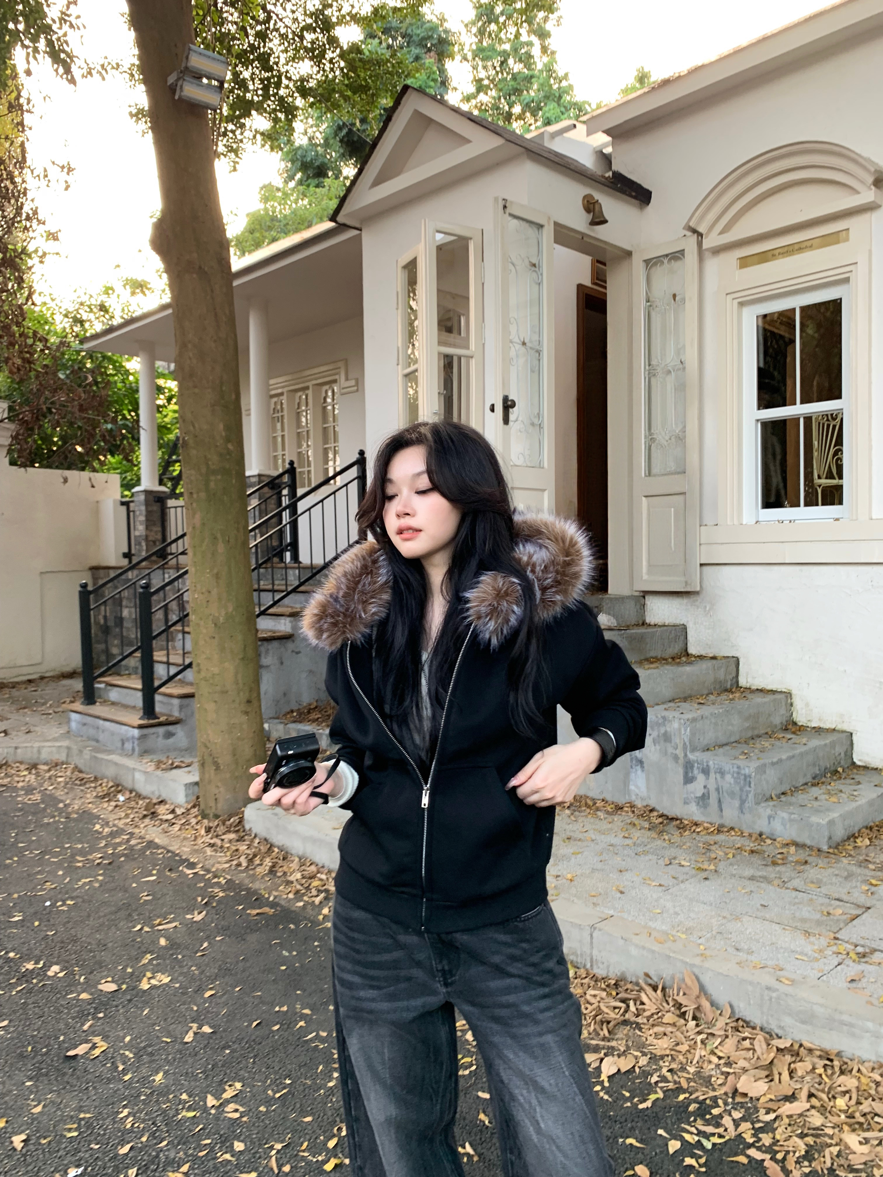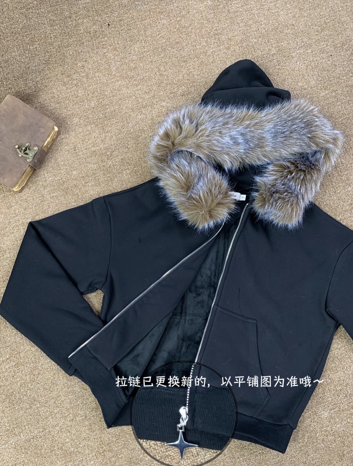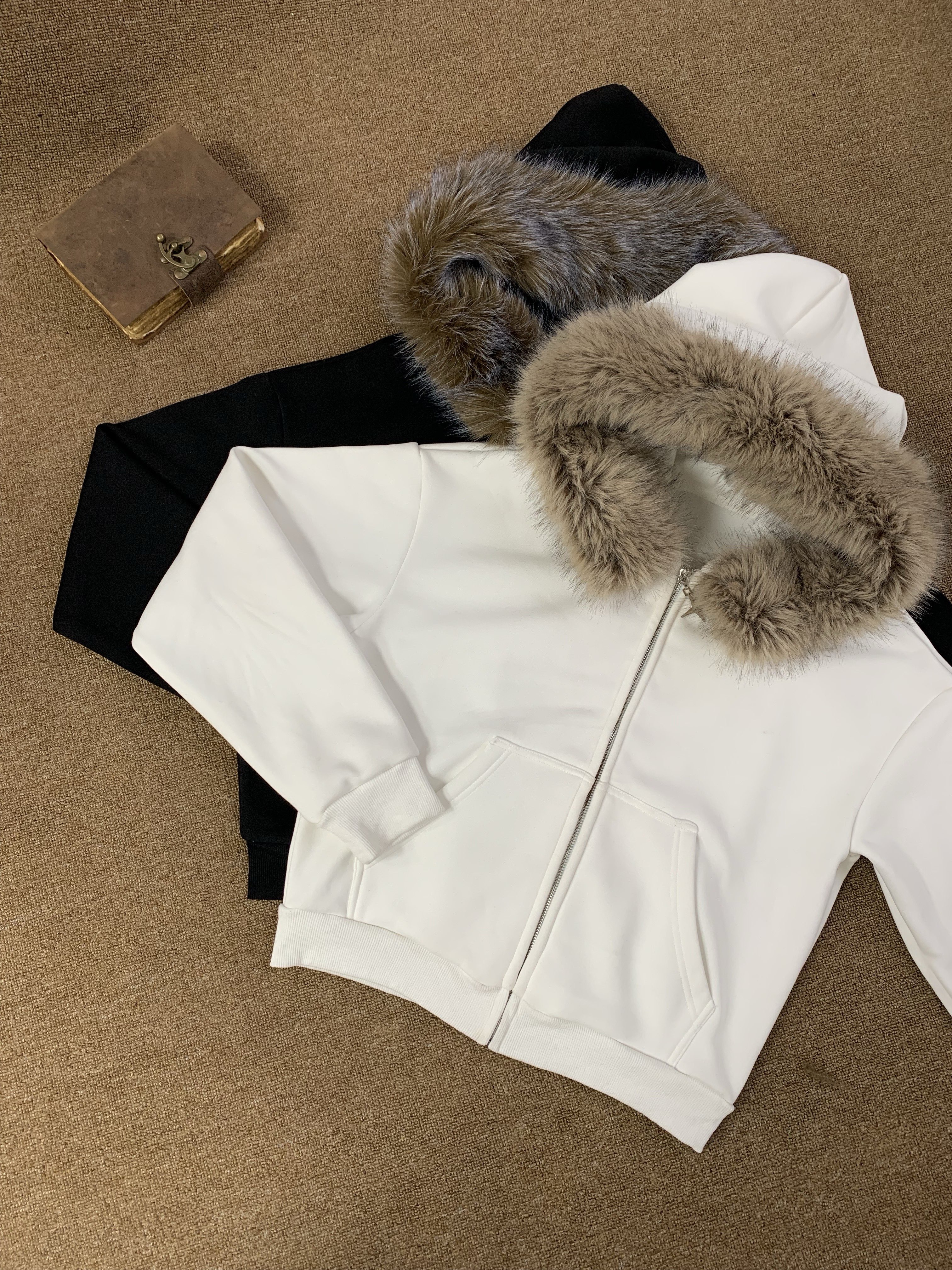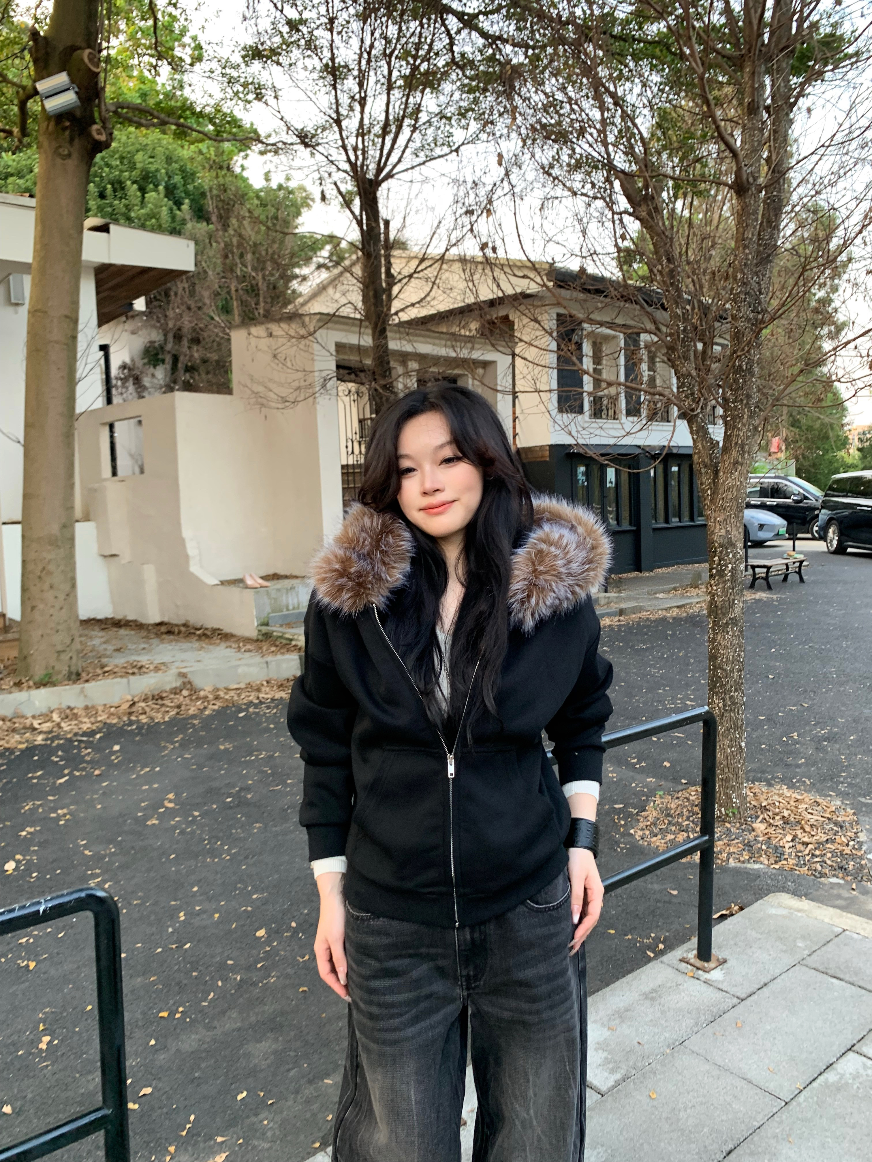 Popchee|Fleece Sweatshirt|Large Detachable Fur Collar! Two-Color Fur Collar Fleece Sweatshirt Jacket~