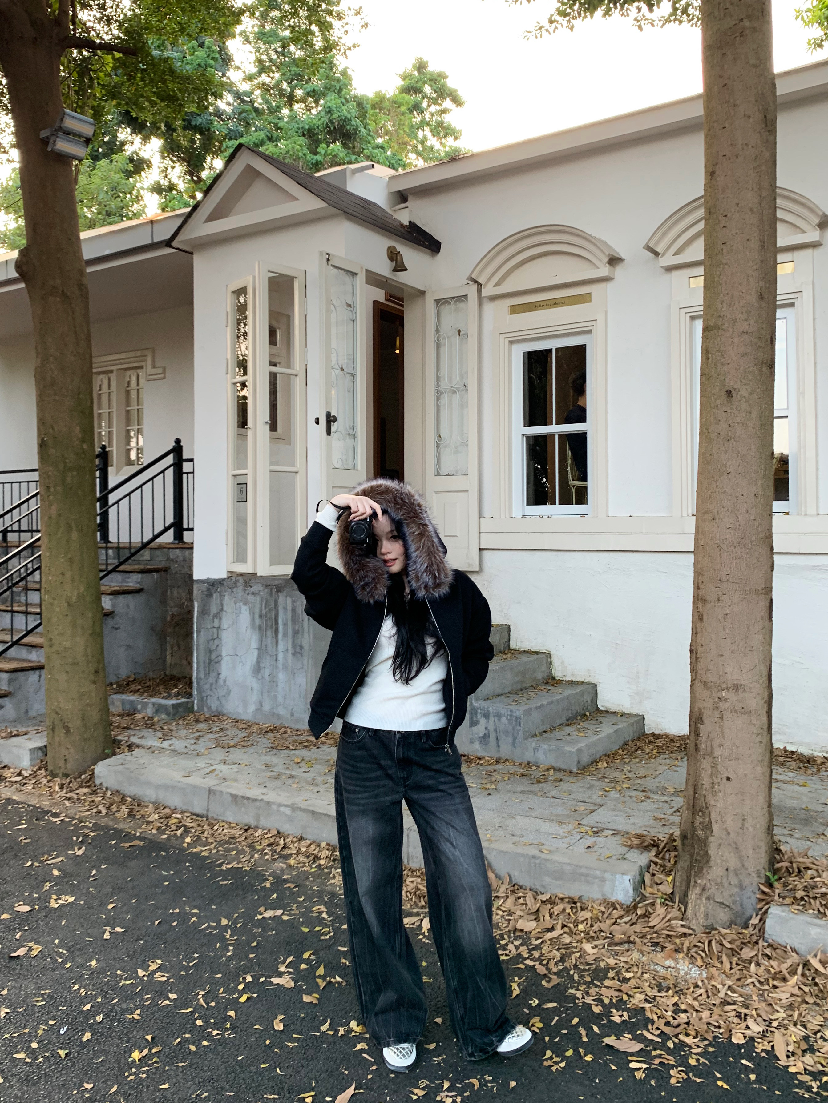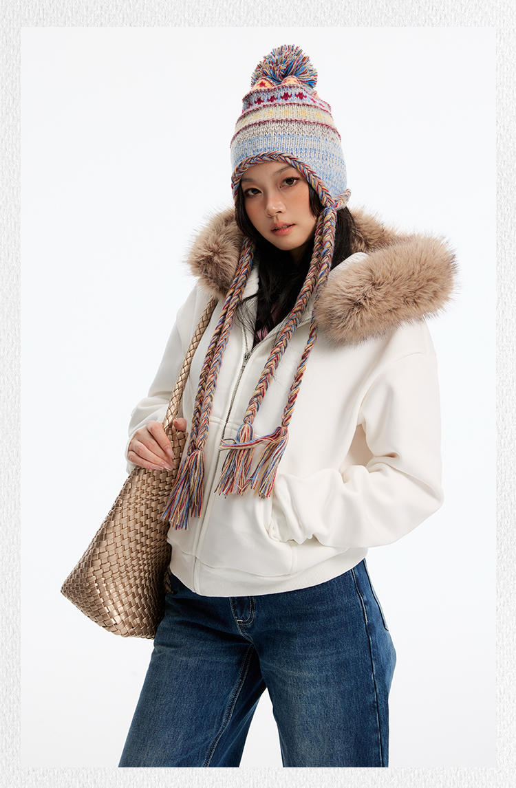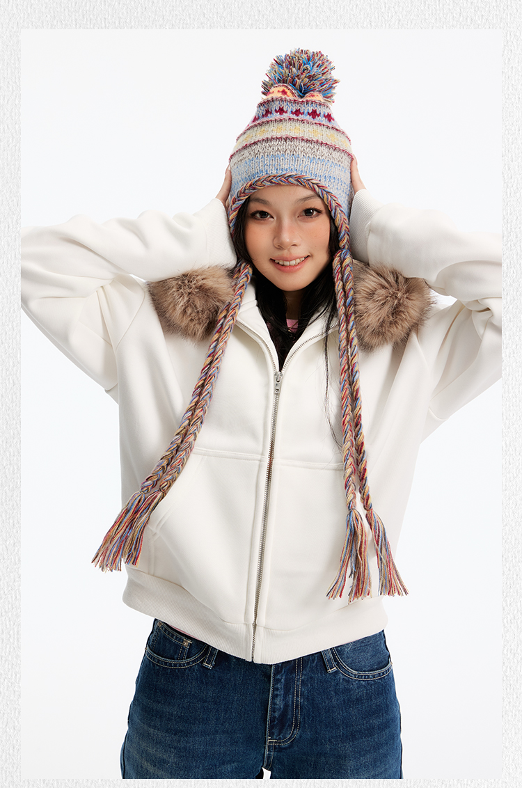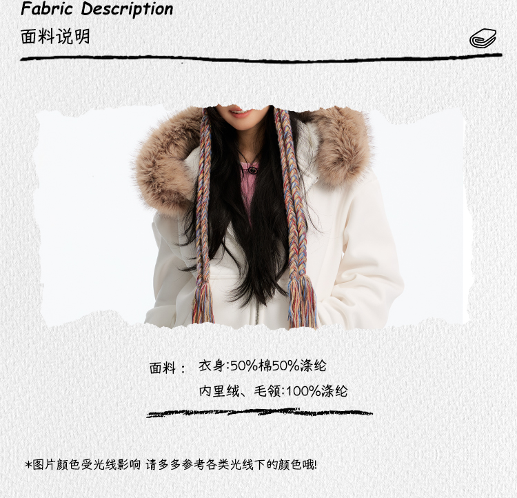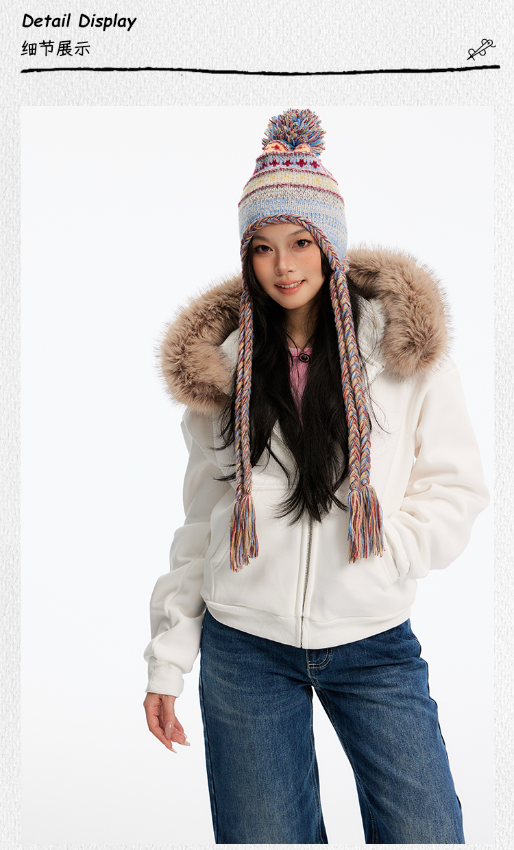 Popchee|Fleece Sweatshirt|Large Detachable Fur Collar! Two-Color Fur Collar Fleece Sweatshirt Jacket~