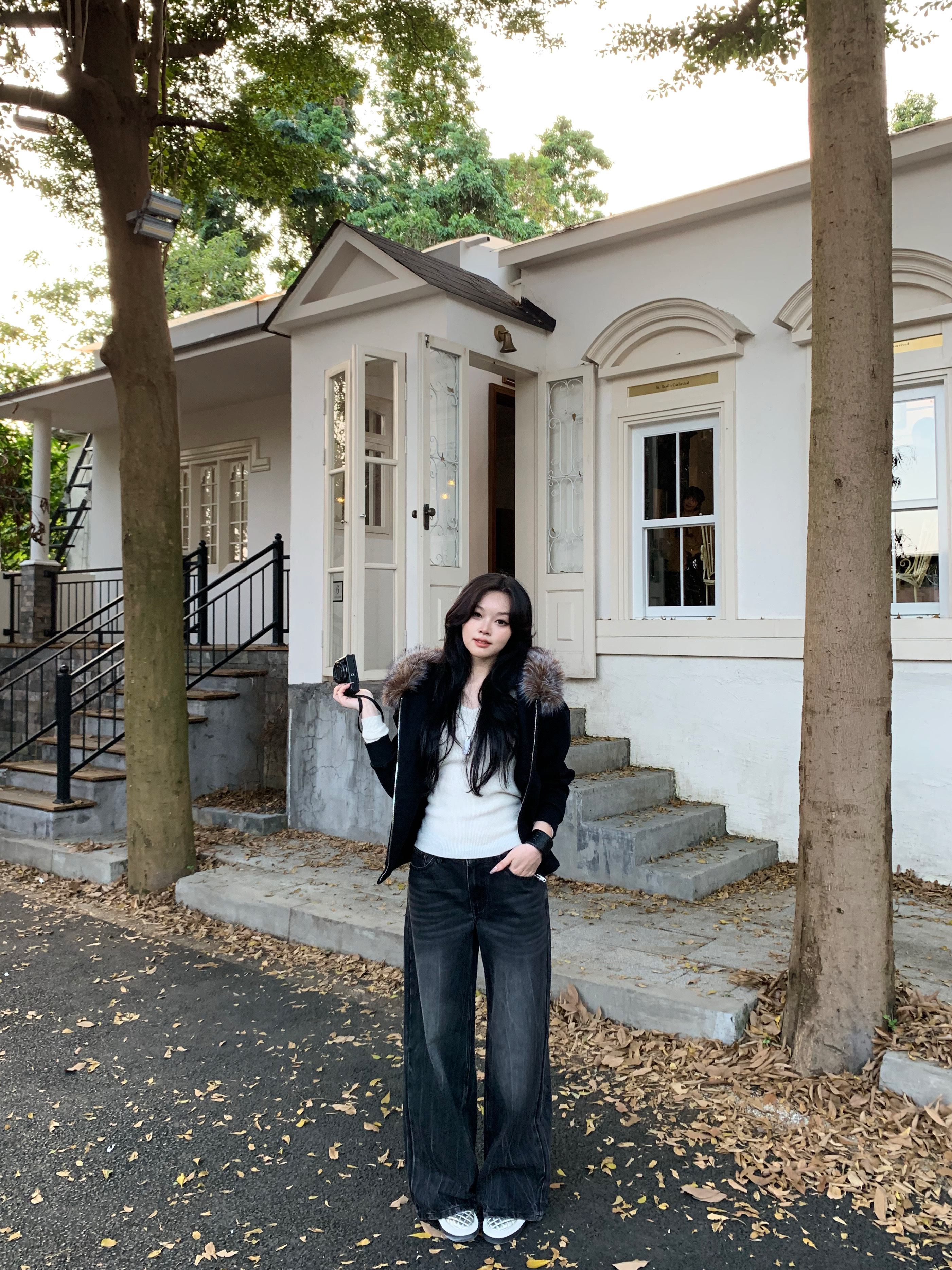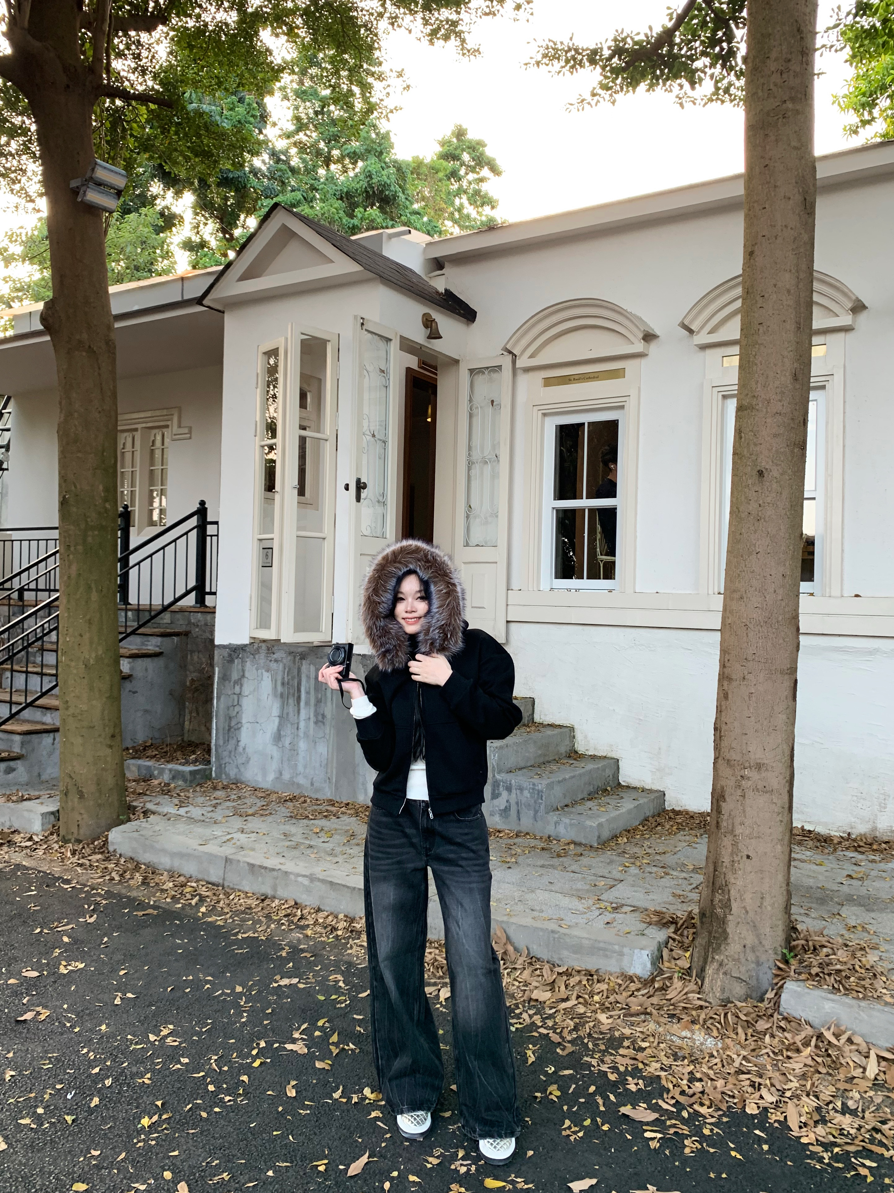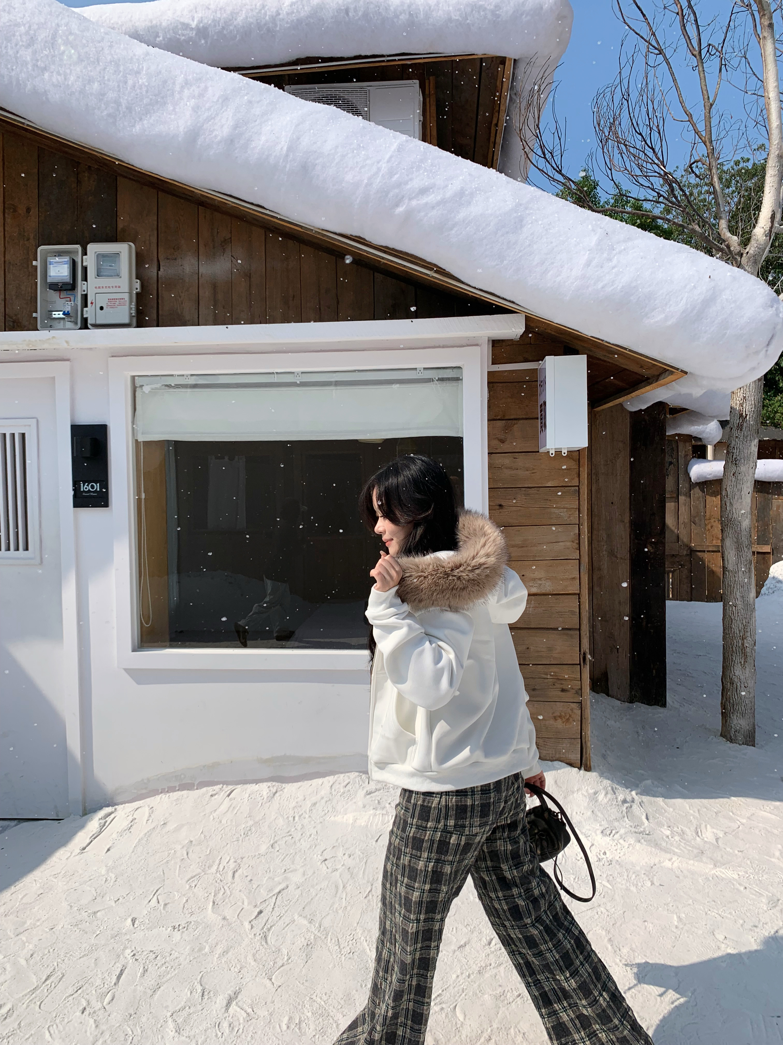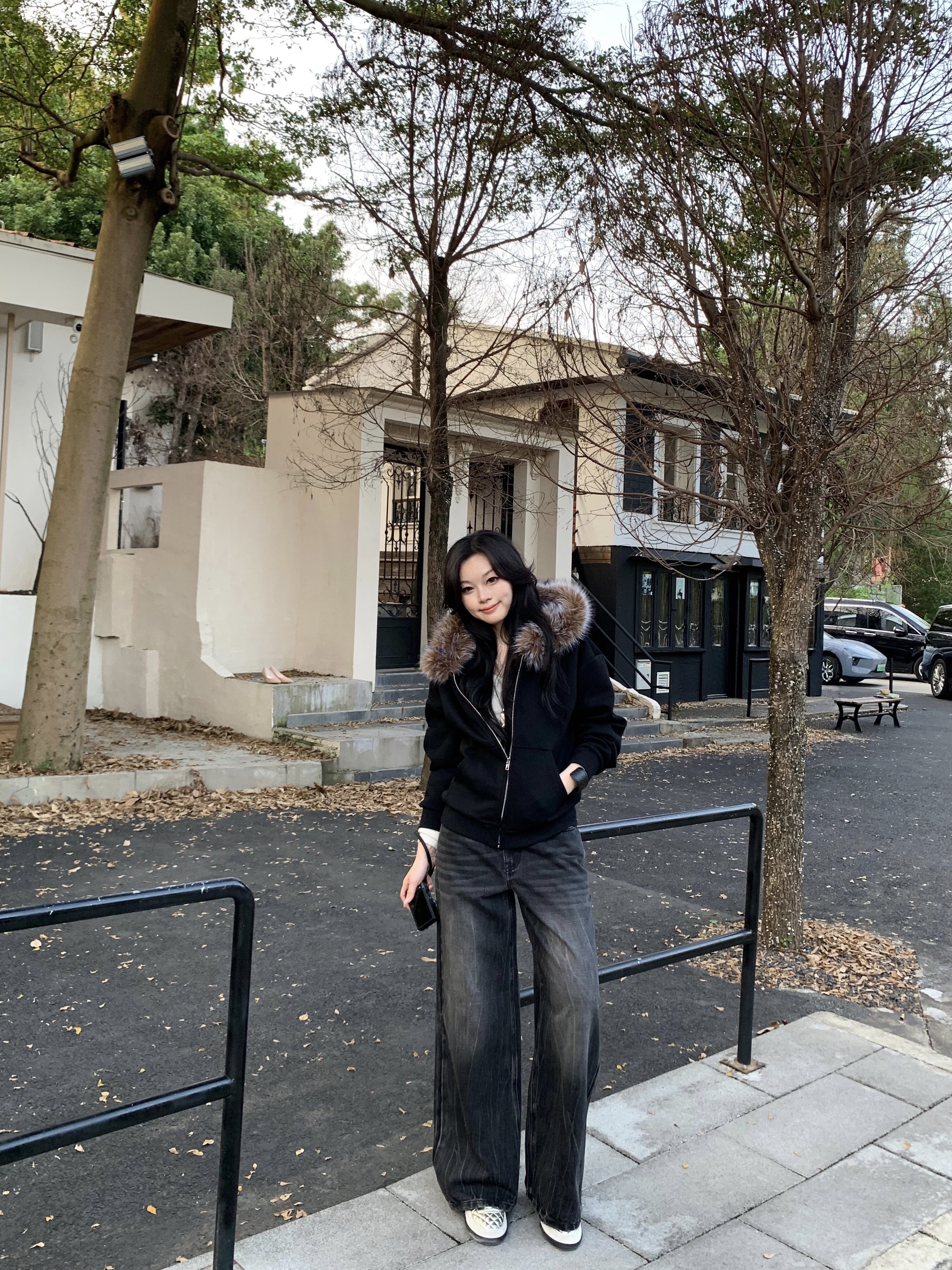Popchee|Fleece Sweatshirt|Large Detachable Fur Collar! Two-Color Fur Collar Fleece Sweatshirt Jacket~