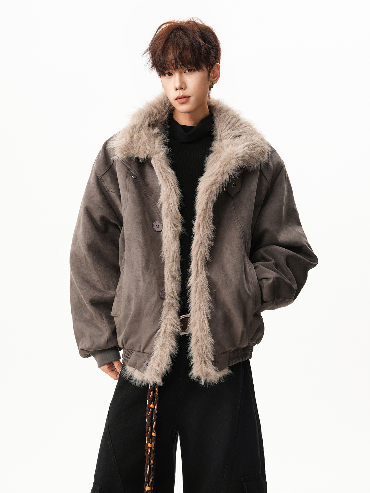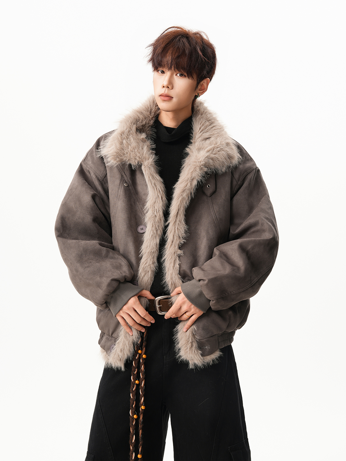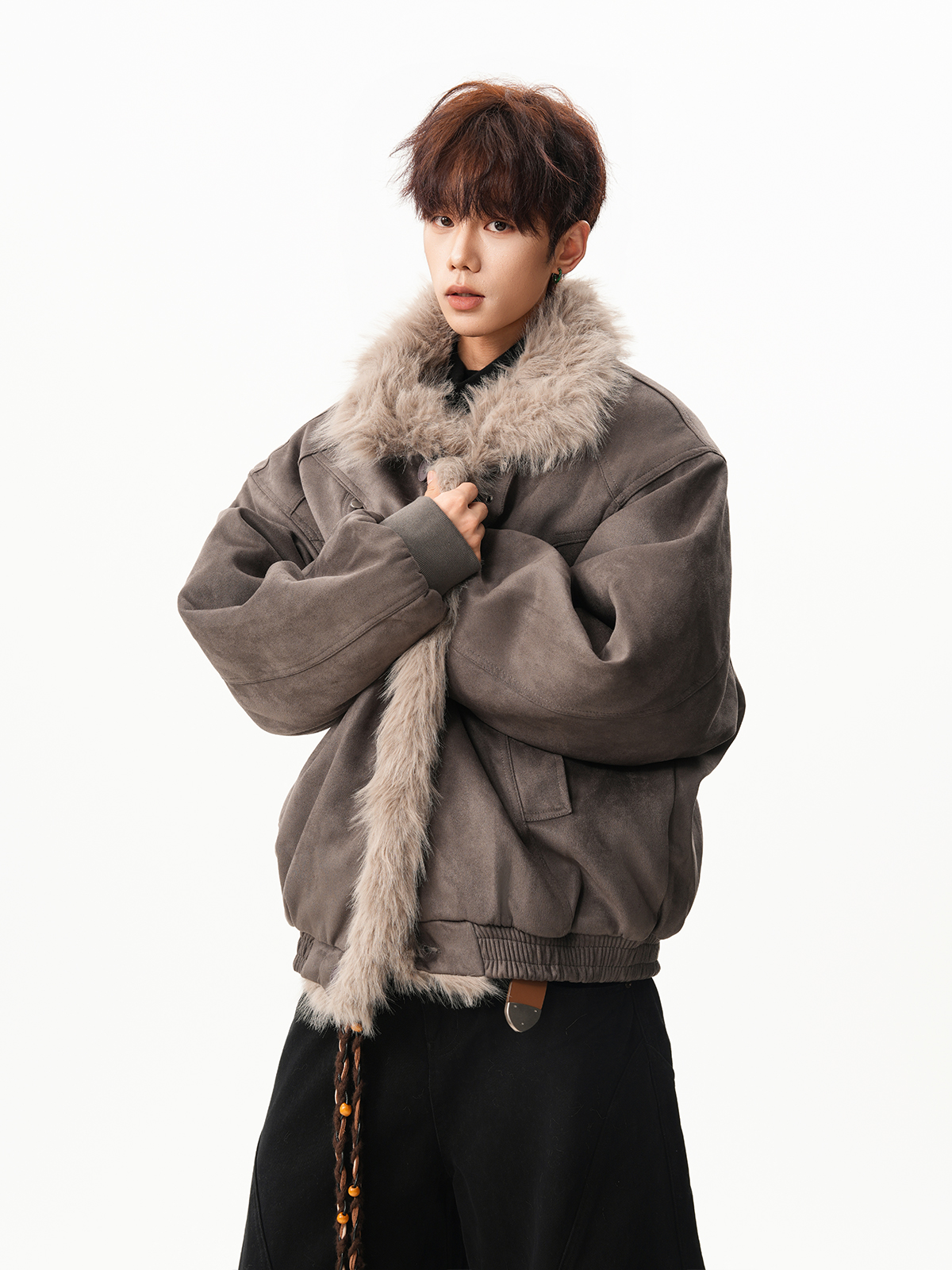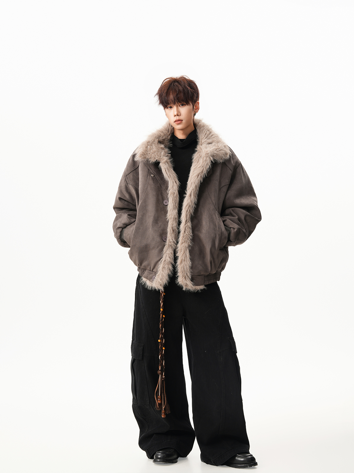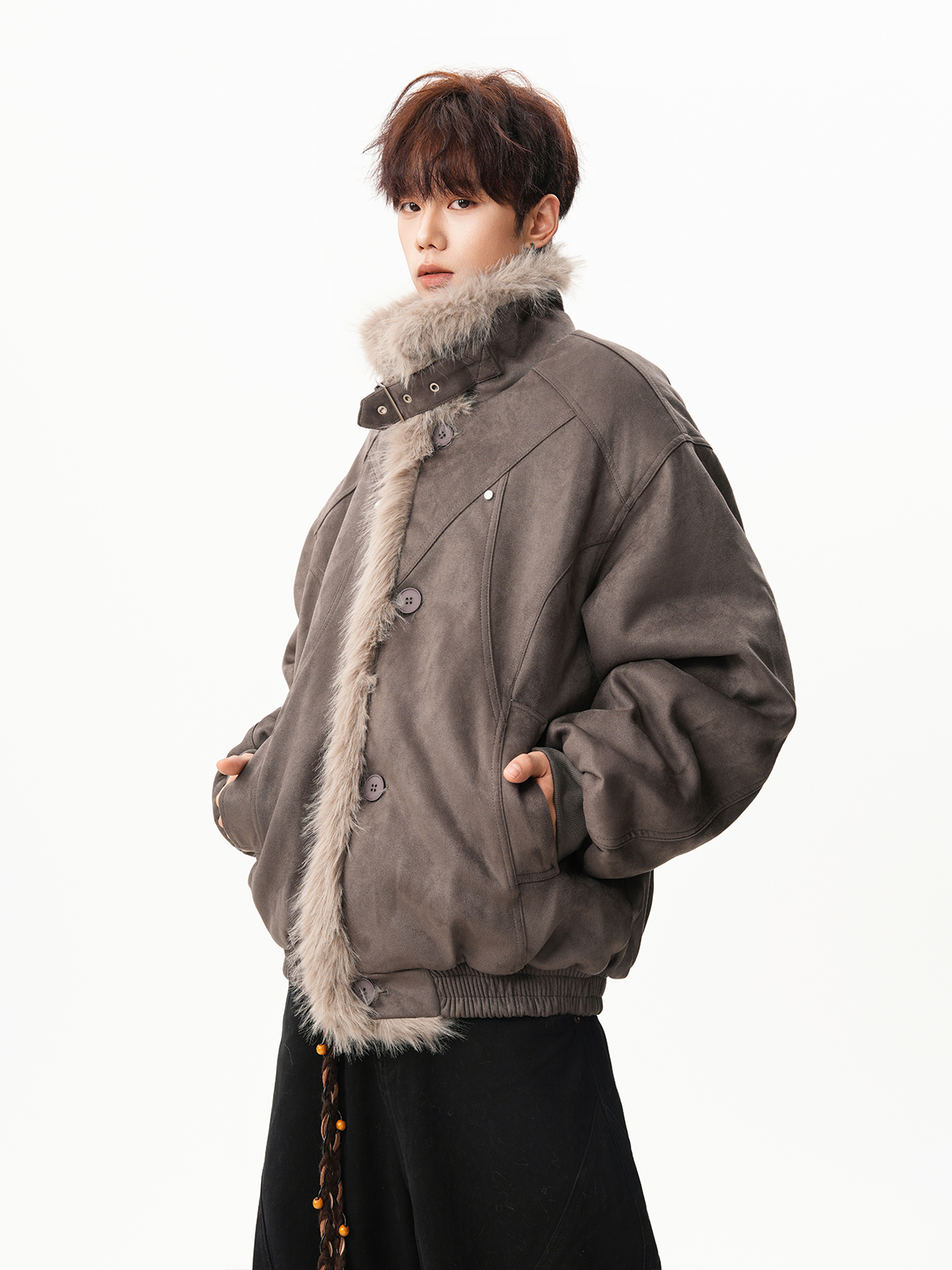 Vintage Distressed Mountain Carving Deconstructed Fur Collar Cotton Jacket for Men and Women, Winter High-End Warm Thickened Couple's Cotton Coat