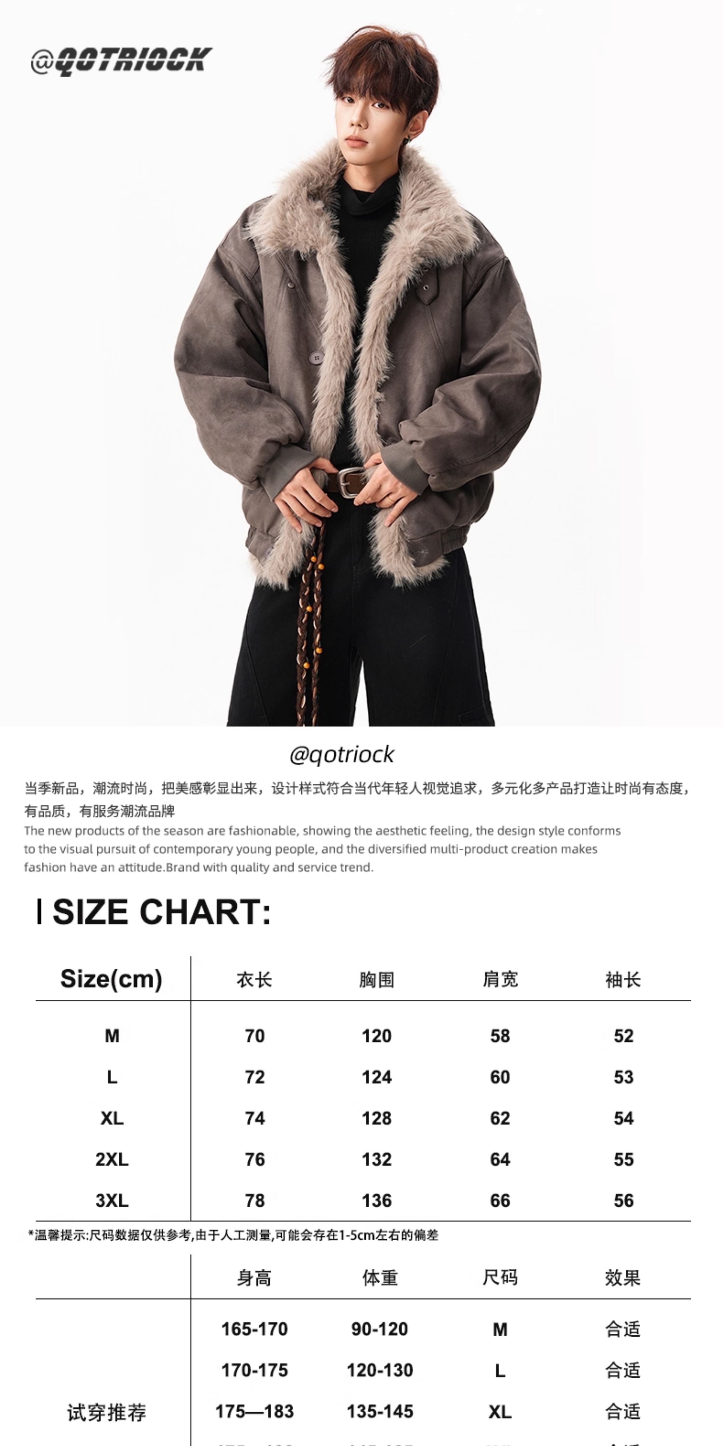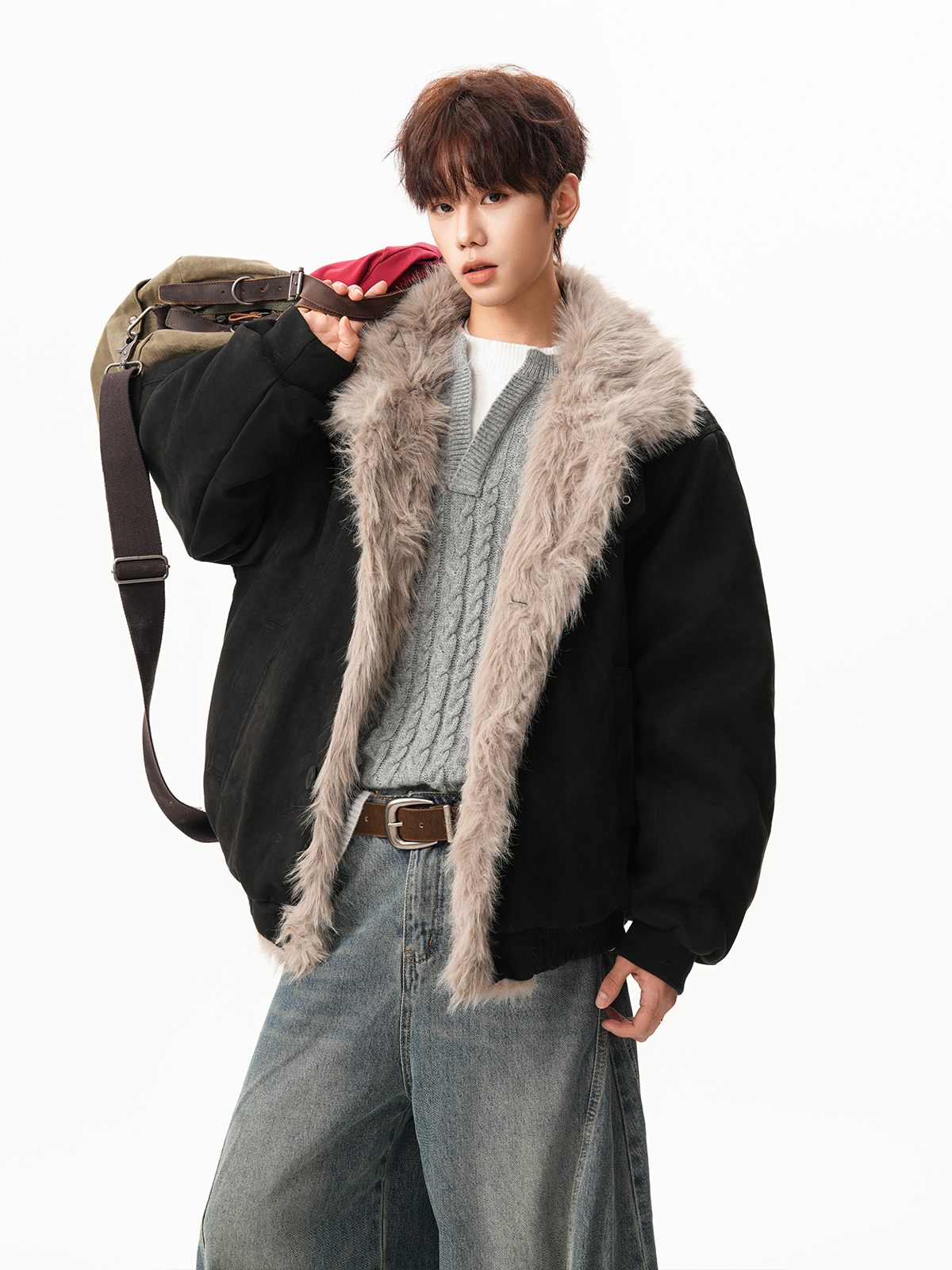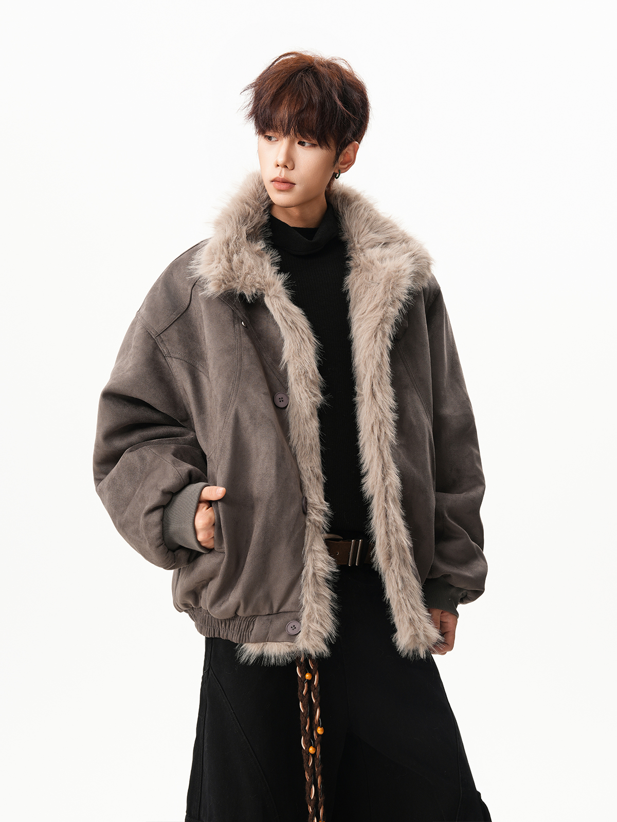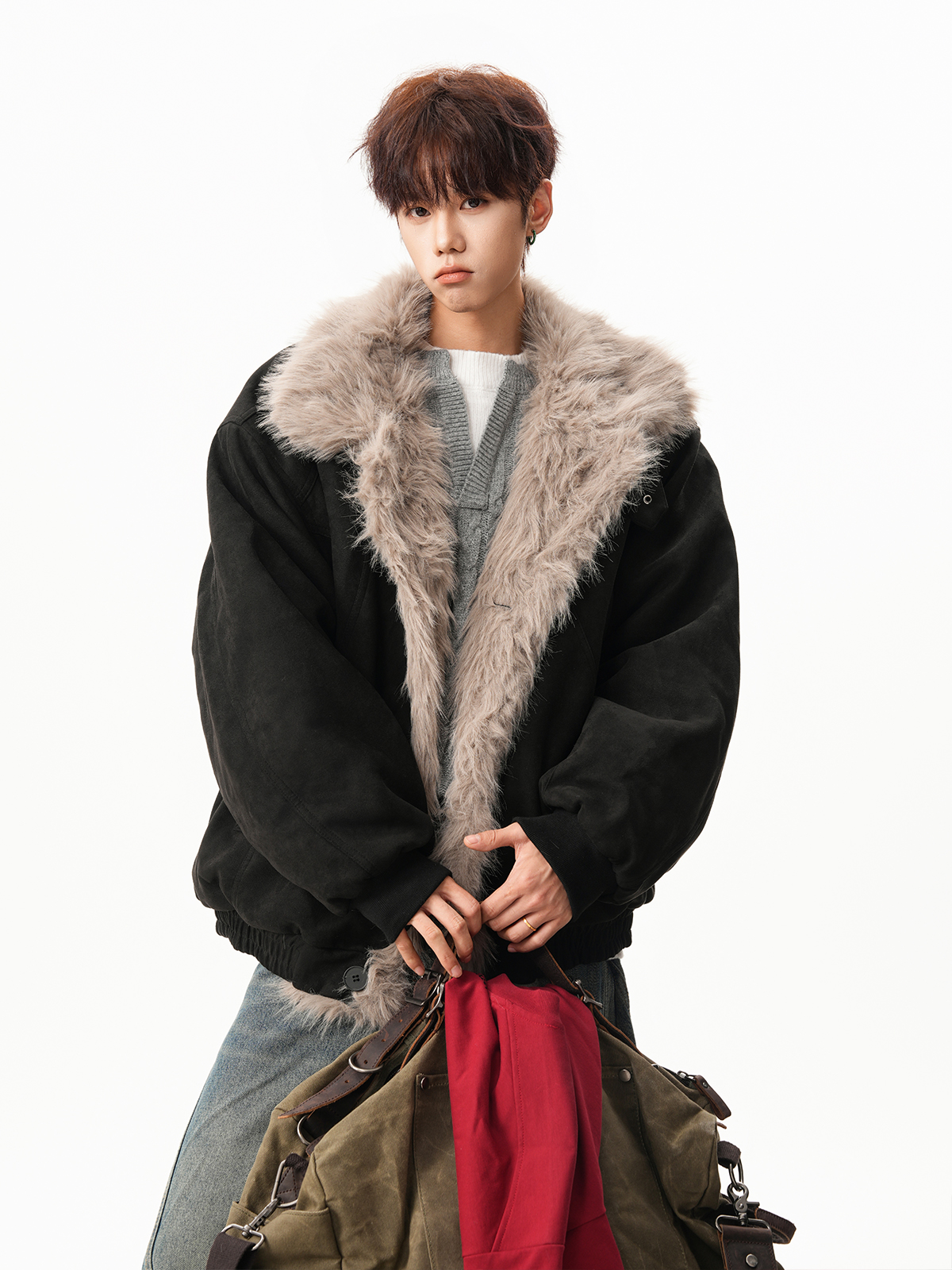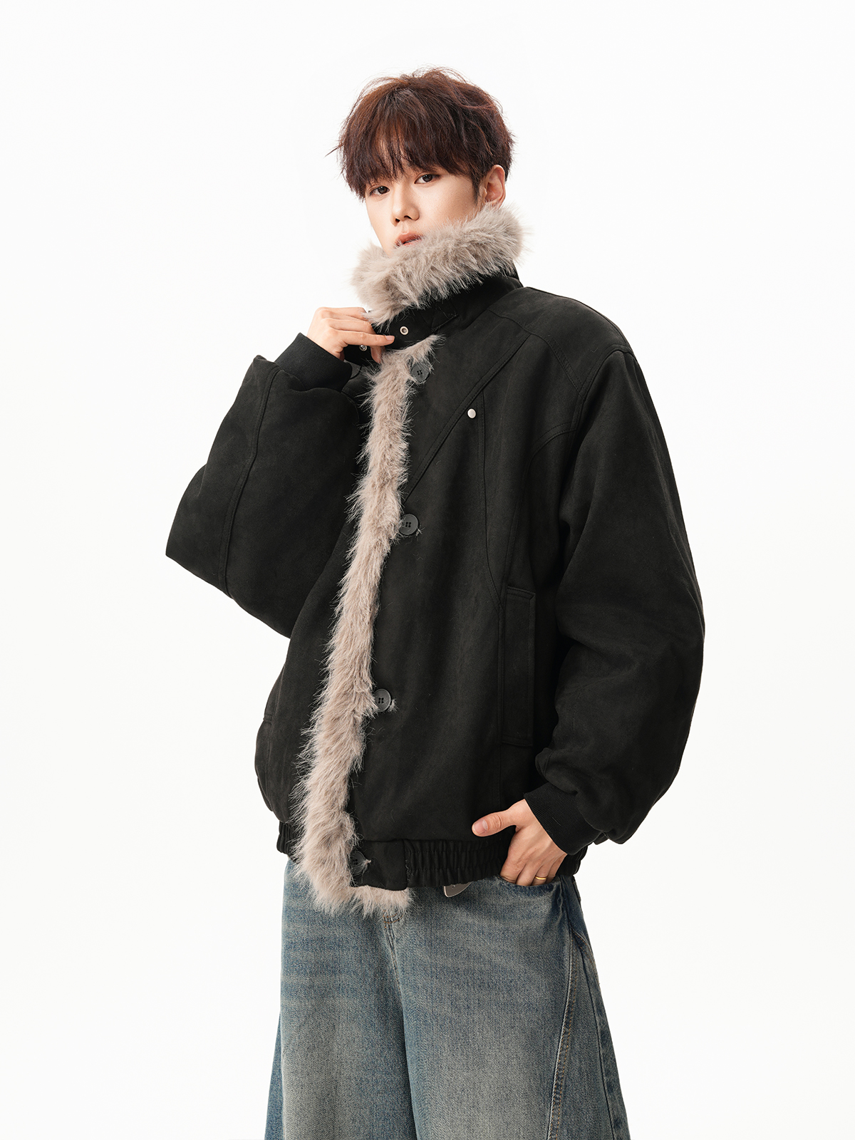 Vintage Distressed Mountain Carving Deconstructed Fur Collar Cotton Jacket for Men and Women, Winter High-End Warm Thickened Couple's Cotton Coat