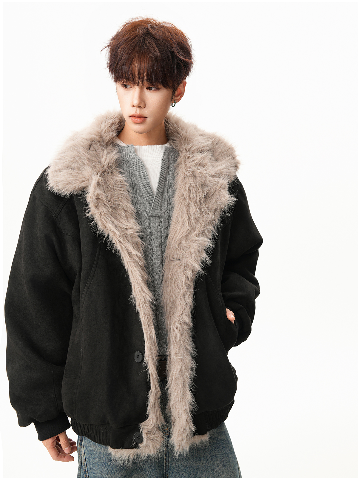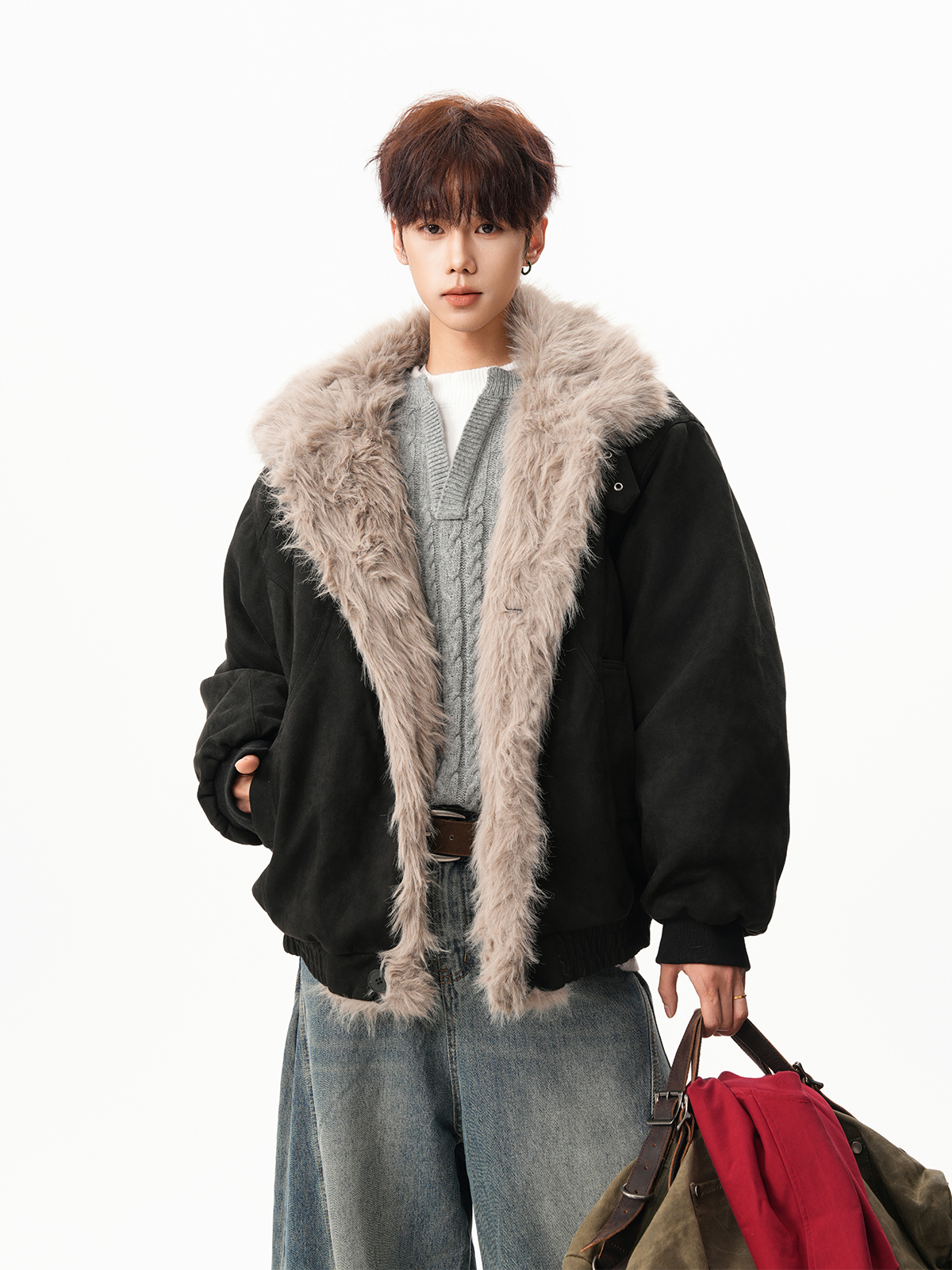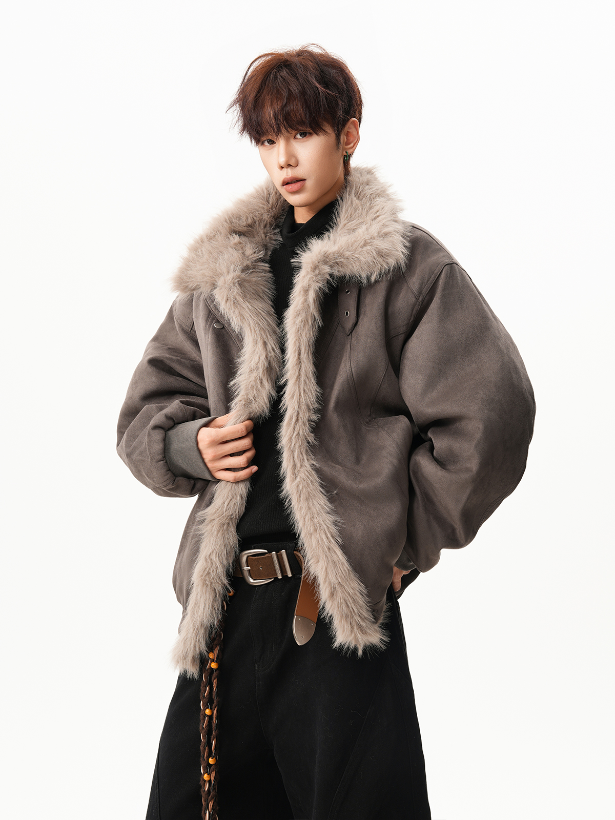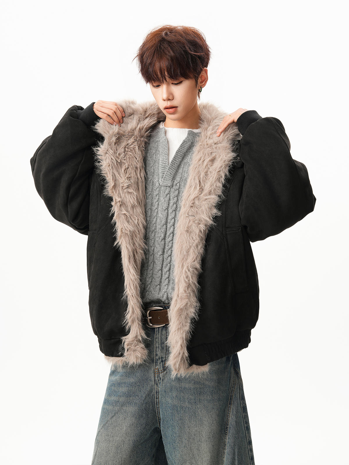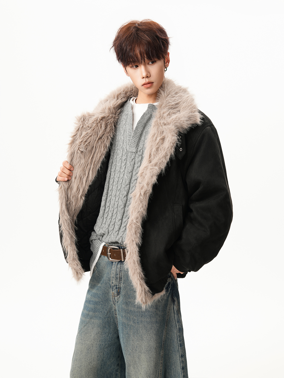 Vintage Distressed Mountain Carving Deconstructed Fur Collar Cotton Jacket for Men and Women, Winter High-End Warm Thickened Couple's Cotton Coat