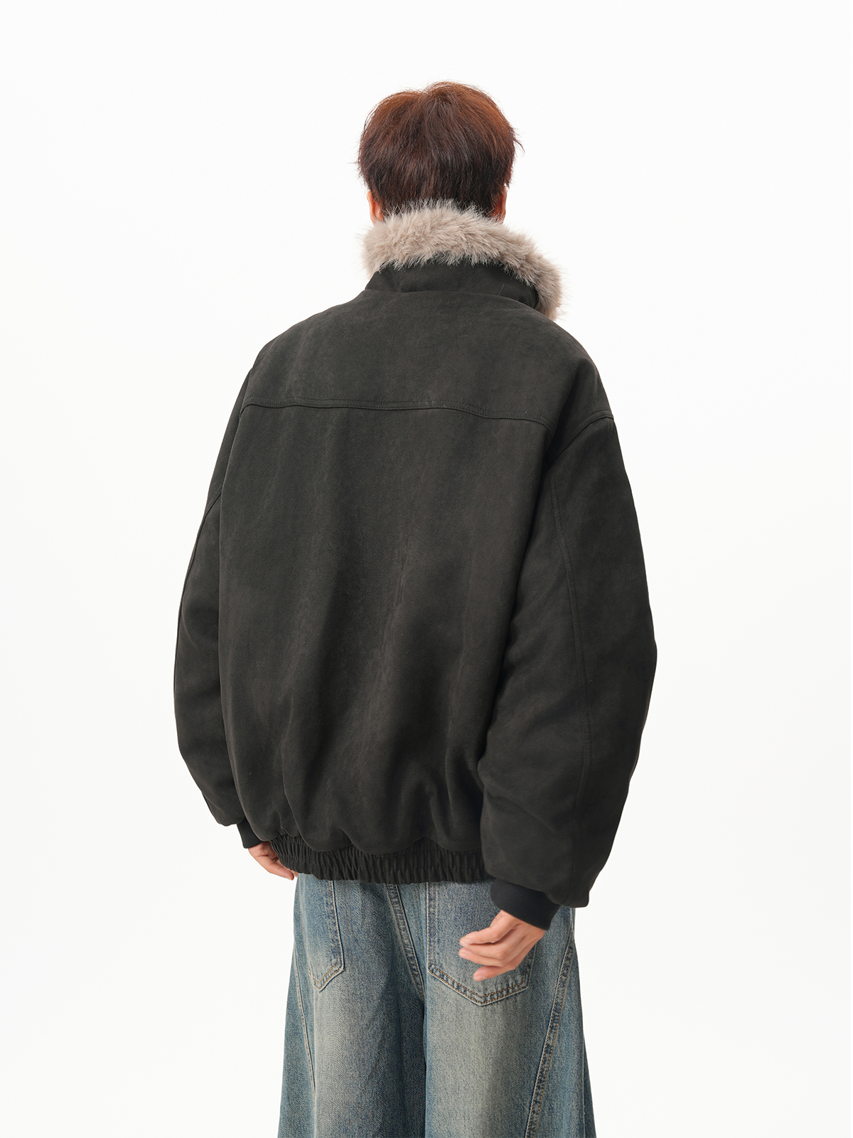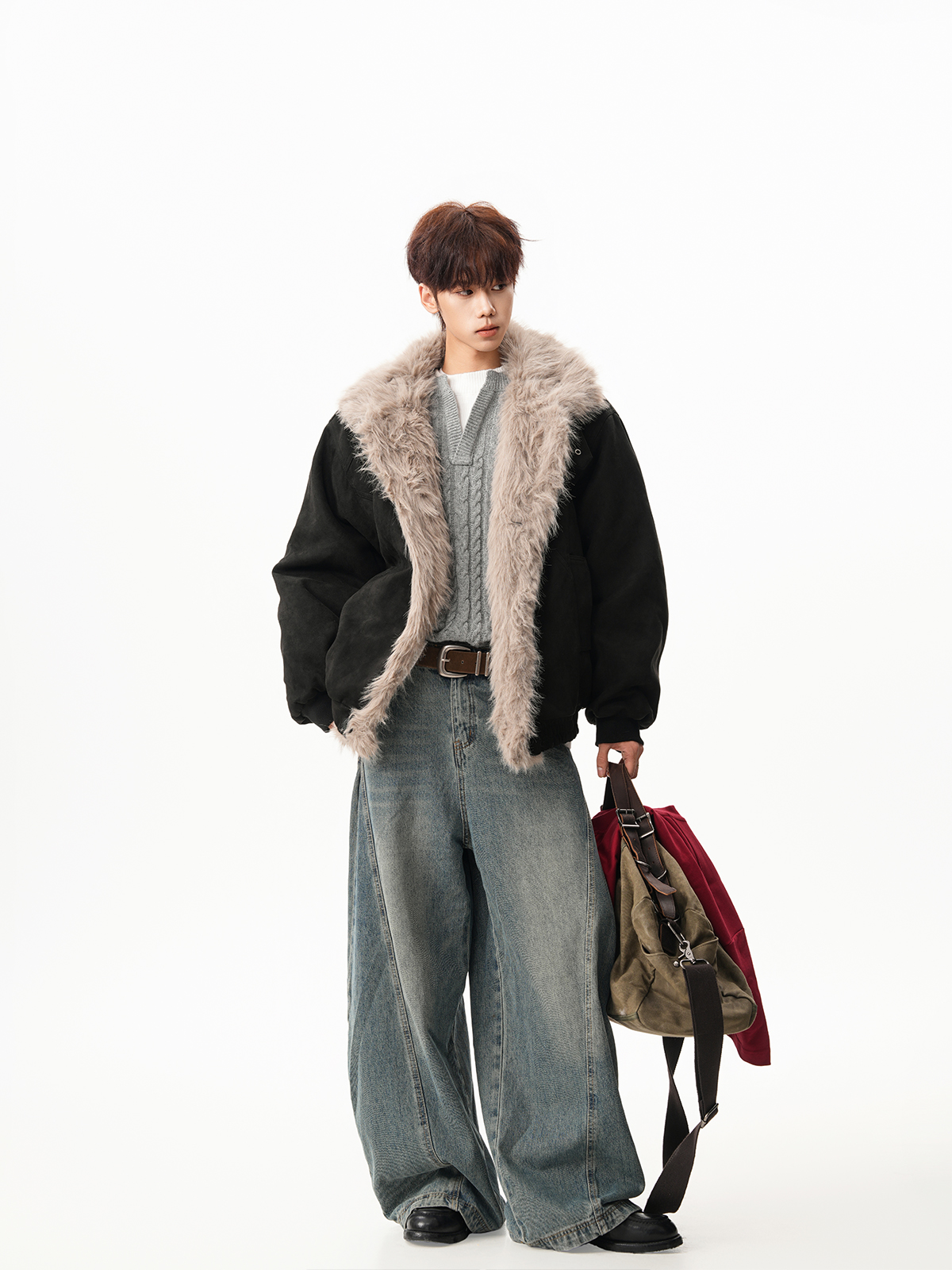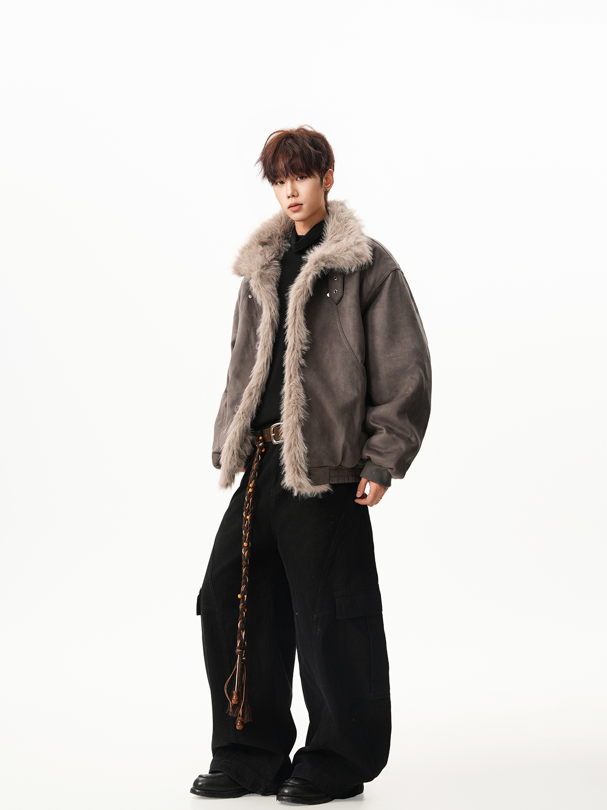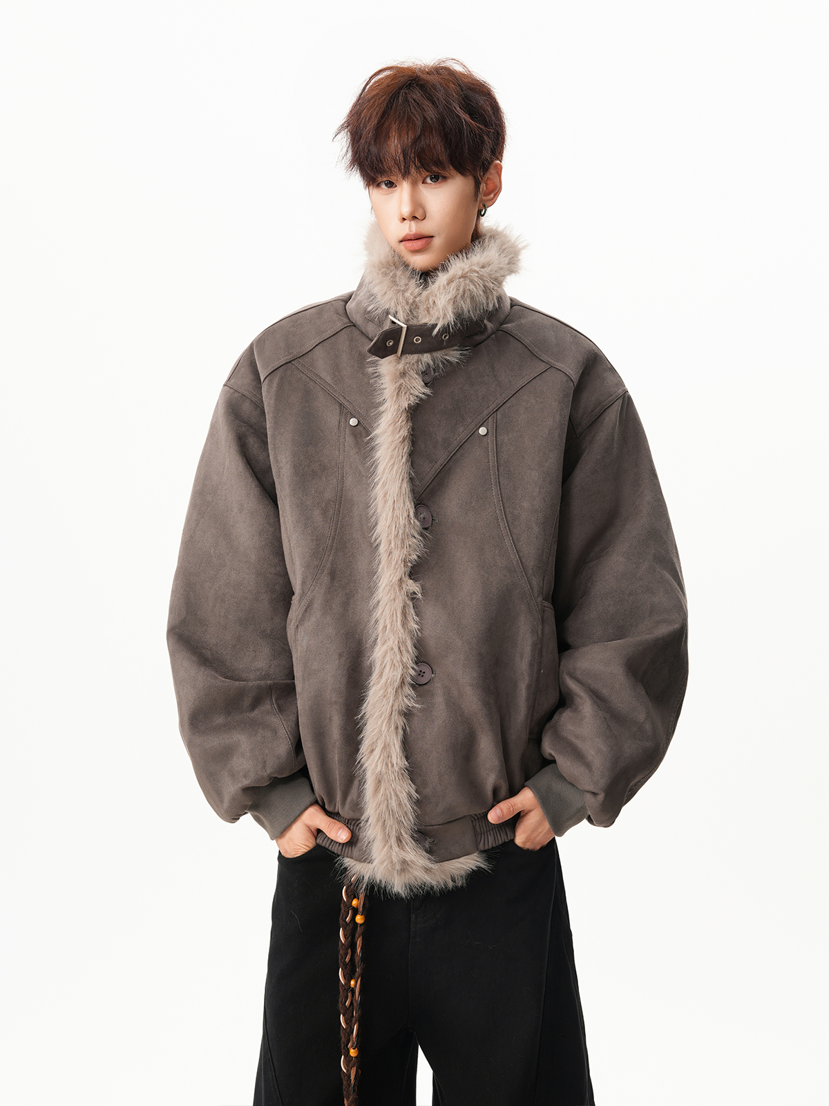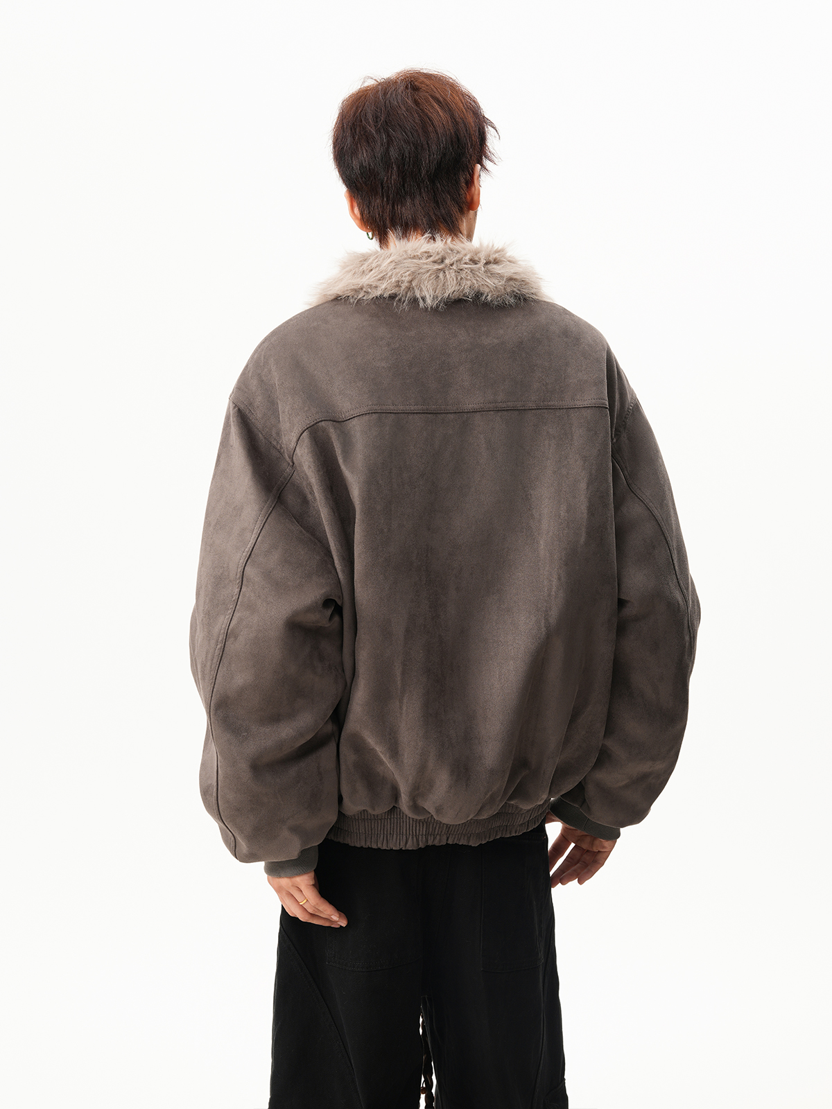 Vintage Distressed Mountain Carving Deconstructed Fur Collar Cotton Jacket for Men and Women, Winter High-End Warm Thickened Couple's Cotton Coat