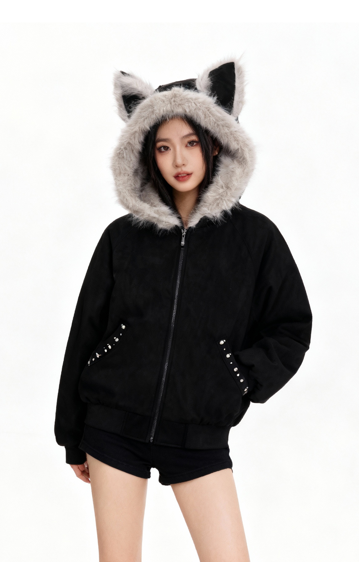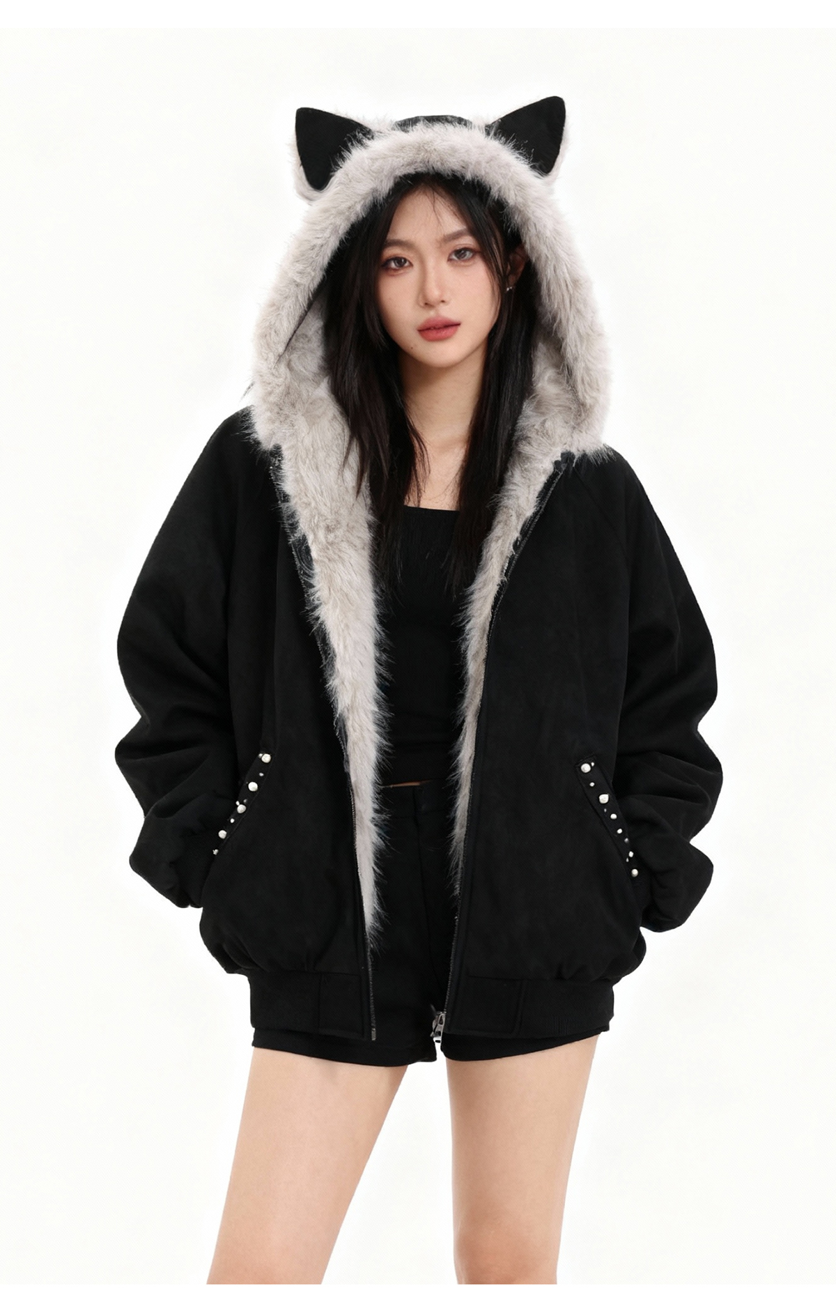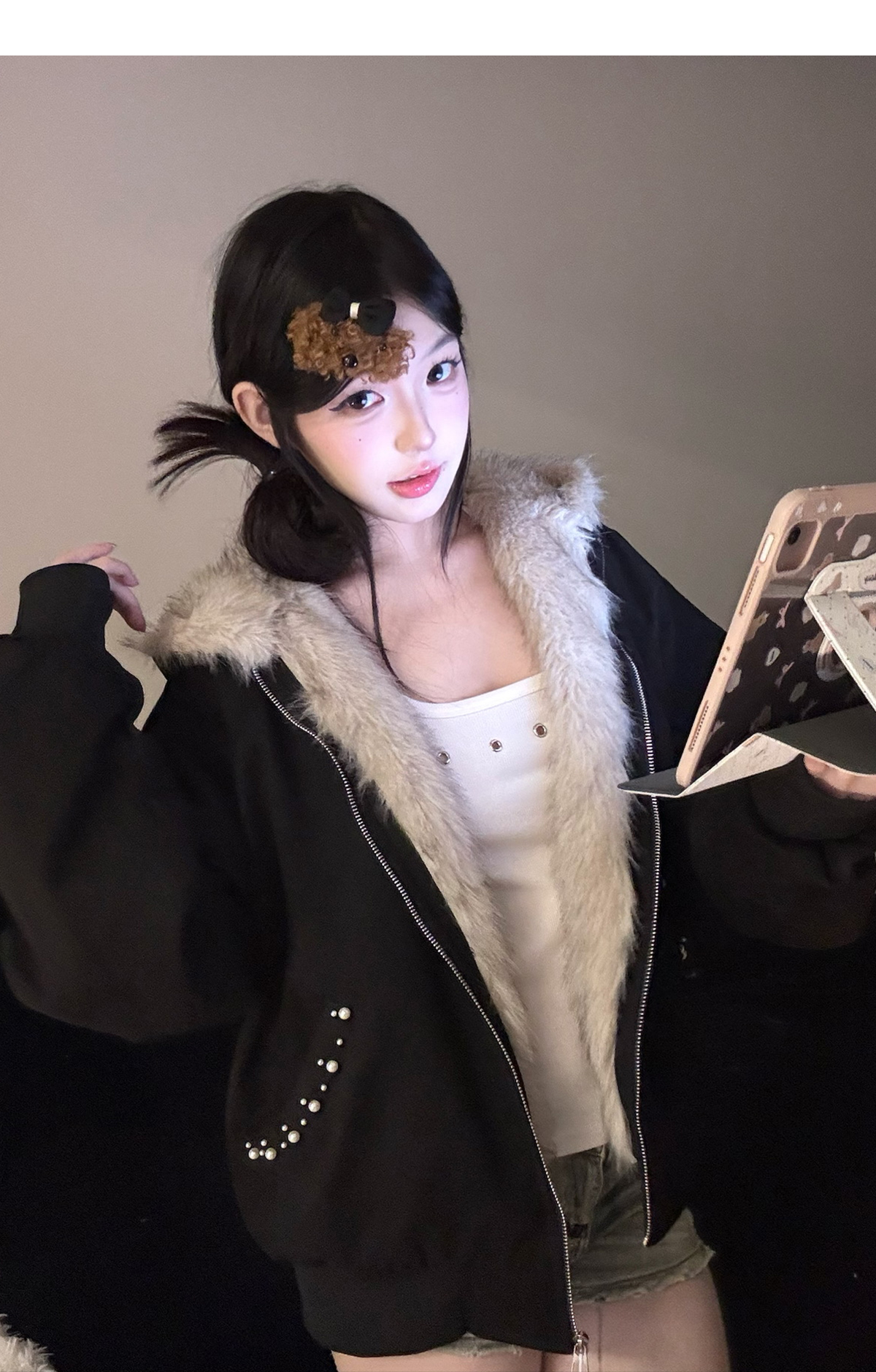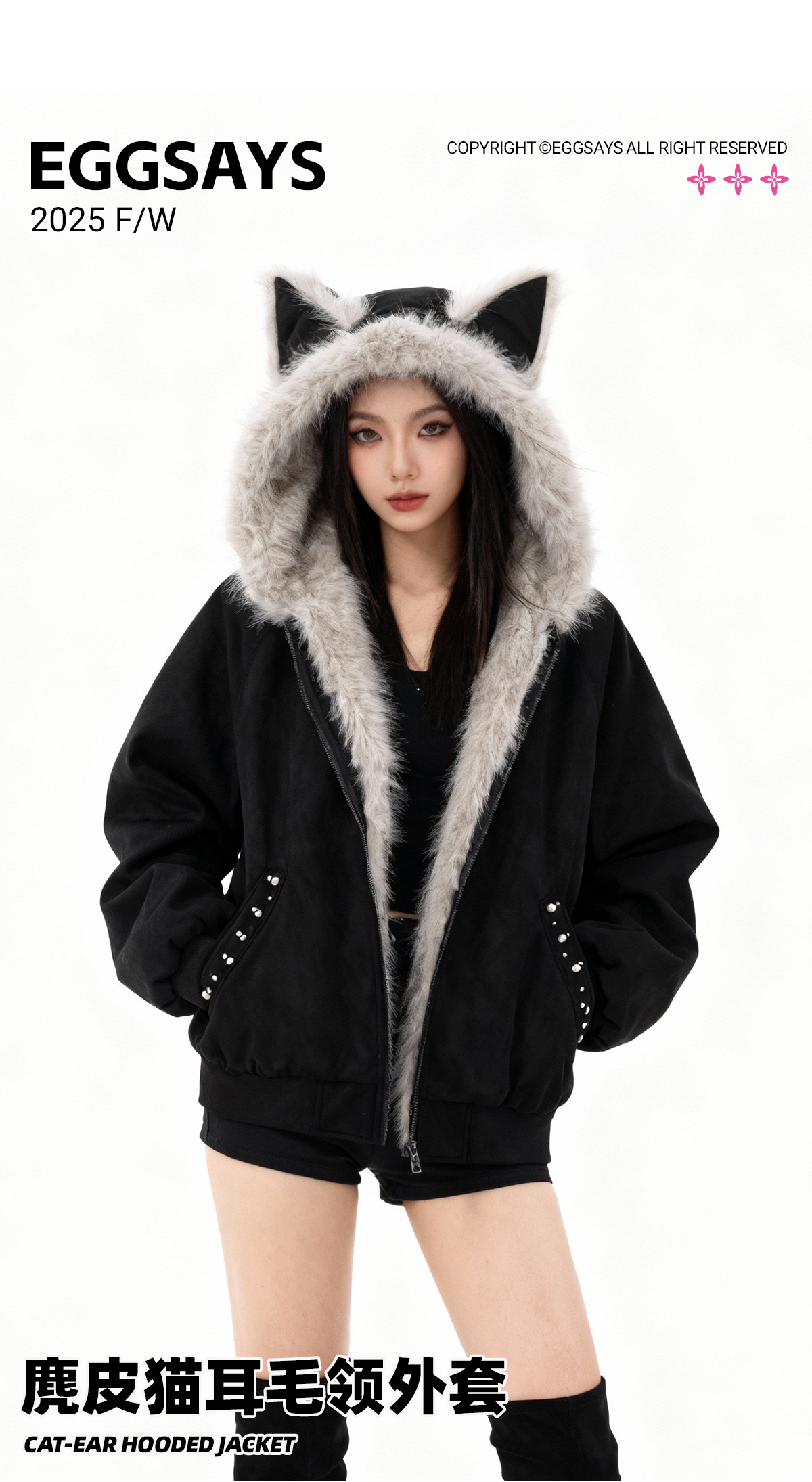 Eggsays American-Style Winter Thickened Cotton Coat with Beaded Cardigan and Fur Collar Suede Jacket for Women and Men