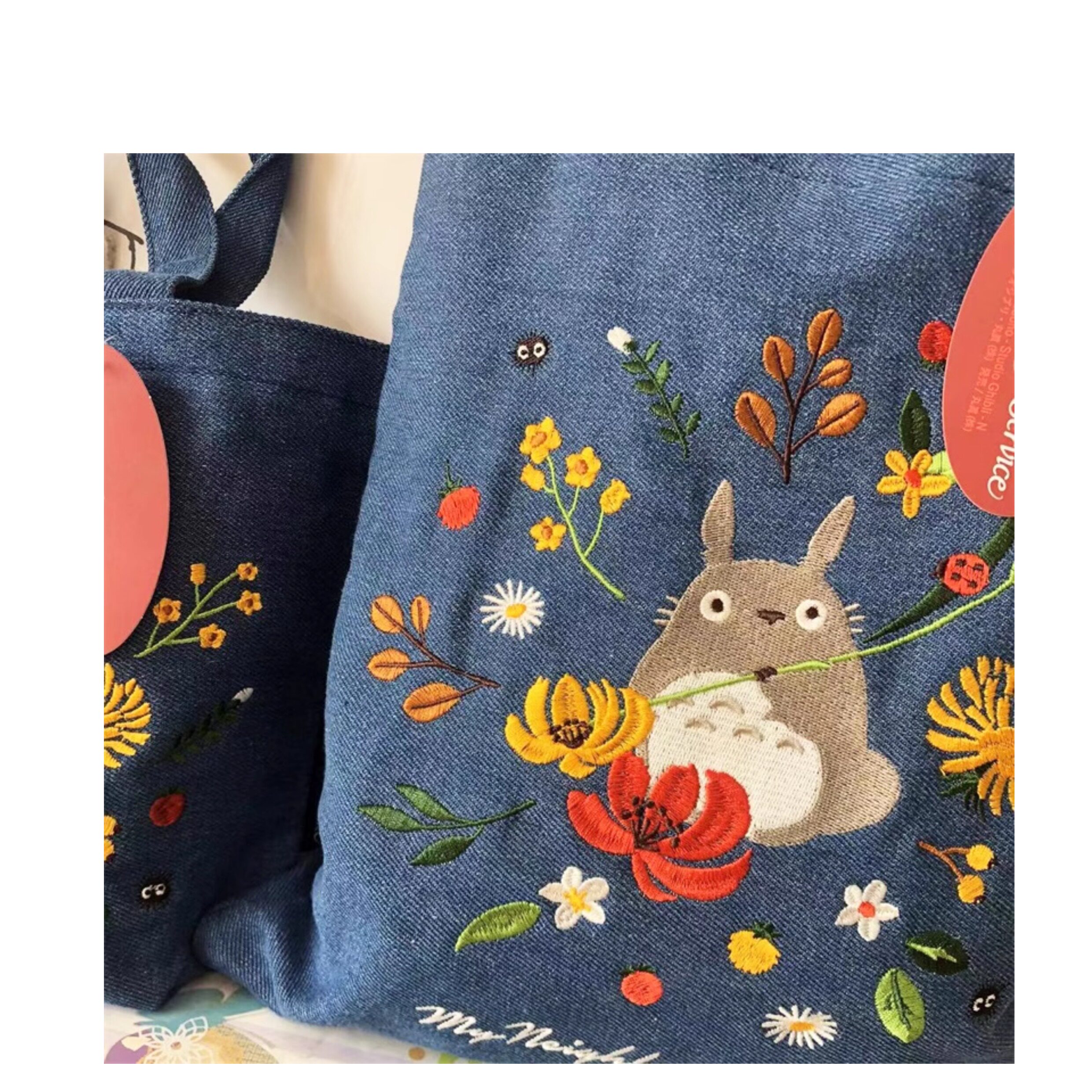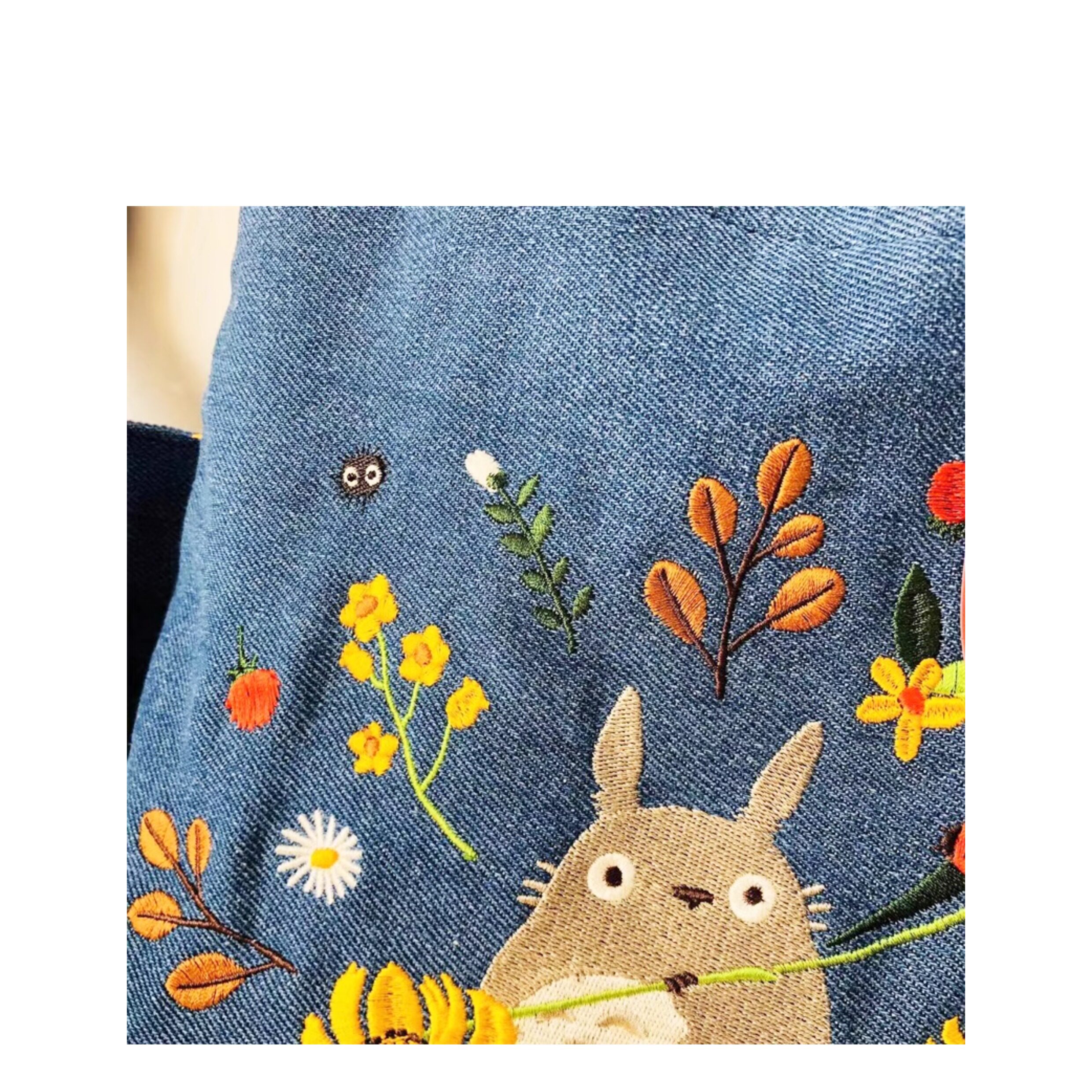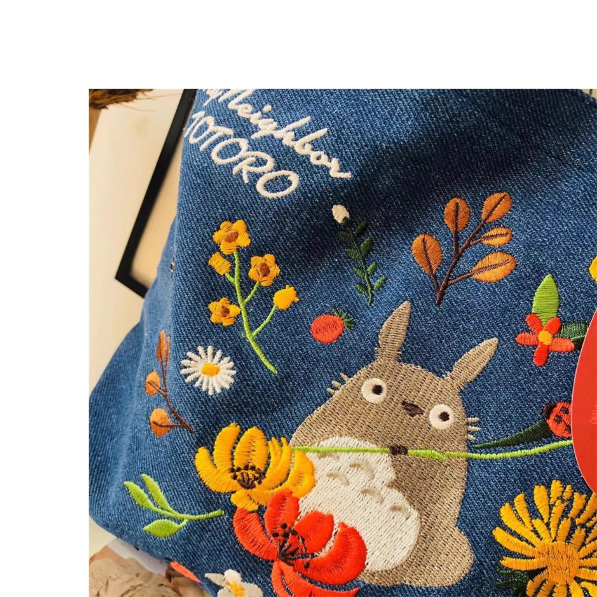 Japanese-Style Cartoon Miyazaki Versatile Totoro Tote Shoulder Casual Canvas Bag Denim Lightweight Student Embroidered Bag