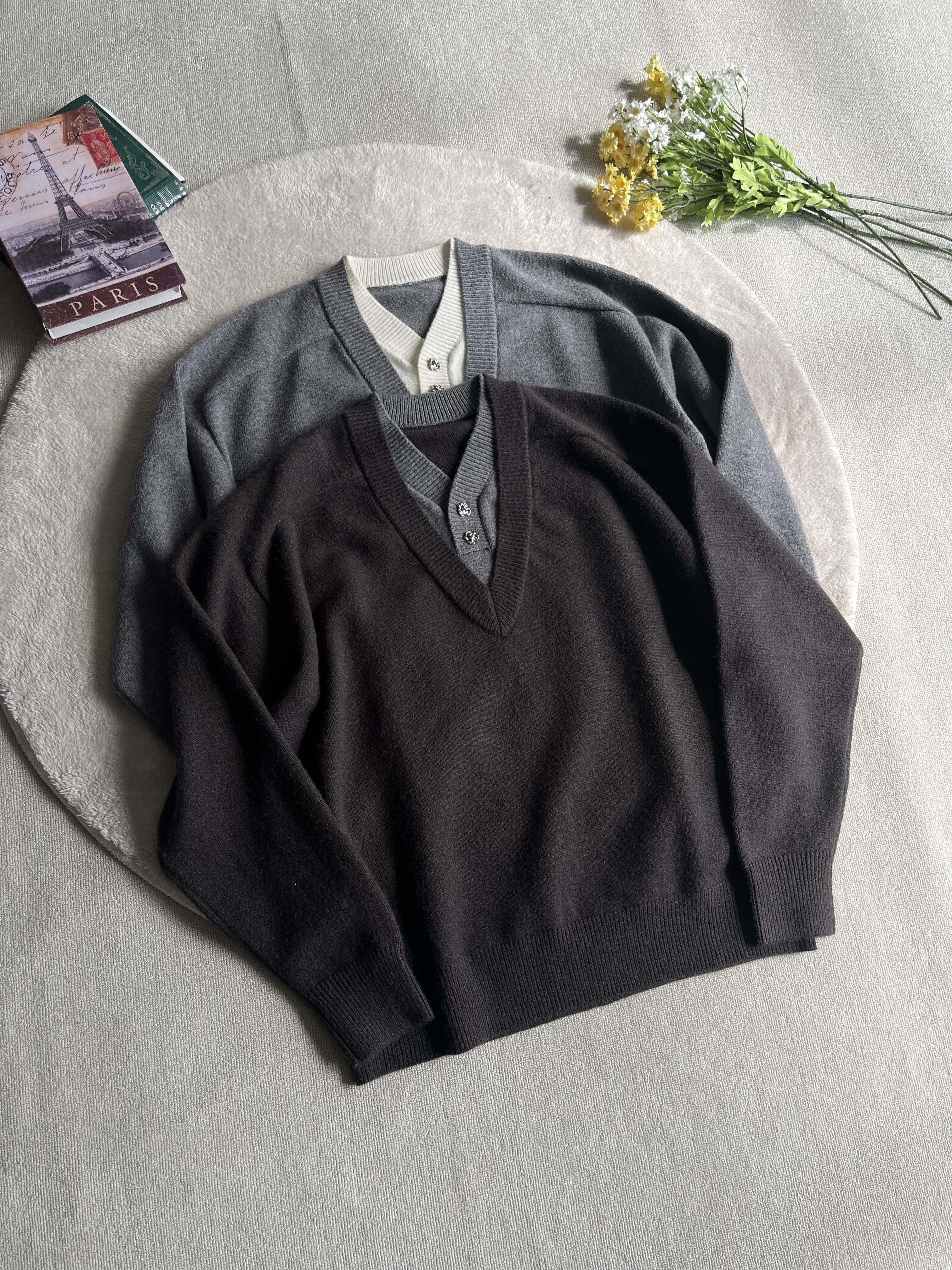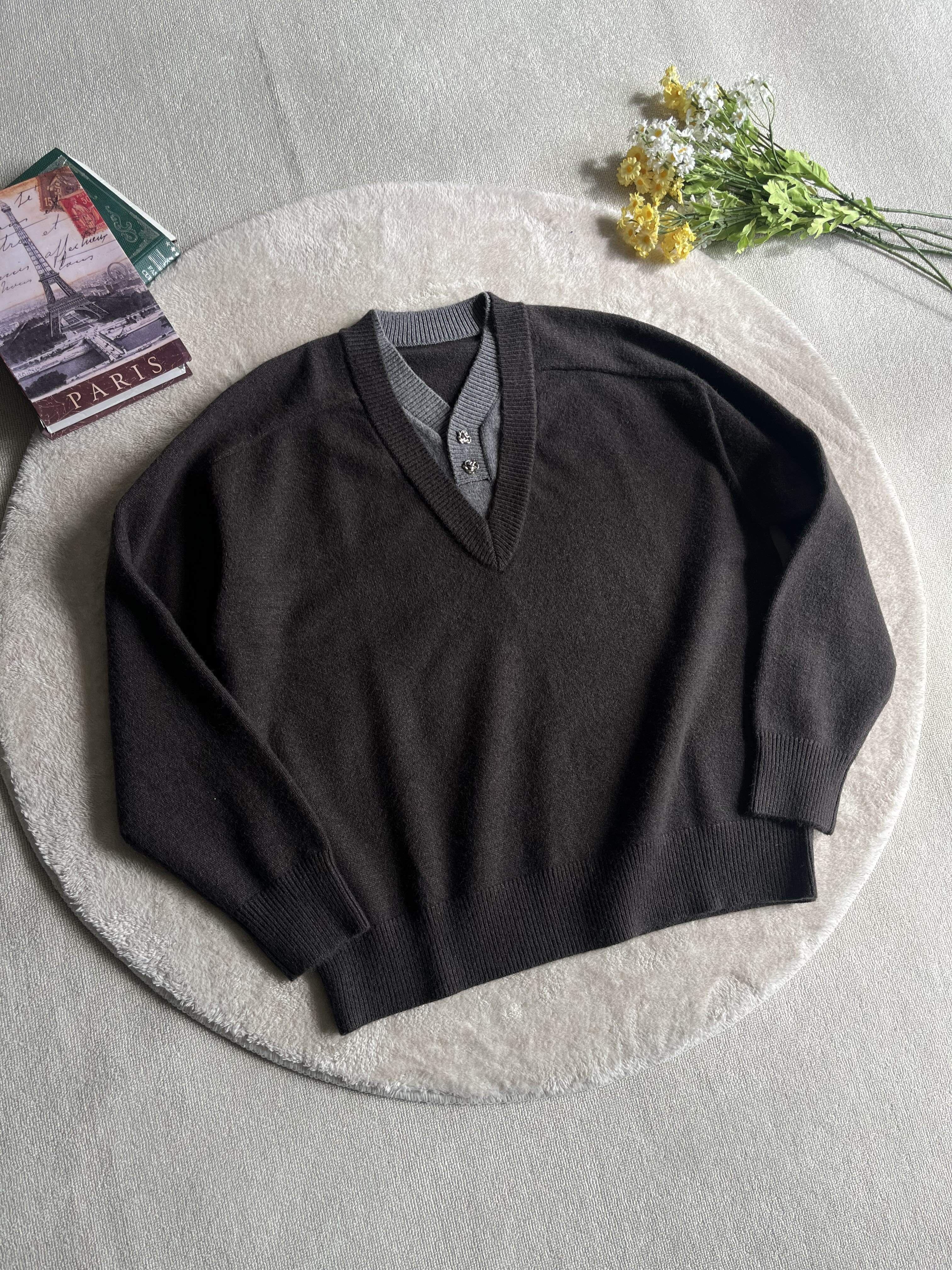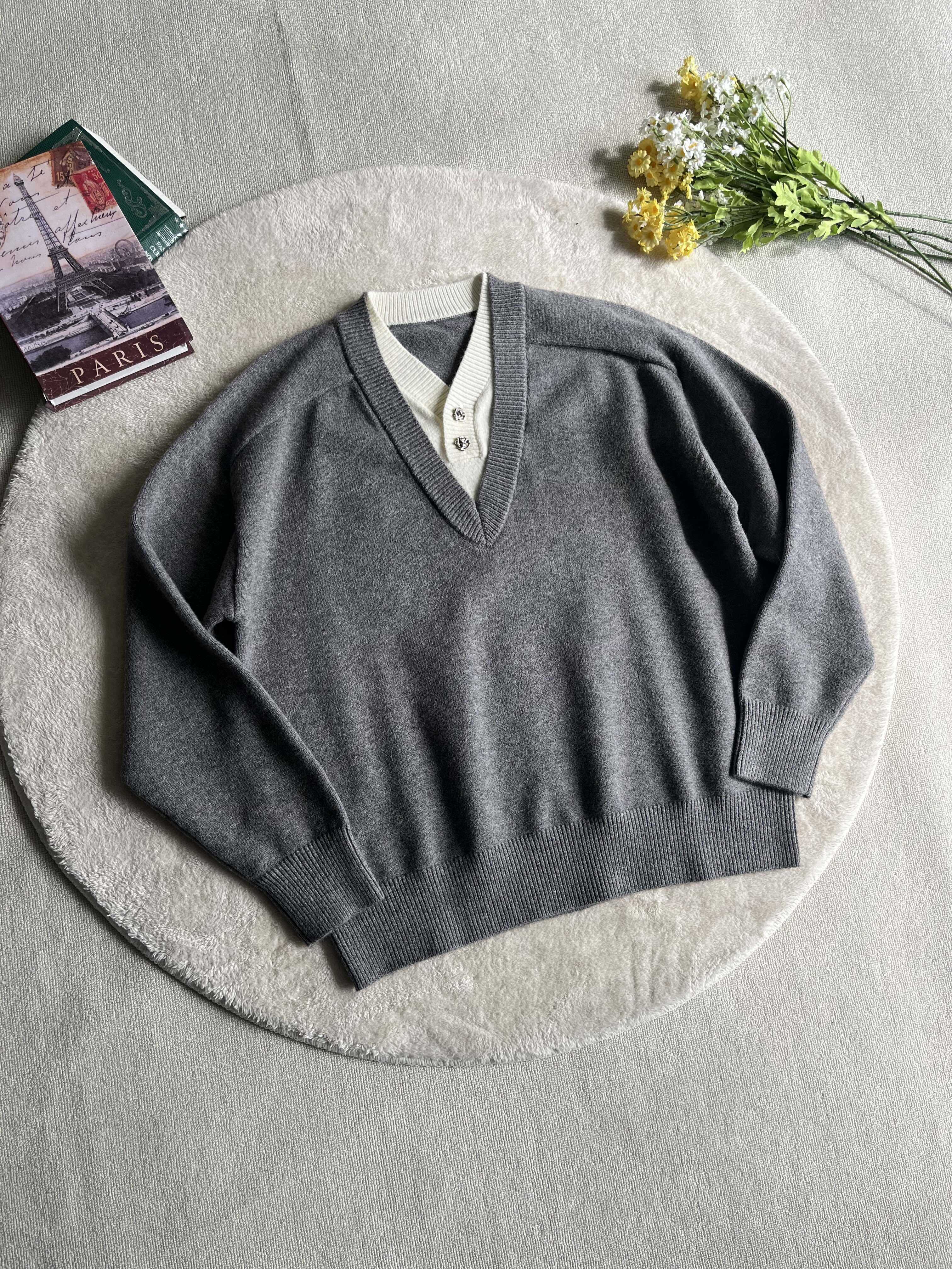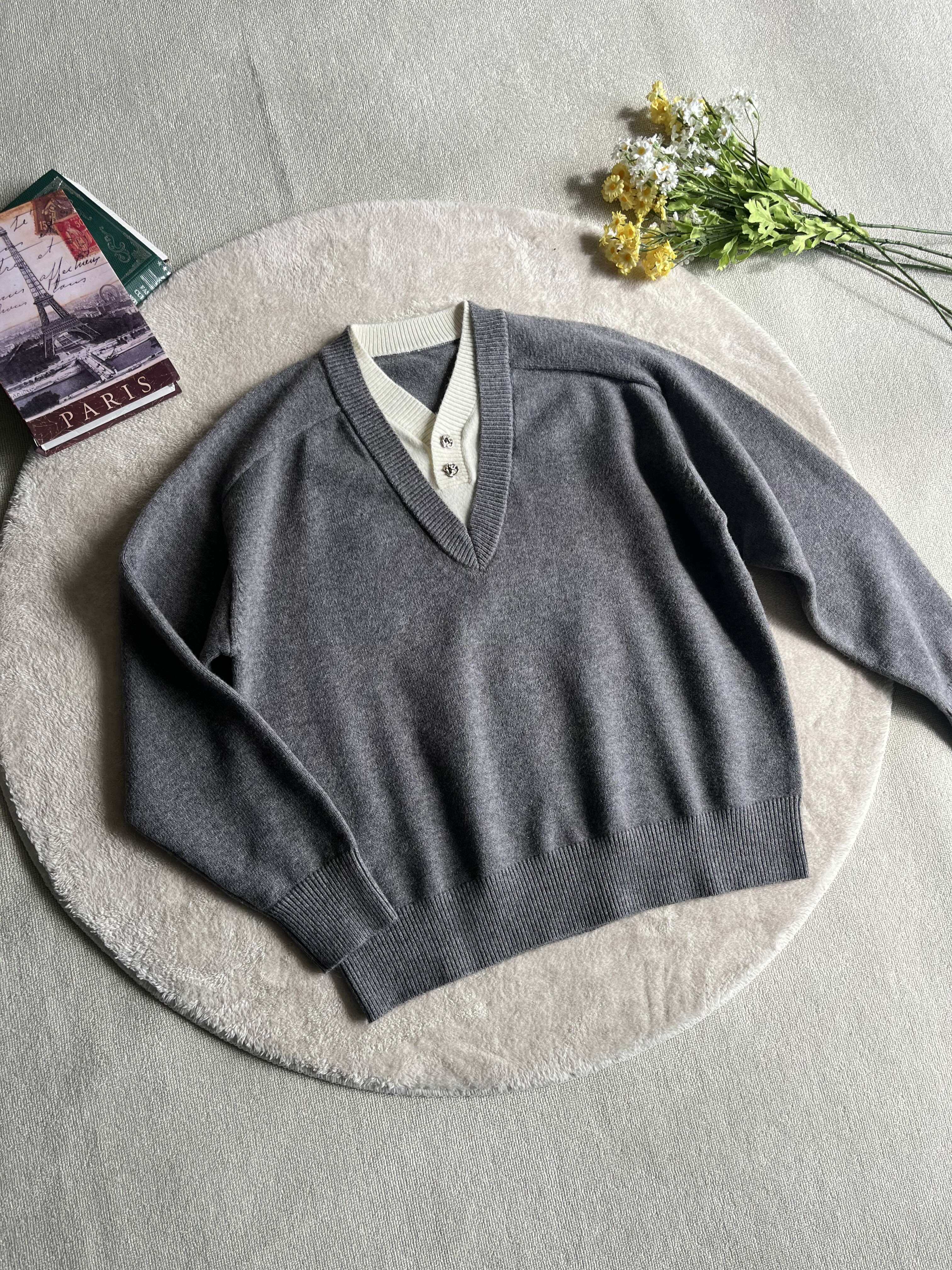 Xanvas Faux Two-Piece Eternal Flower Modal Blend V-Neck Sweater Pullover Knitwear Old Money Style Cleanfit
