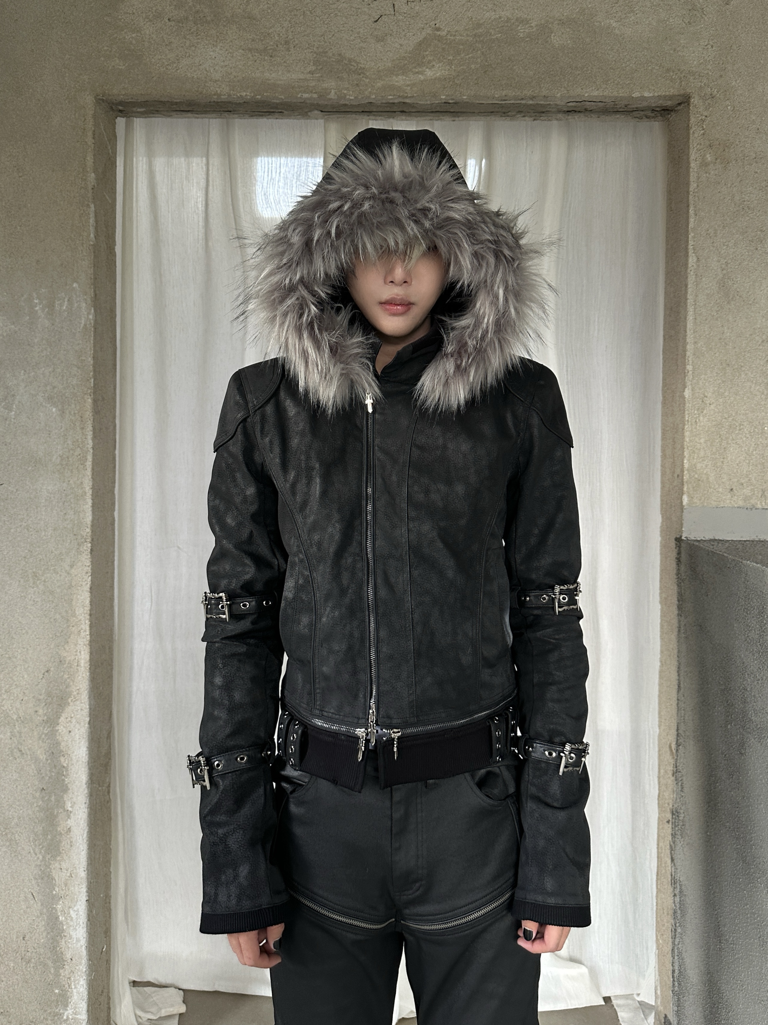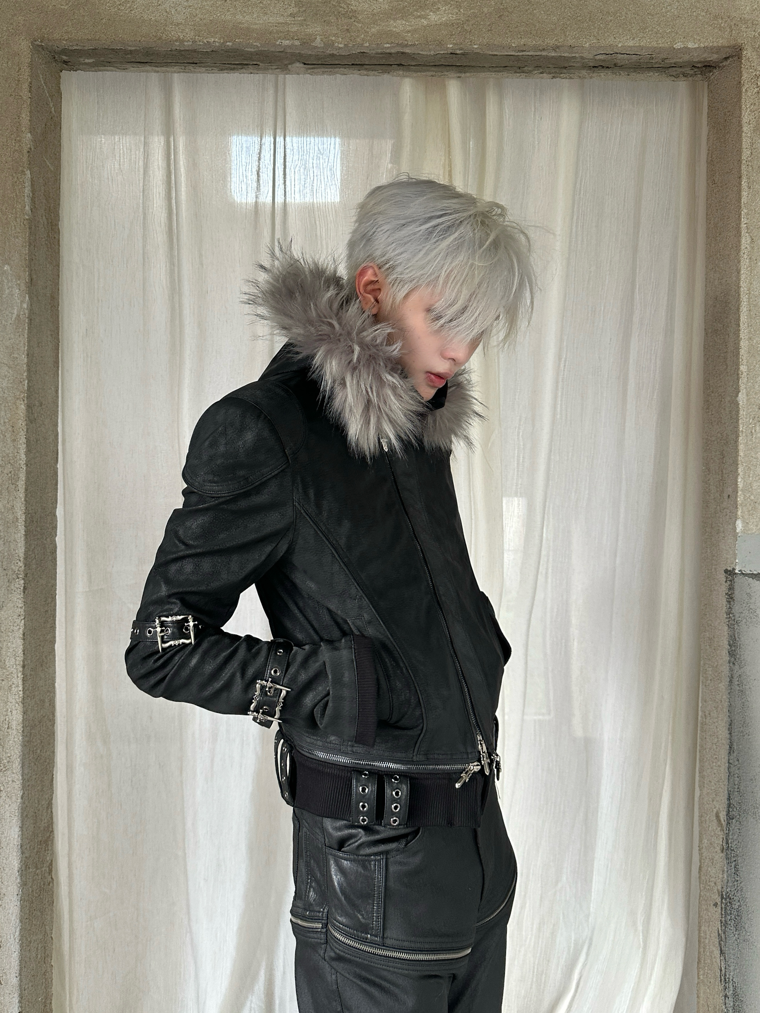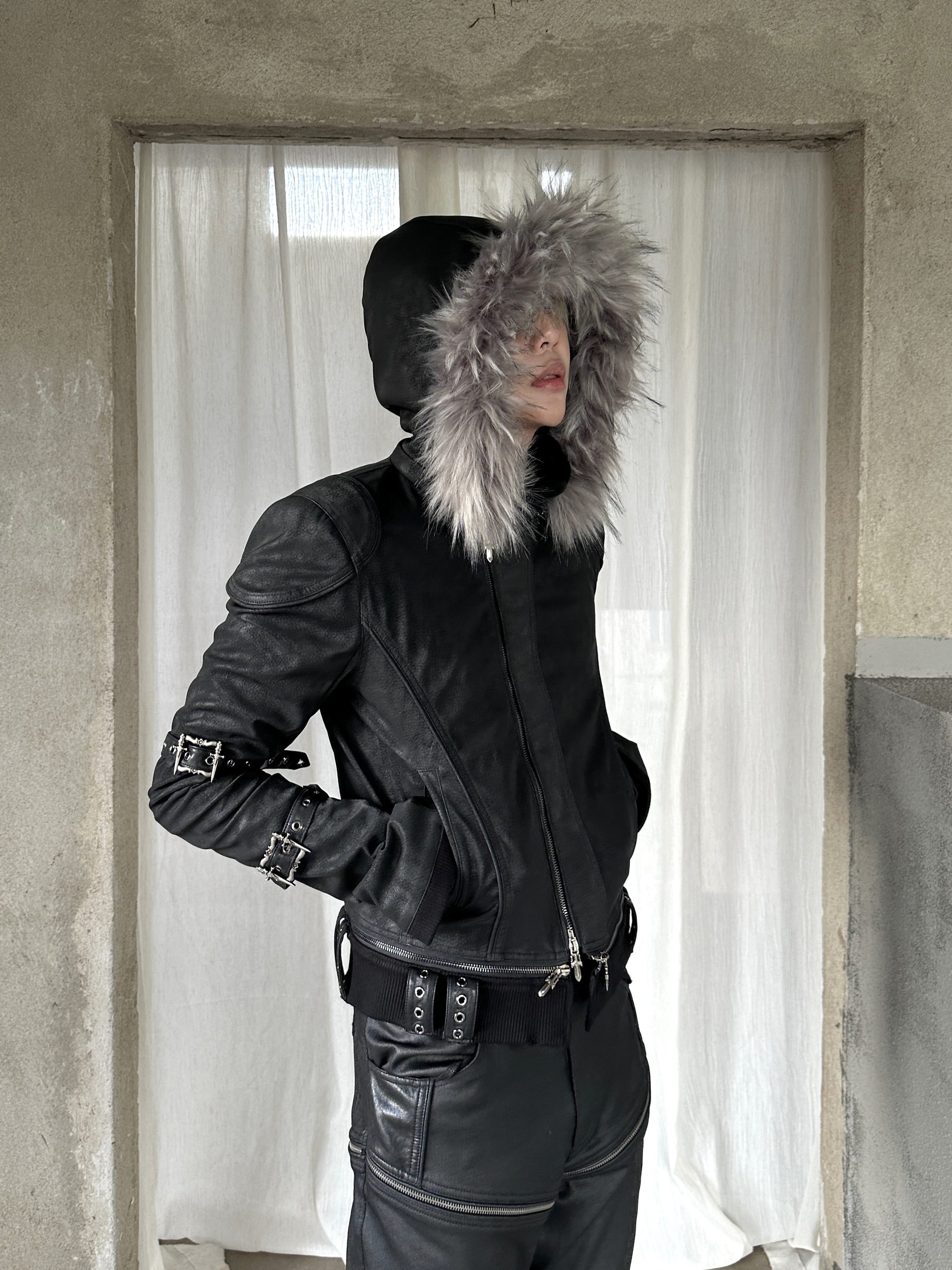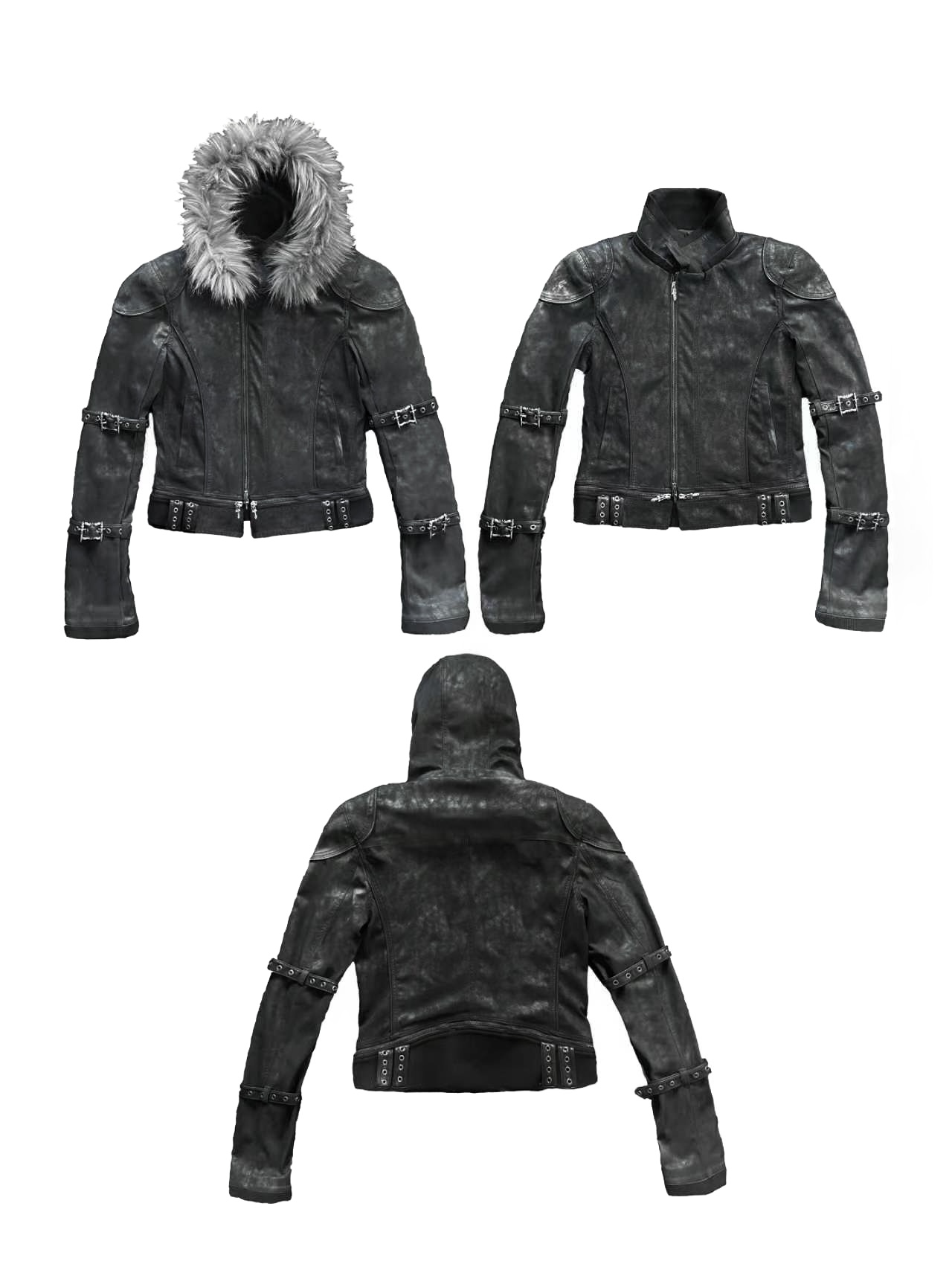 Youwillknow* High-Neck Detachable Bandage Hem Multi-Zipper Quilted Fur Collar Leather Jacket
