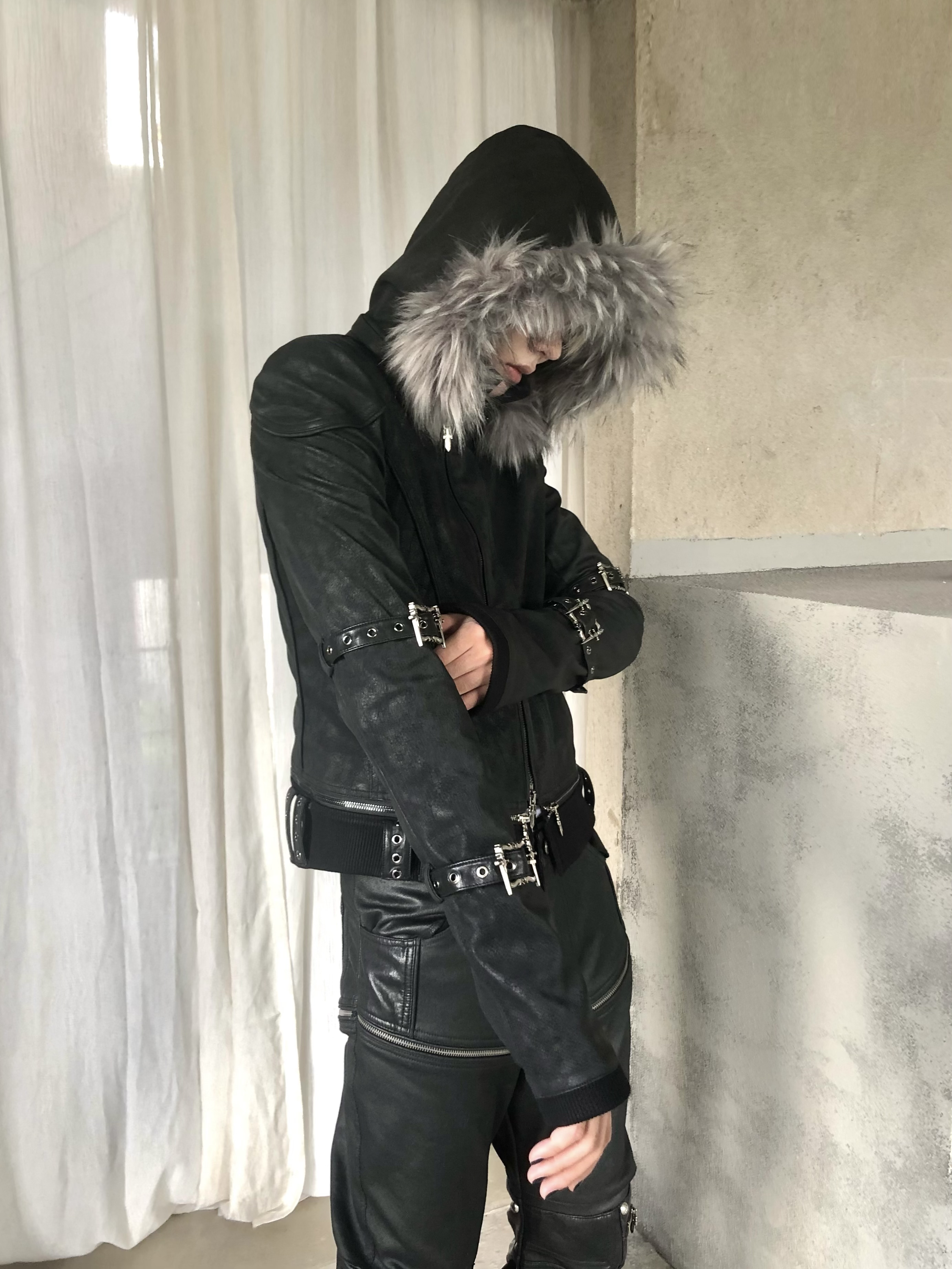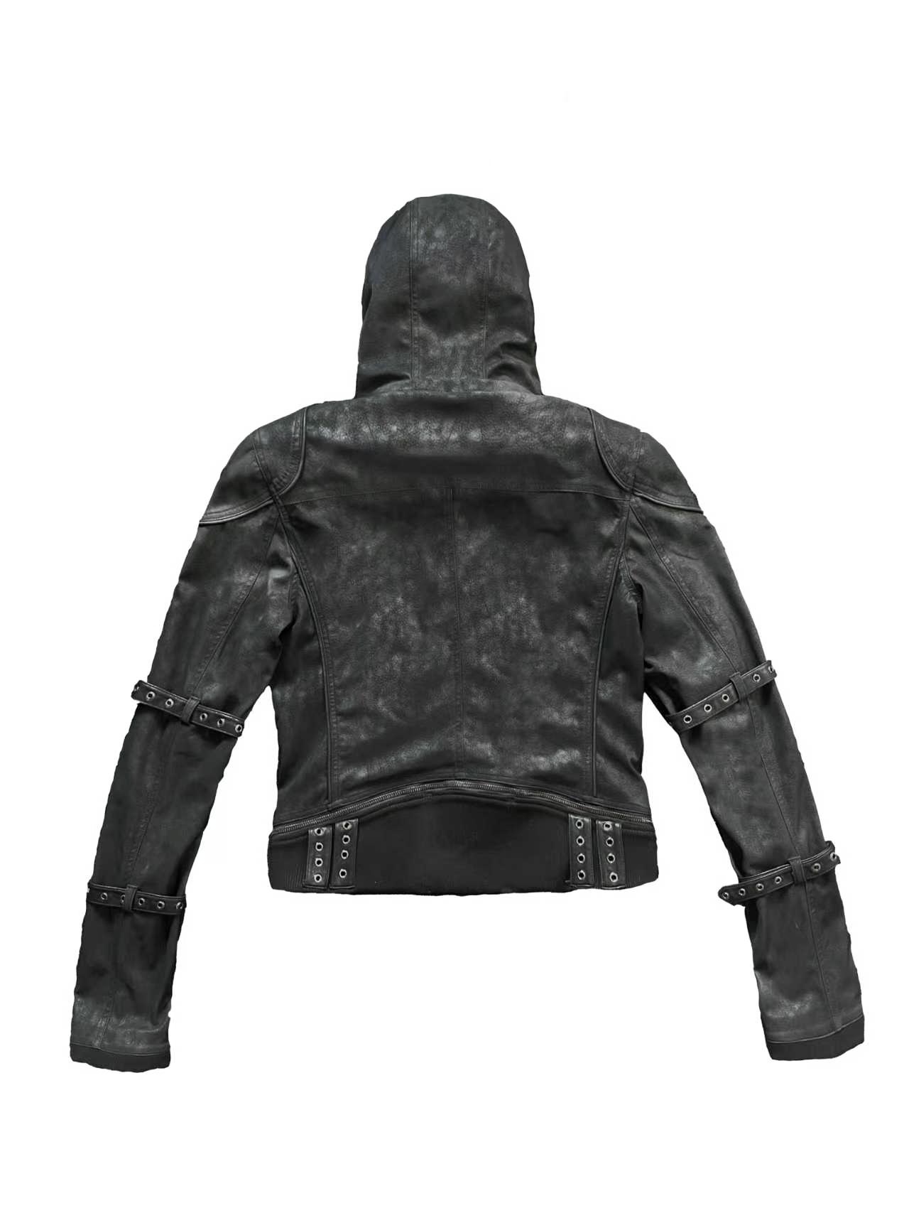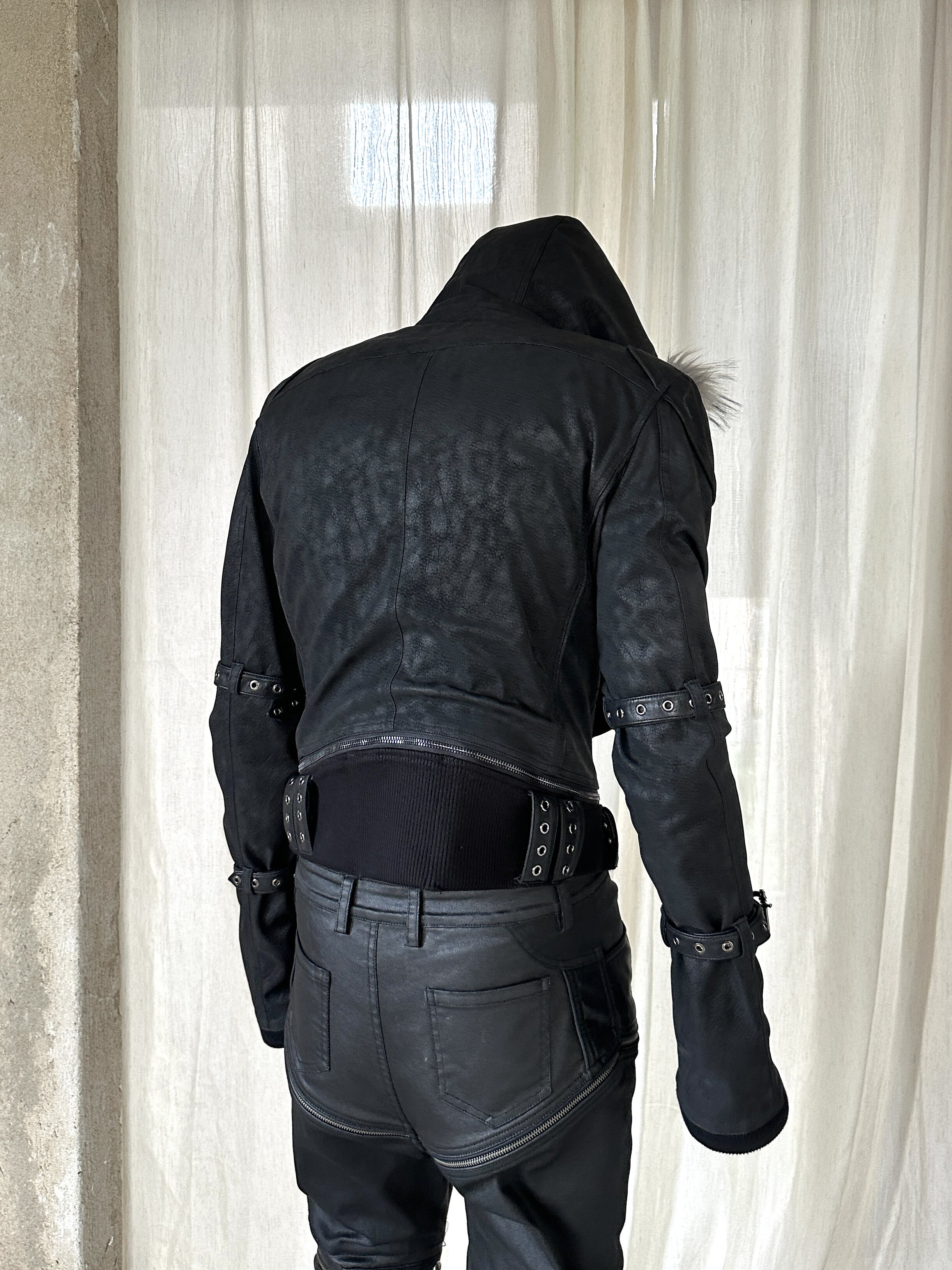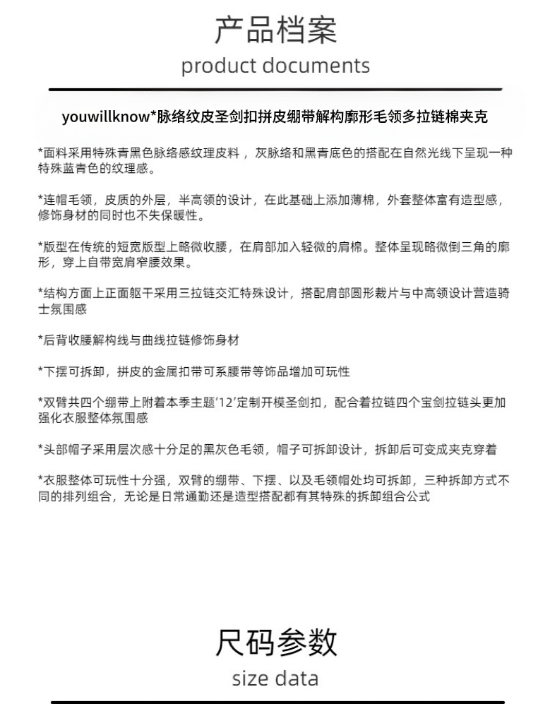 Youwillknow* High-Neck Detachable Bandage Hem Multi-Zipper Quilted Fur Collar Leather Jacket