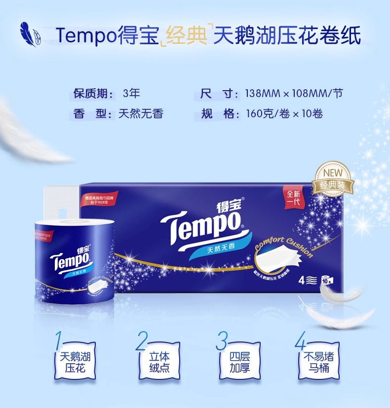 Tempo Toilet Paper 4-Ply 160g 10 Rolls Thick Affordable Unscented Core Roll Paper Household Toilet Paper