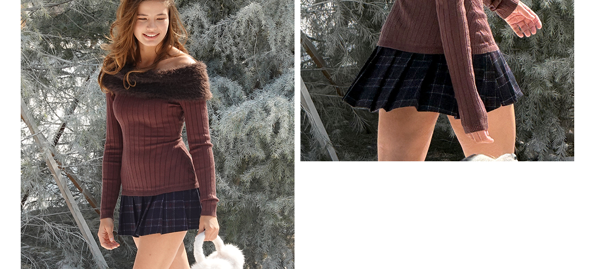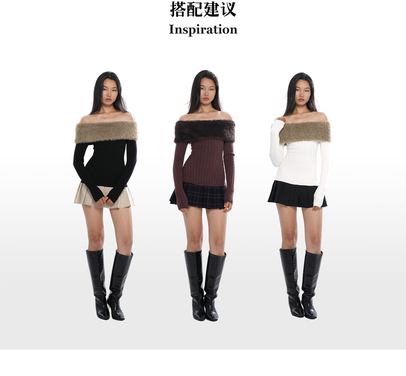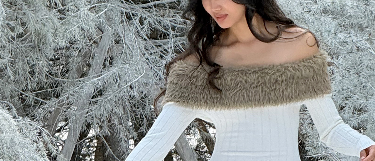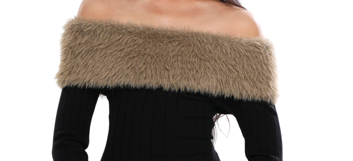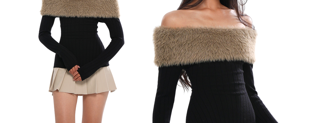 Sweetchilling25 Winter Furry One-Shoulder Waist-Cinching Slimming Patchwork Pleated Hot Girl Dress