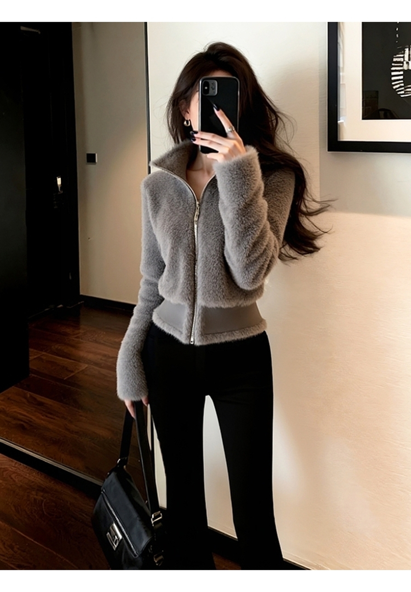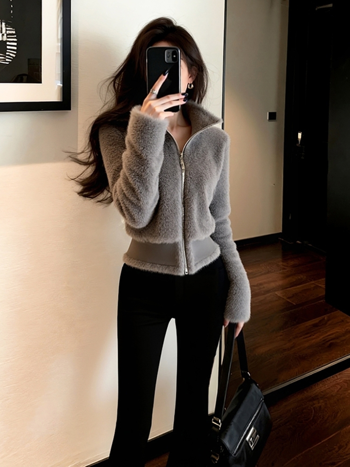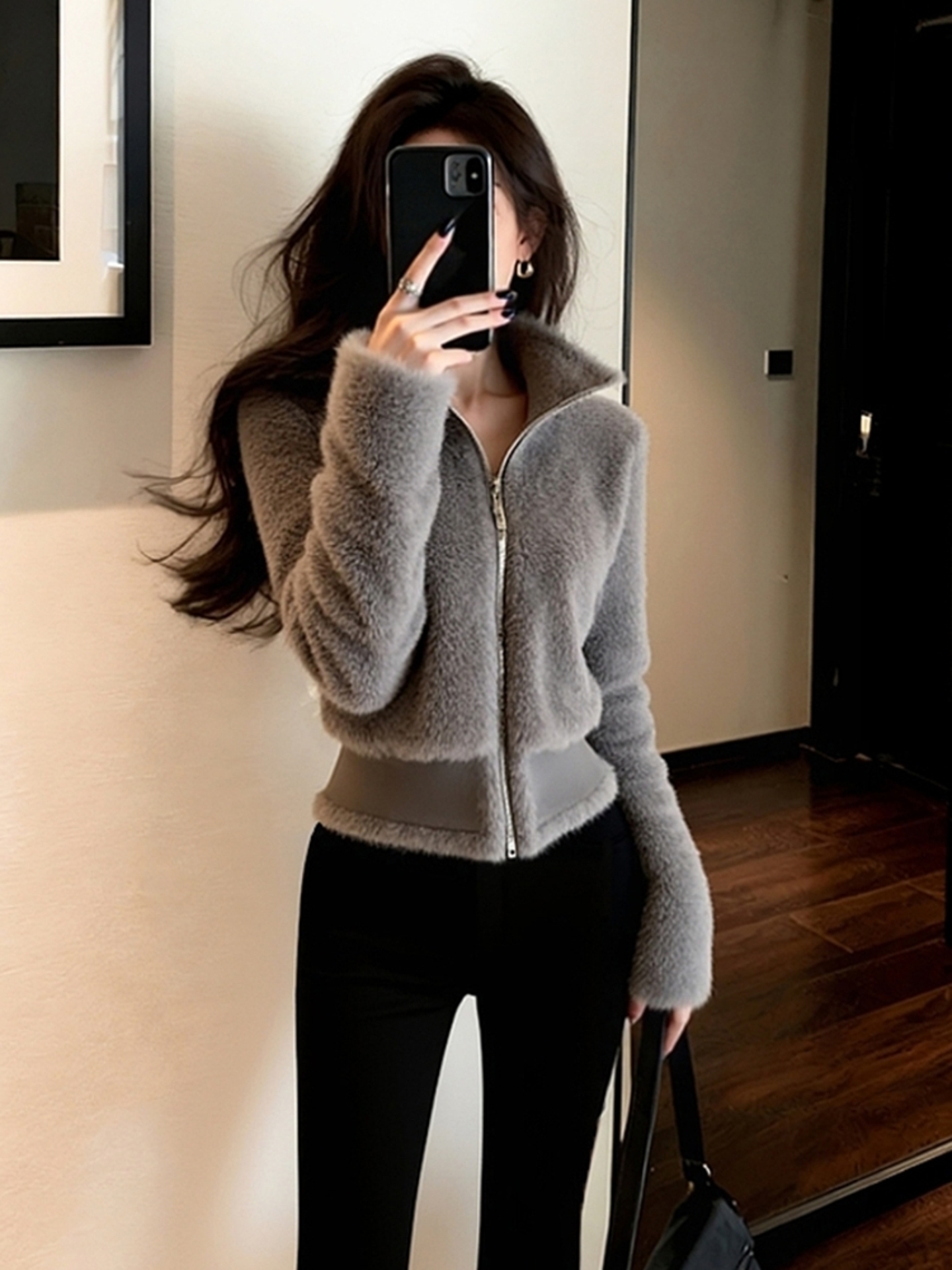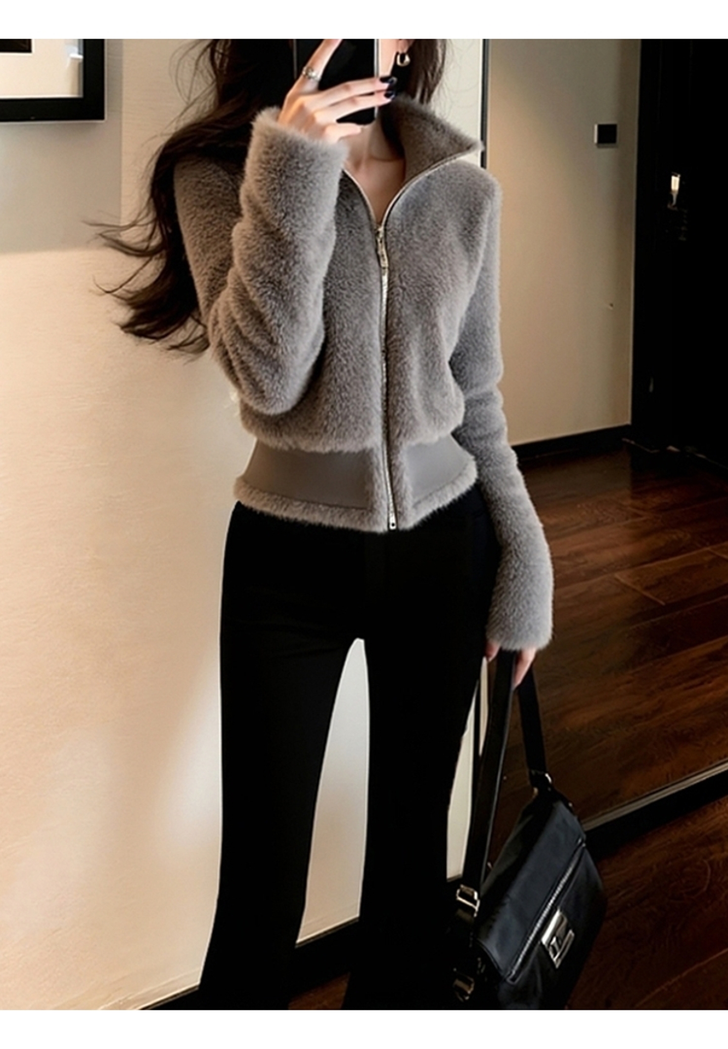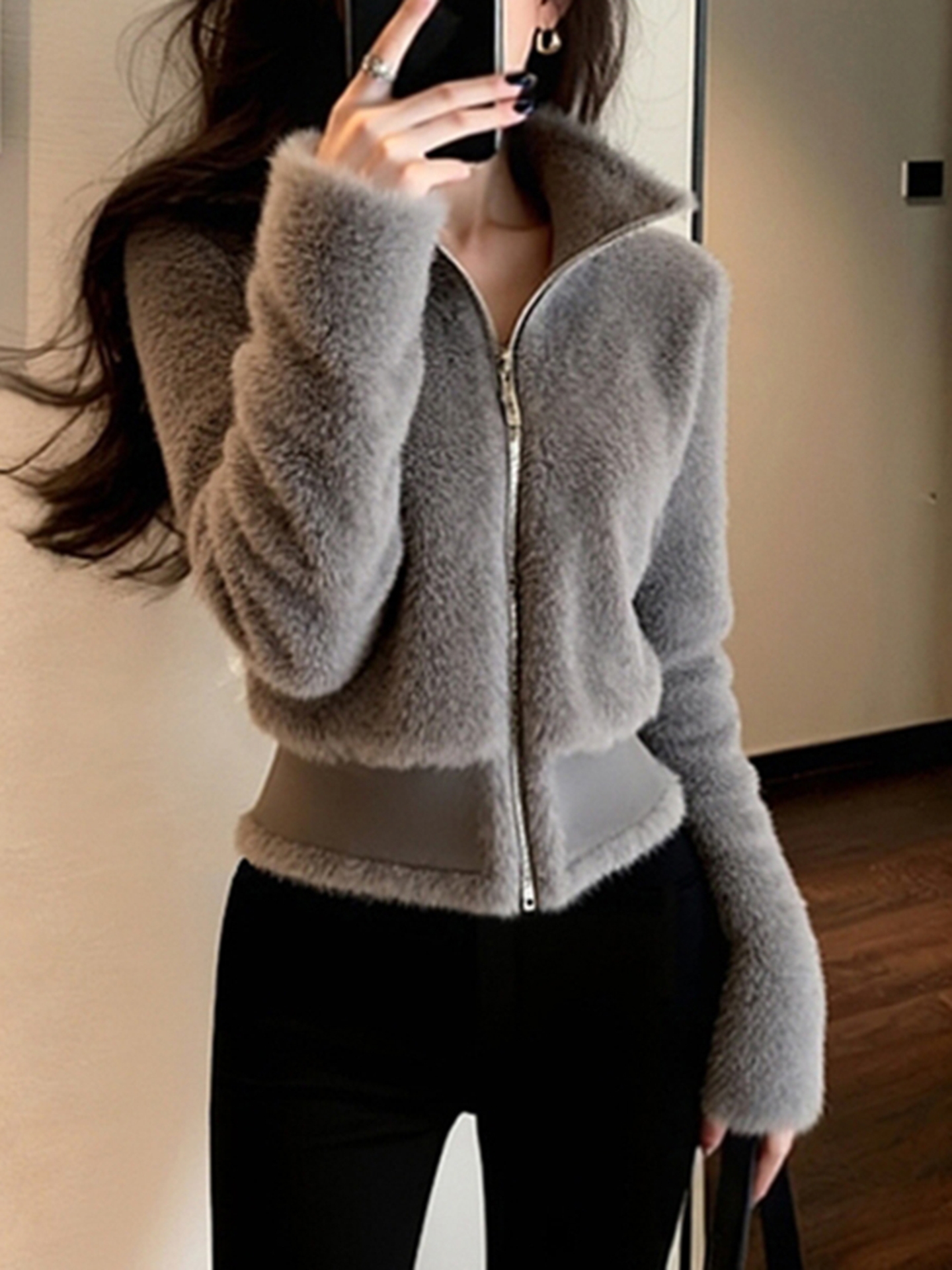 Very Stylish Early Winter Coat, High-End Fashionable and Chic, Petite-Friendly, Waist-Cinching, Chanel-Style Gray Fur Top