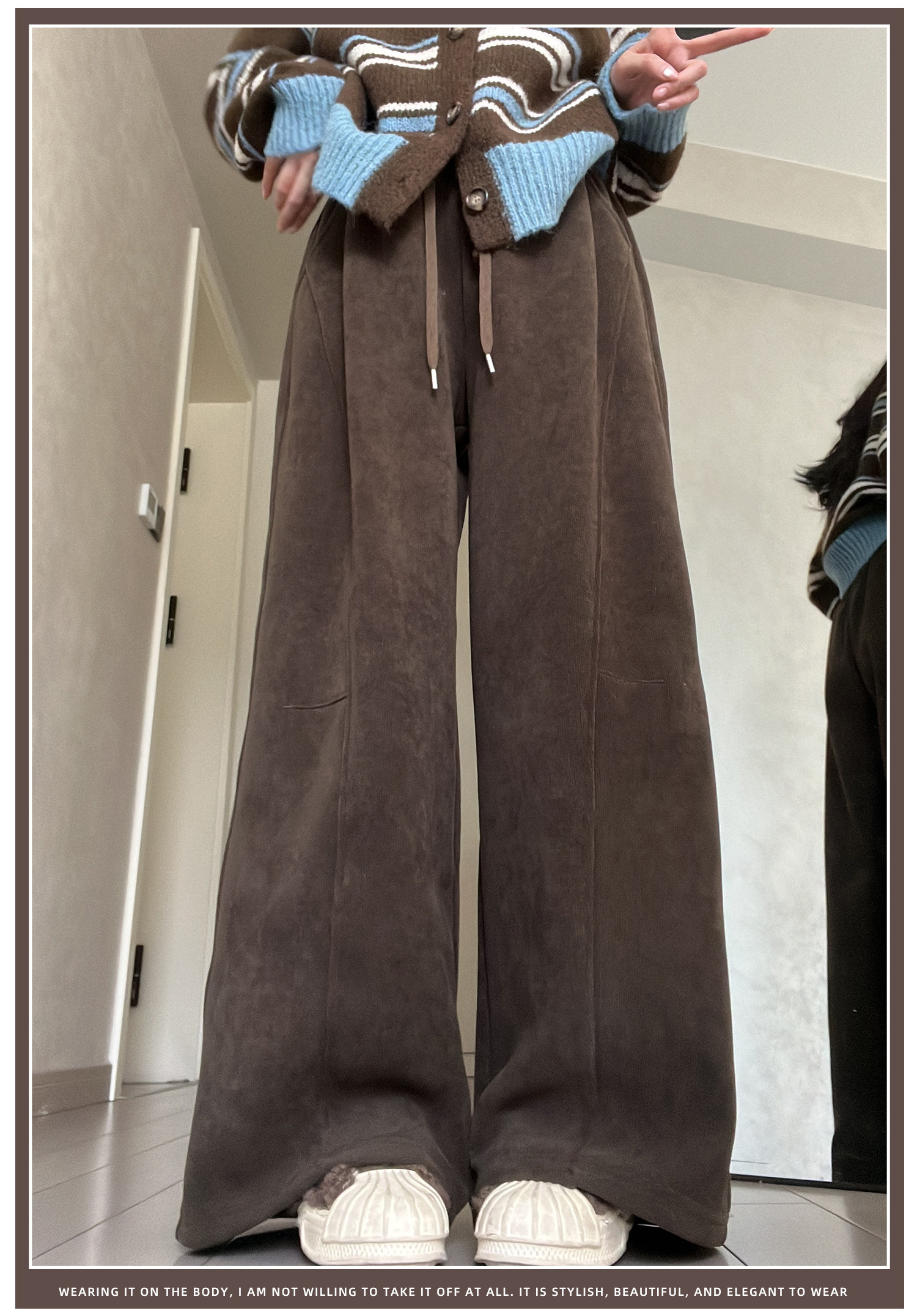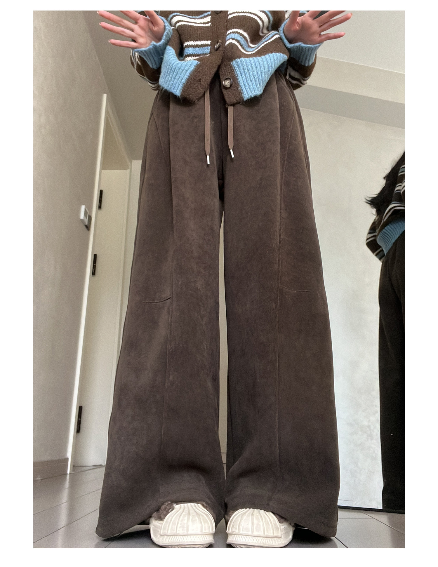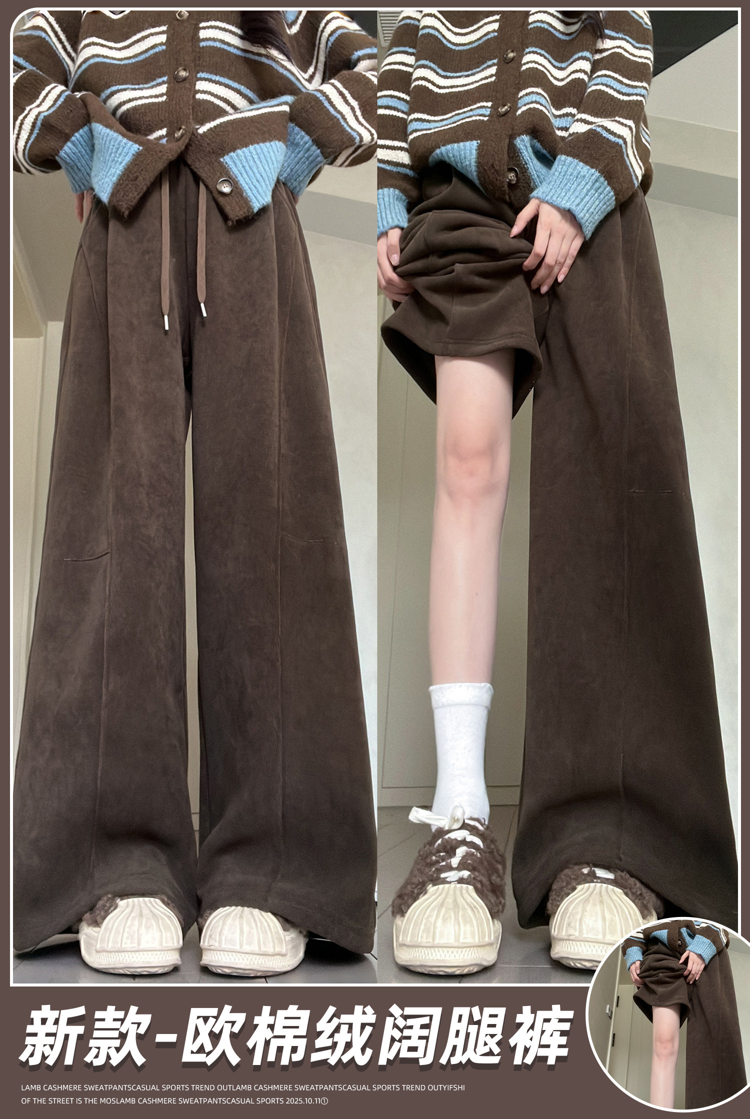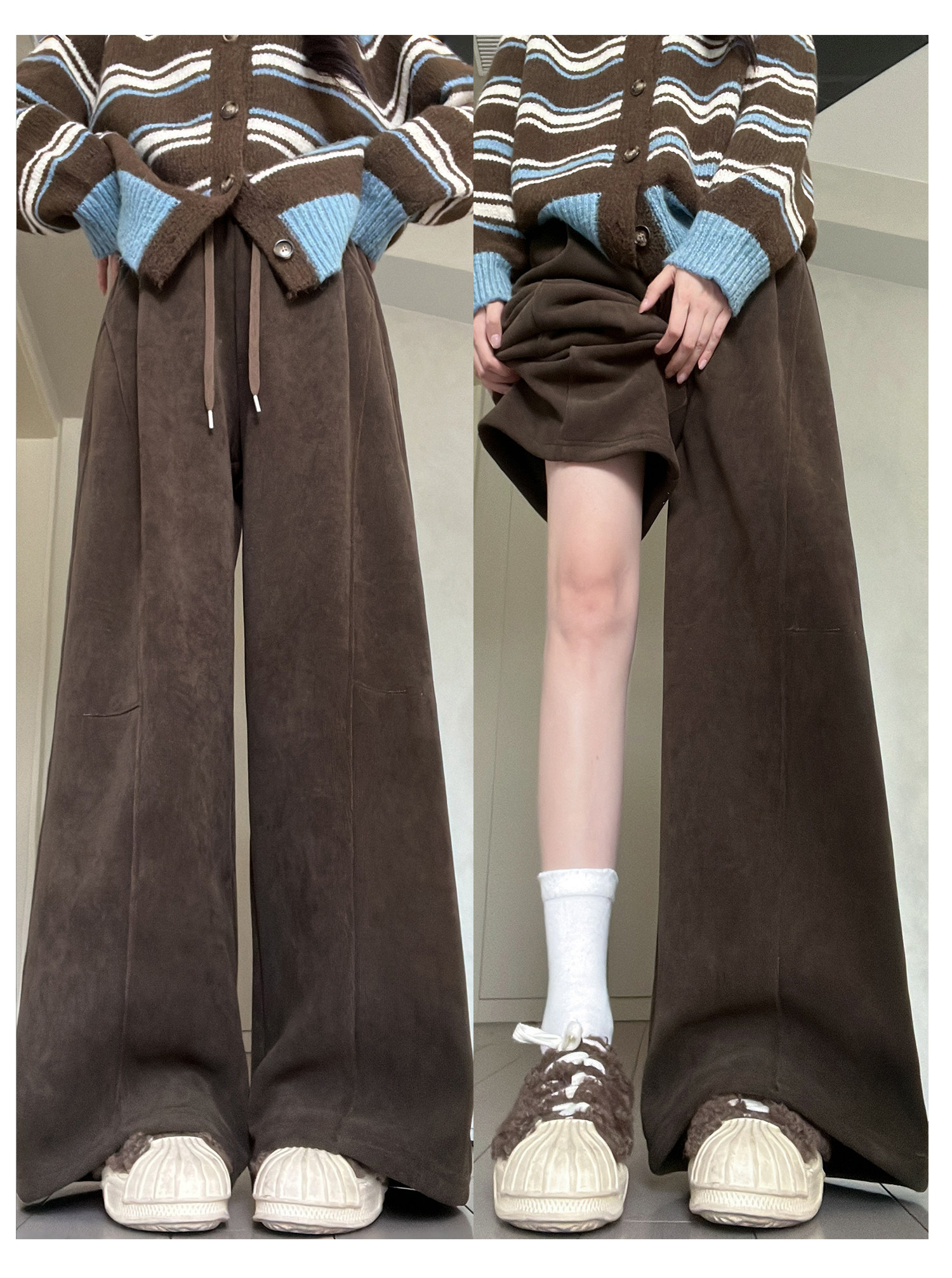 Brown Corduroy Wide-Leg Pants for Women, Autumn and Winter 2025 New Style, High-Waisted, Slimming, Casual, Sporty, Petite, Fleece-Lined Sweatpants