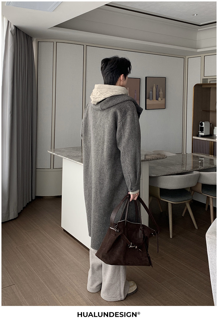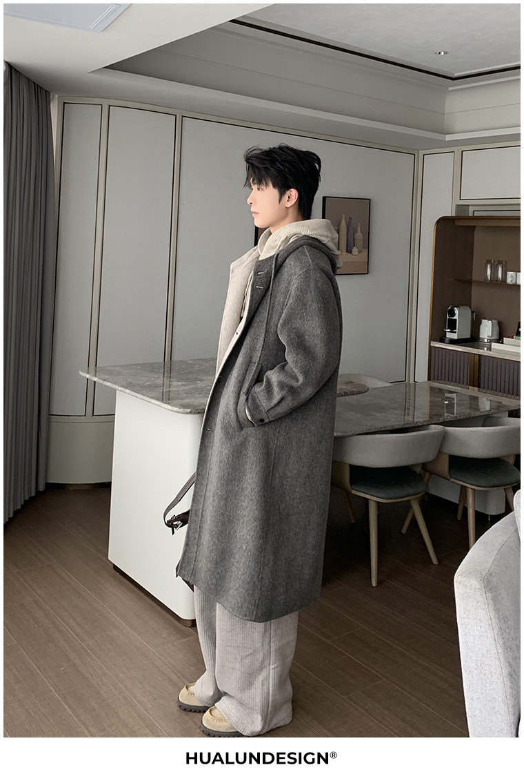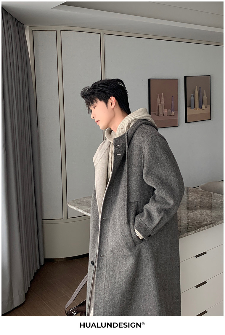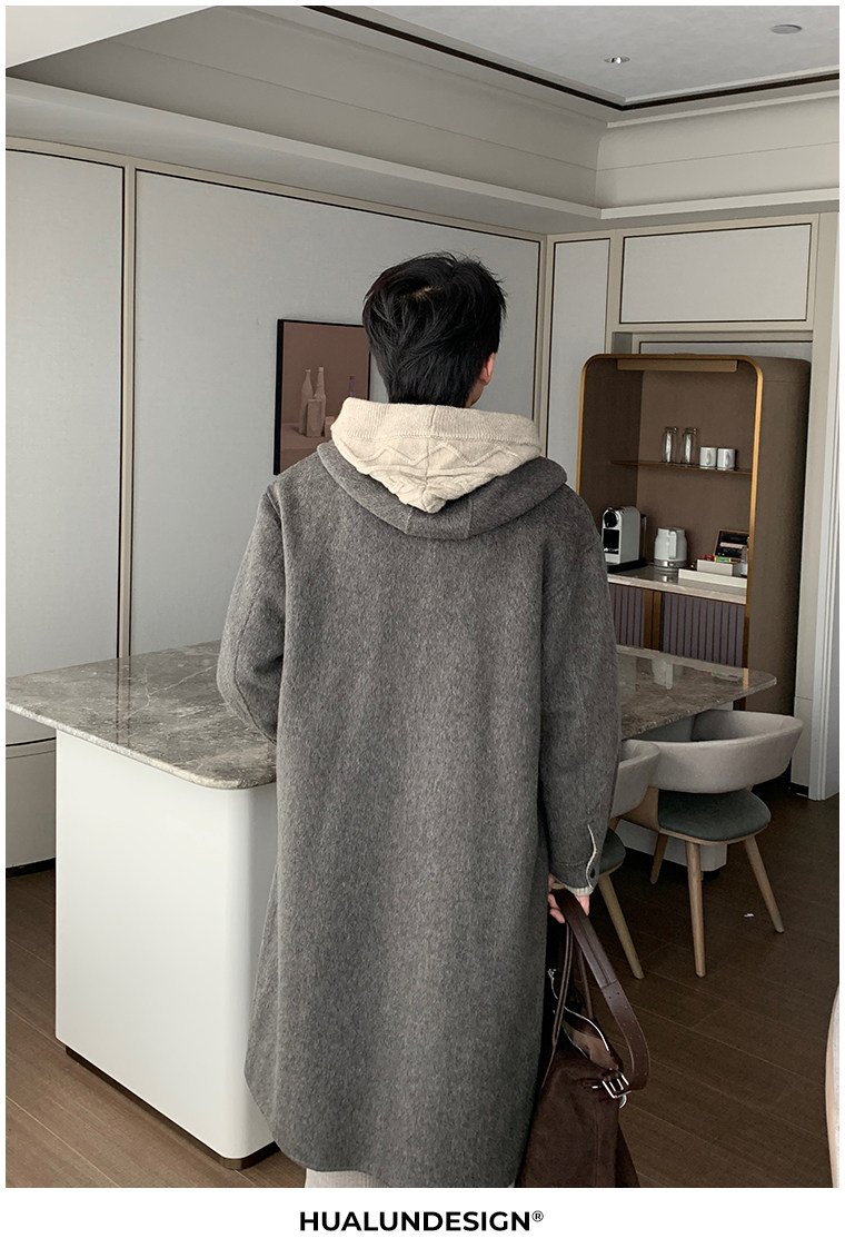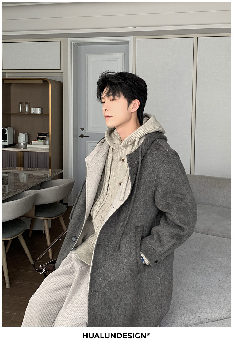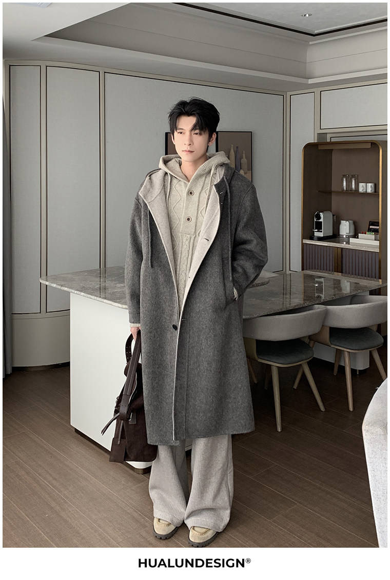 Hualun Mid-Length Double-Sided Cashmere Wool Coat for Men, Loose and Thick, Trendy Brand, Warm Hooded Woolen Jacket