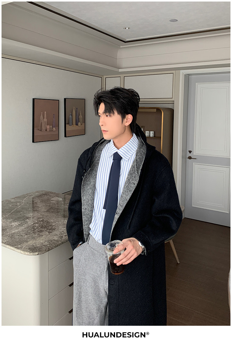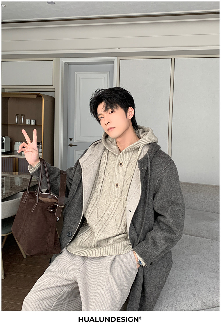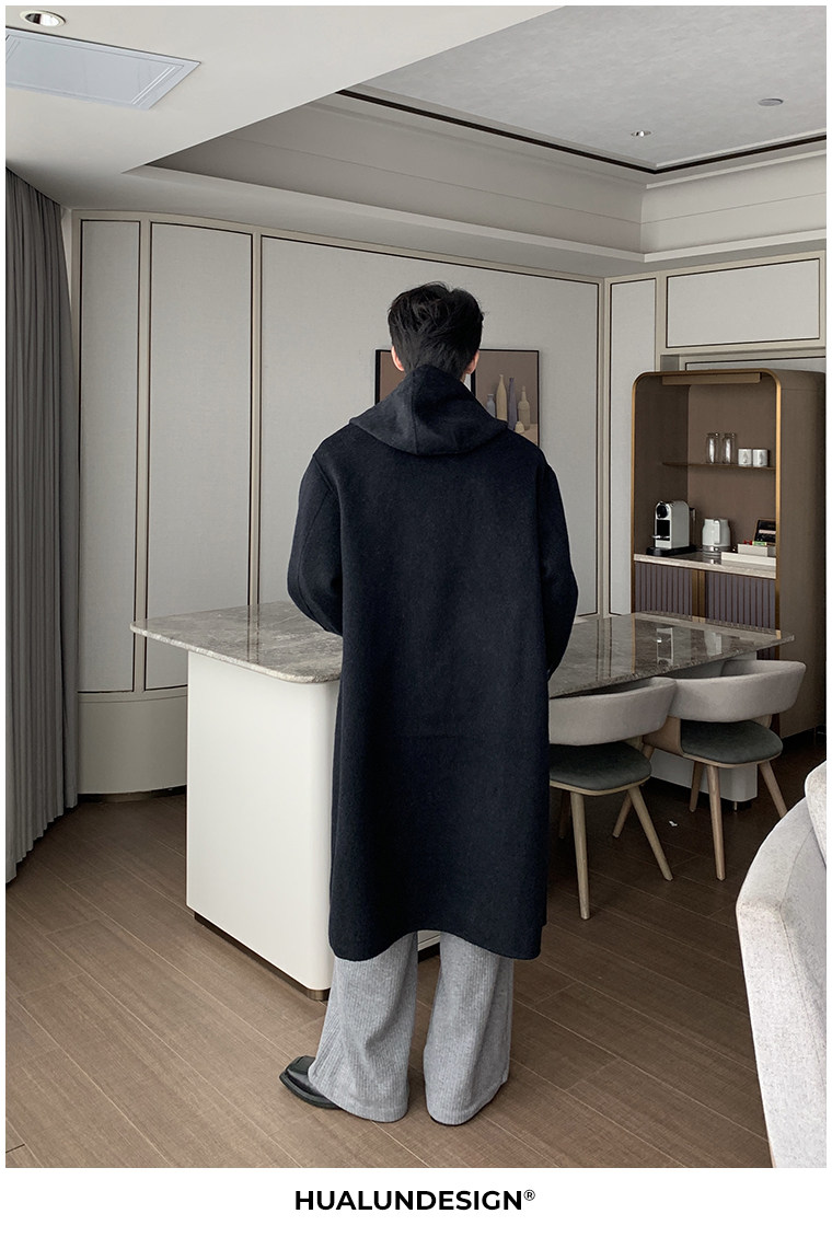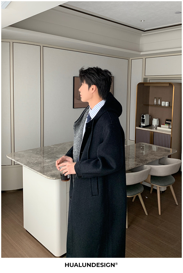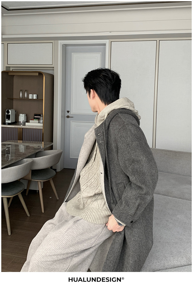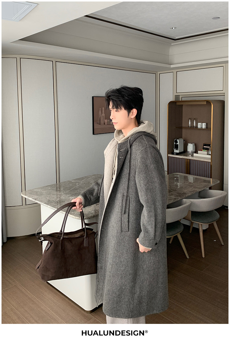 Hualun Mid-Length Double-Sided Cashmere Wool Coat for Men, Loose and Thick, Trendy Brand, Warm Hooded Woolen Jacket