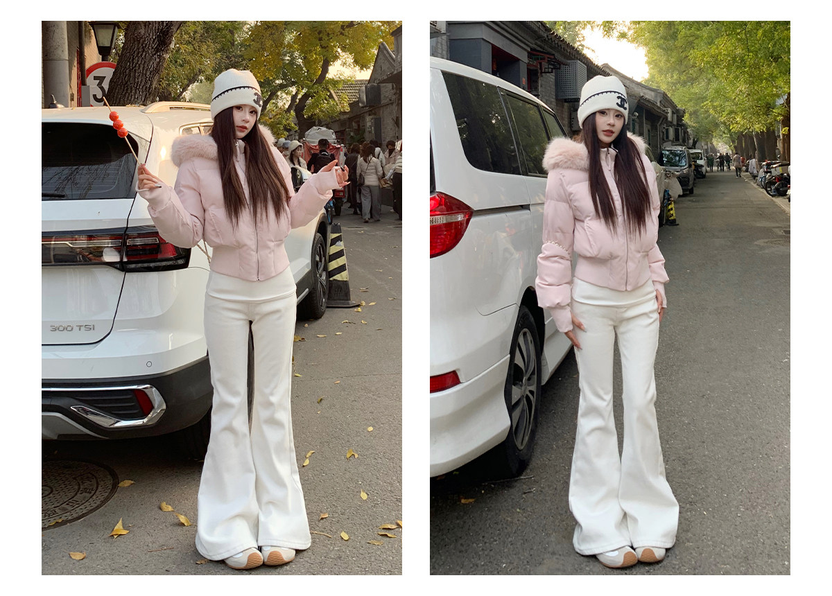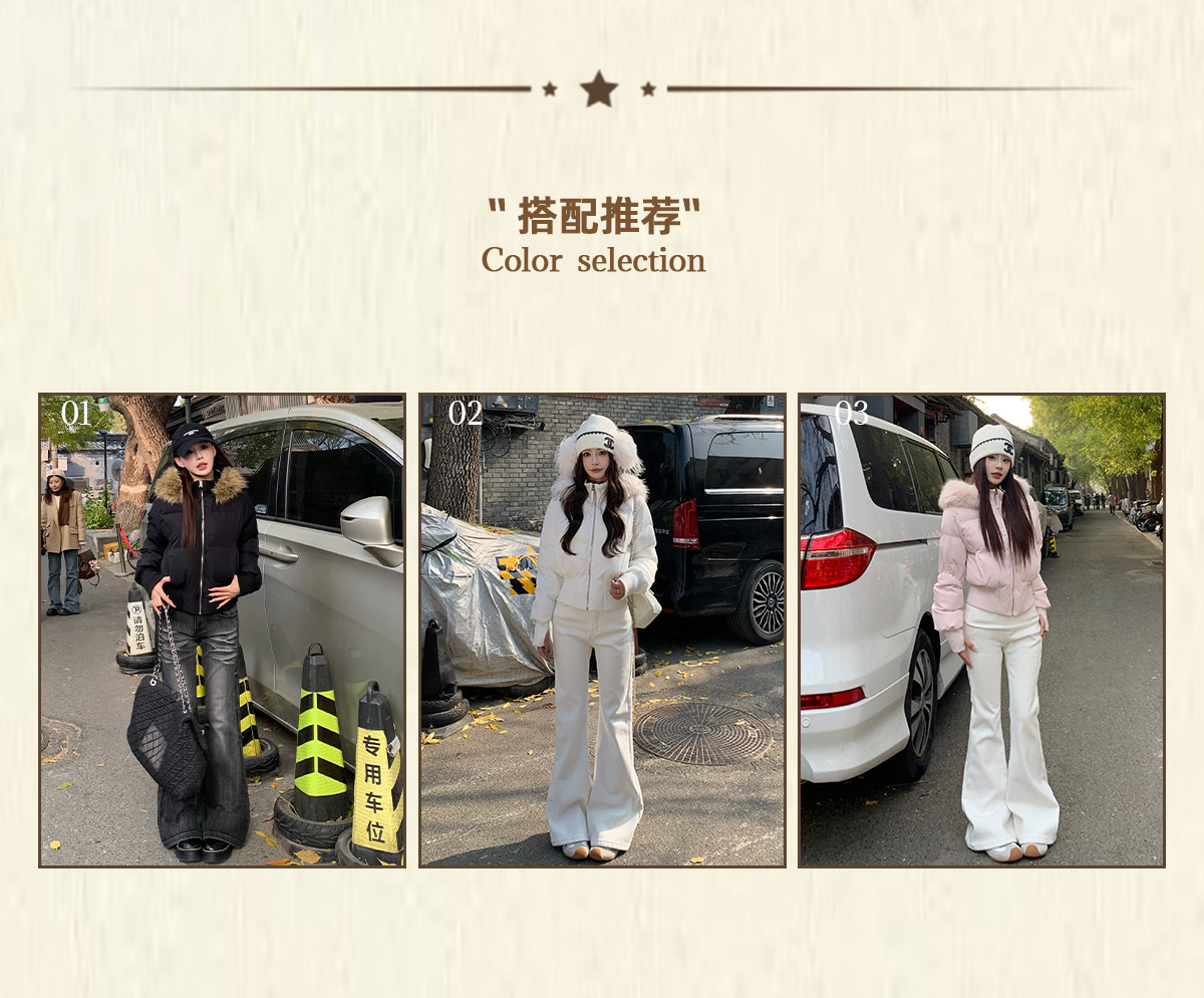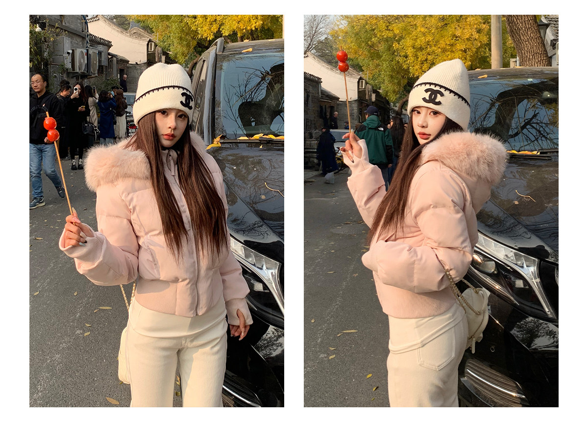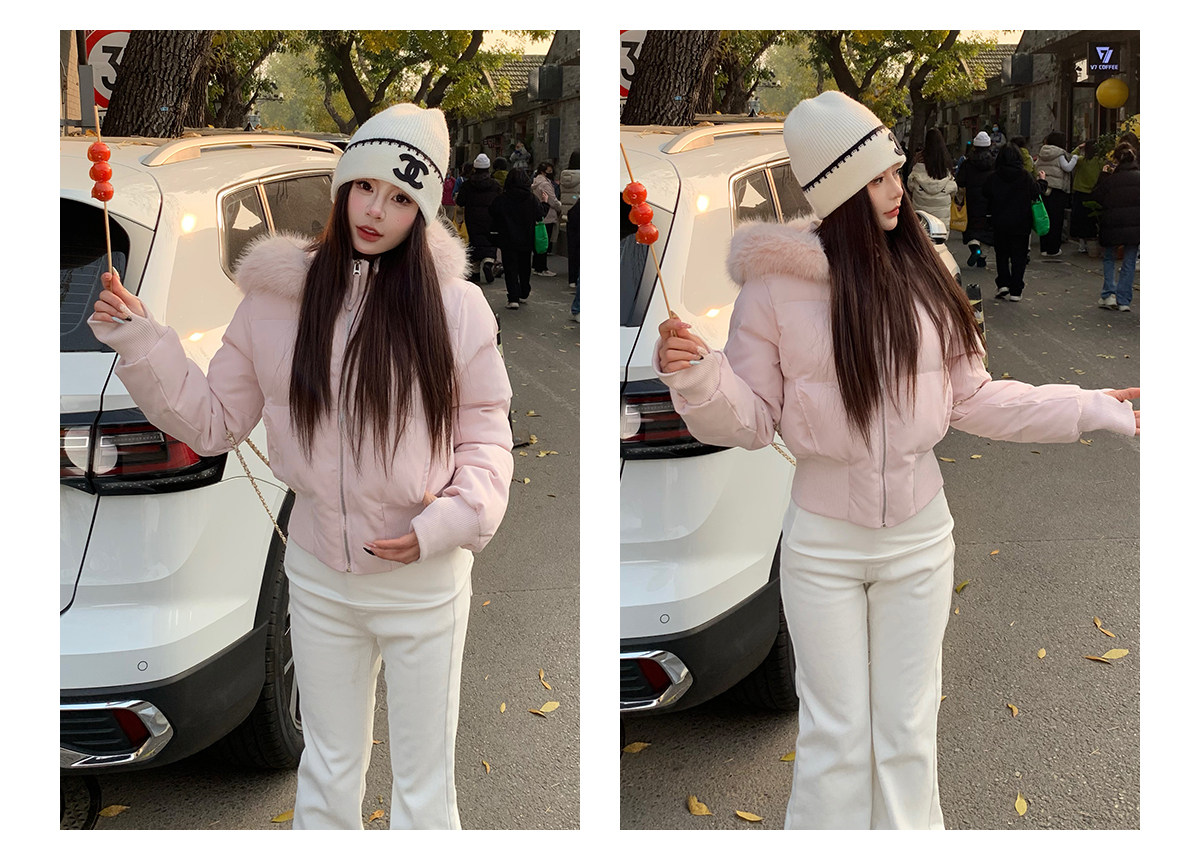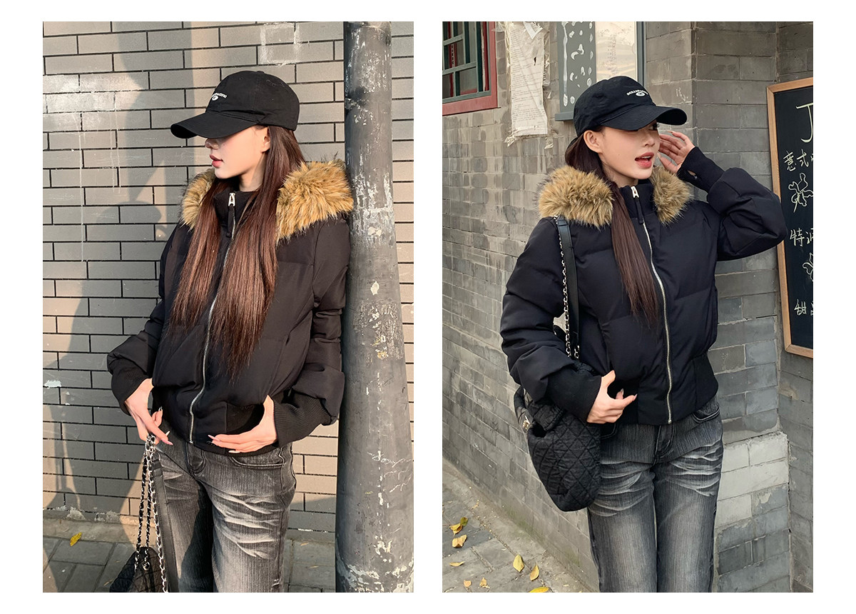 3Mer Oh Oh Sanmei Detachable Fur Collar Hooded down Cotton Jacket for Women, Winter Thickened Waist-Cinching Short Cotton Coat