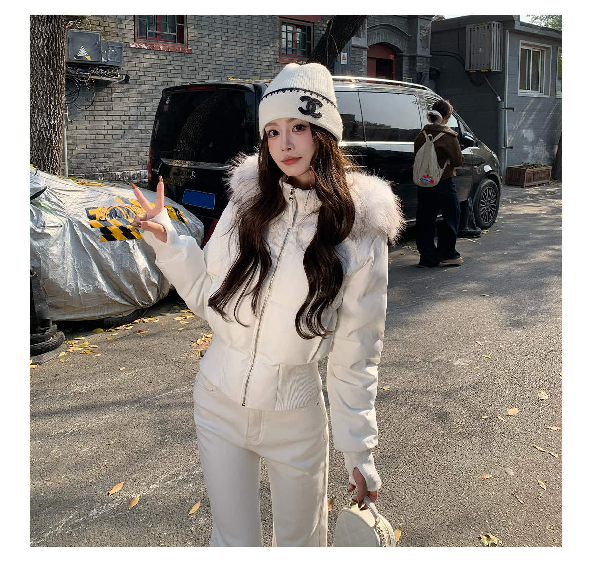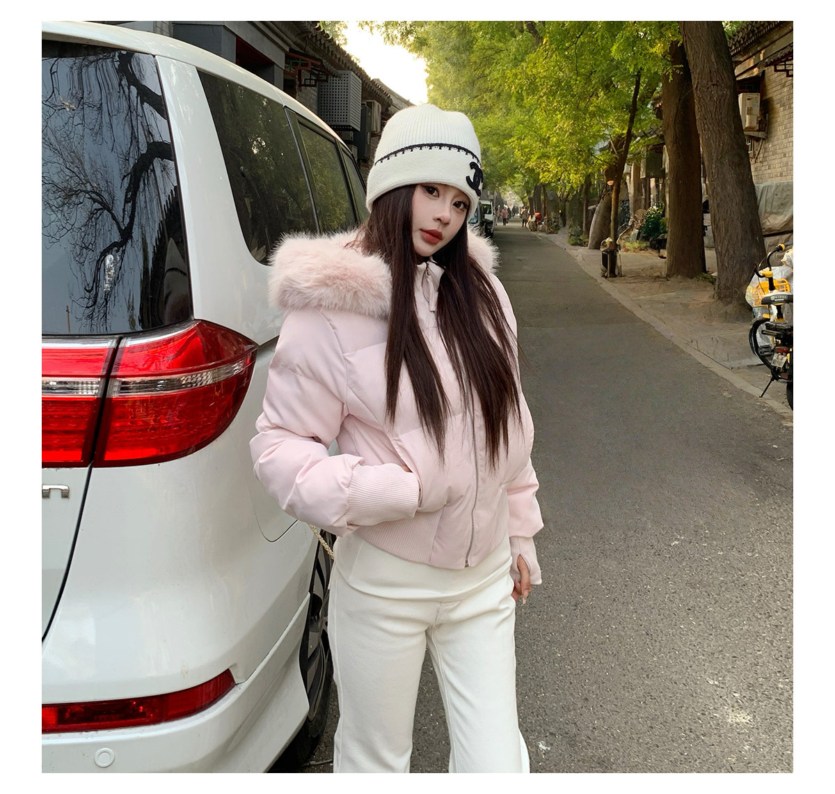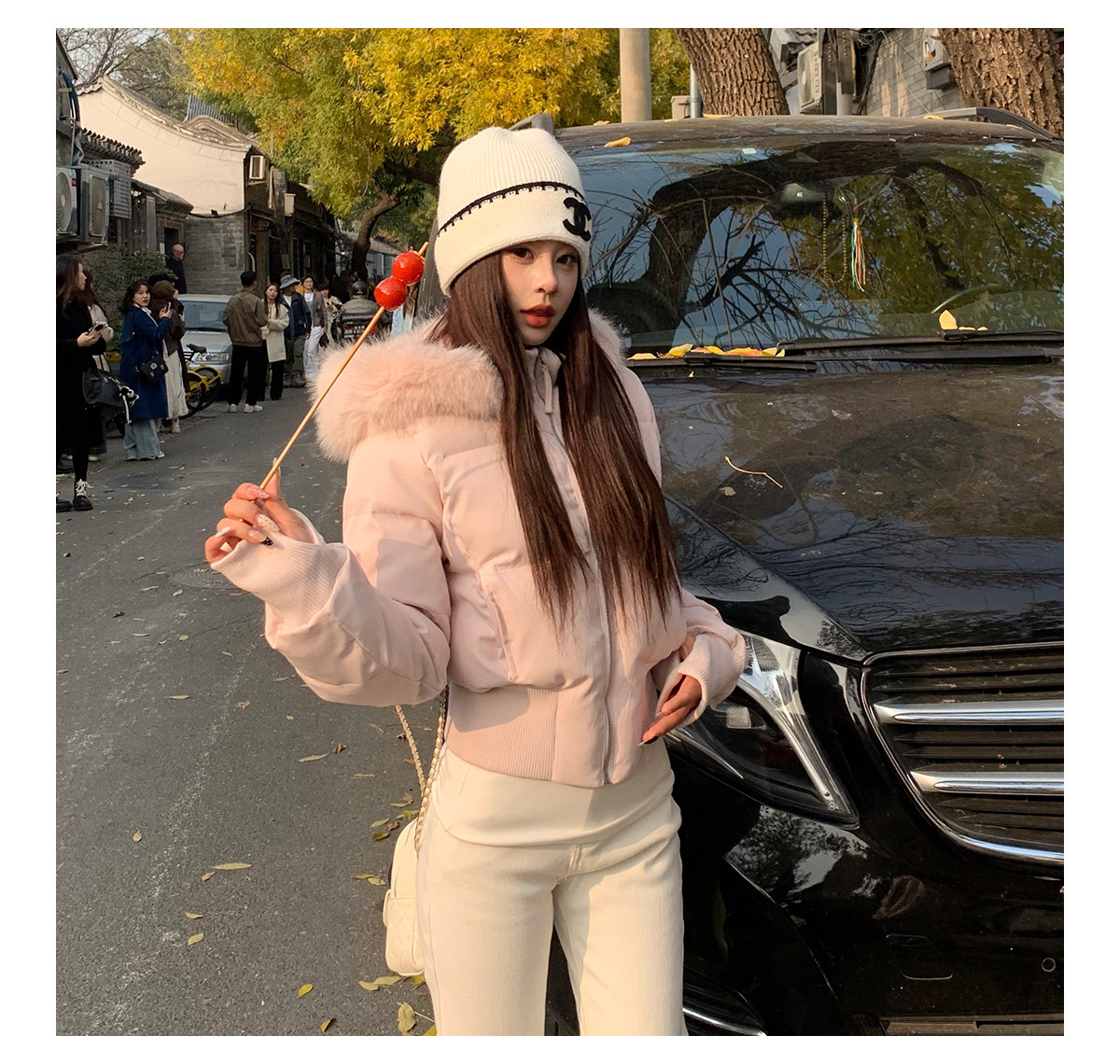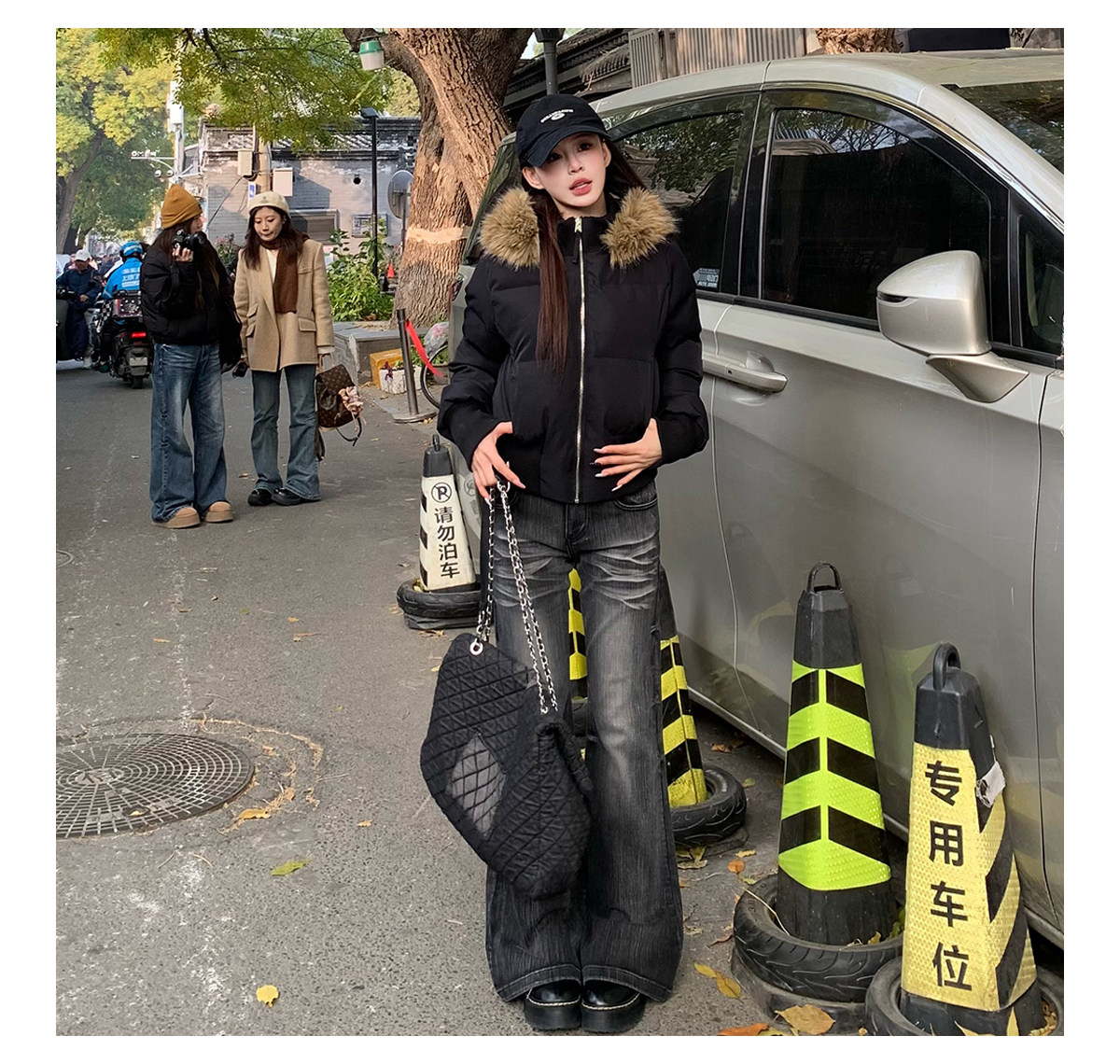3Mer Oh Oh Sanmei Detachable Fur Collar Hooded down Cotton Jacket for Women, Winter Thickened Waist-Cinching Short Cotton Coat