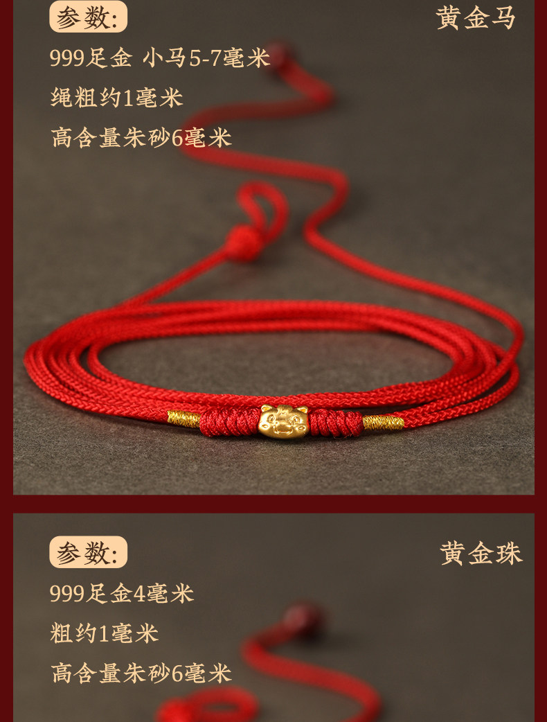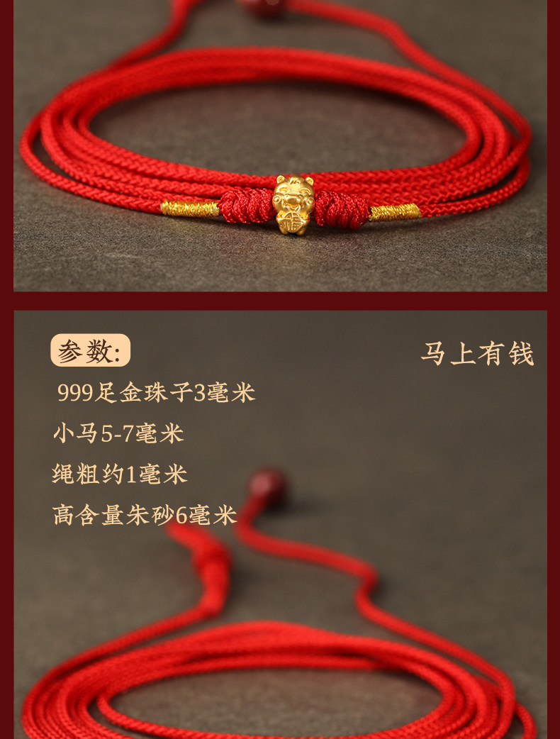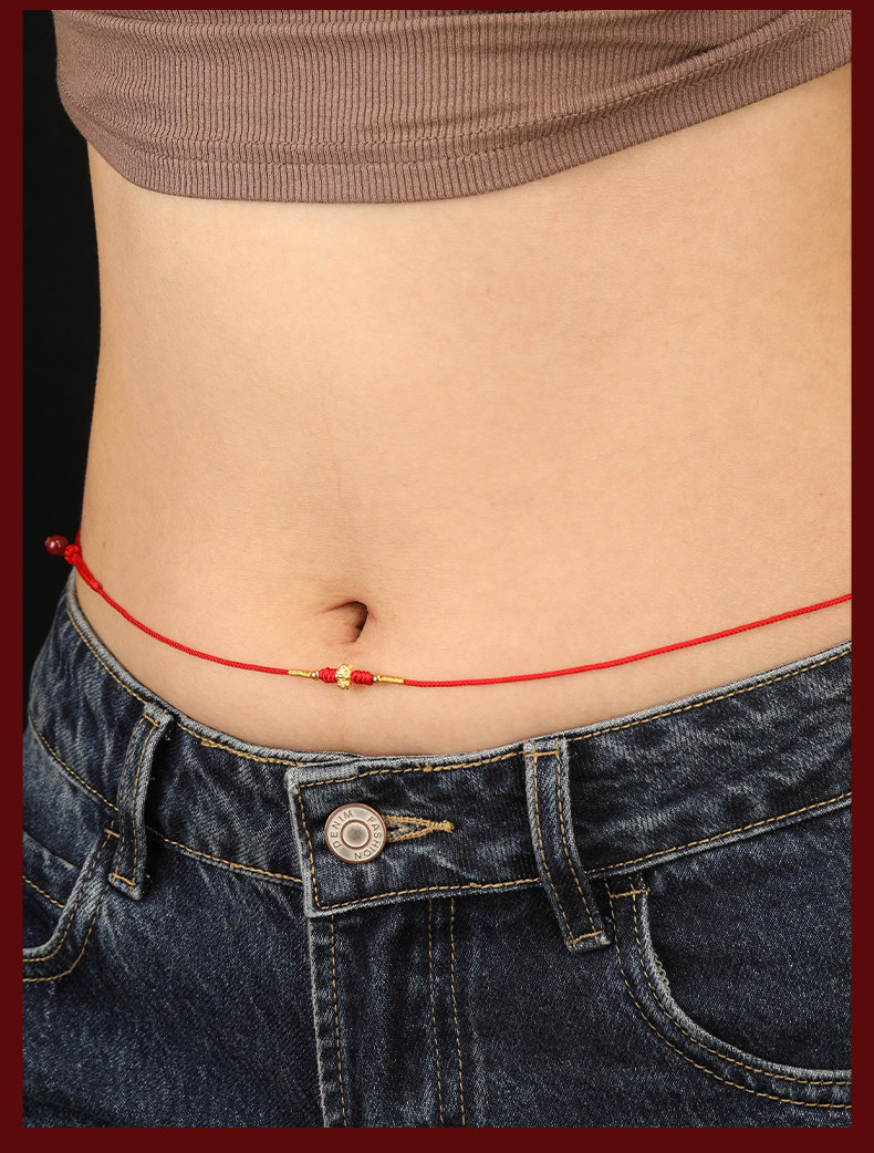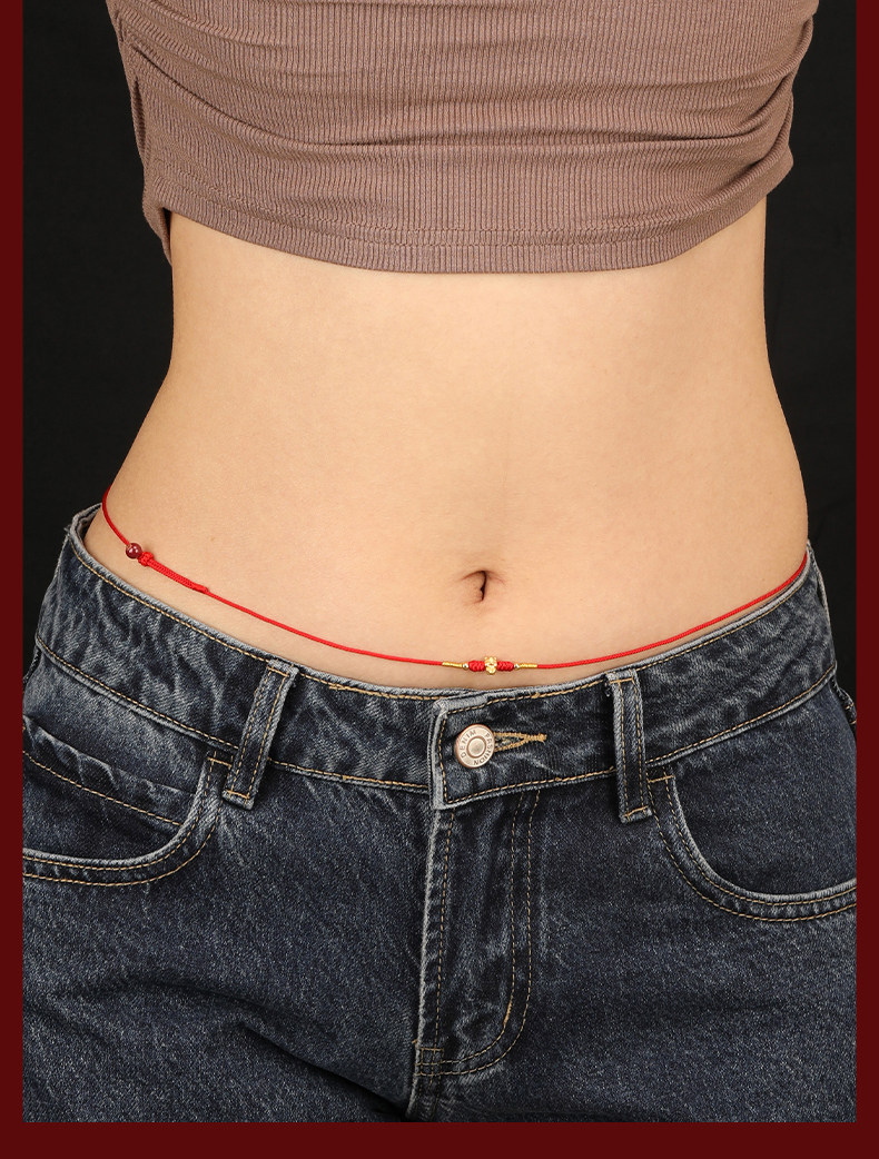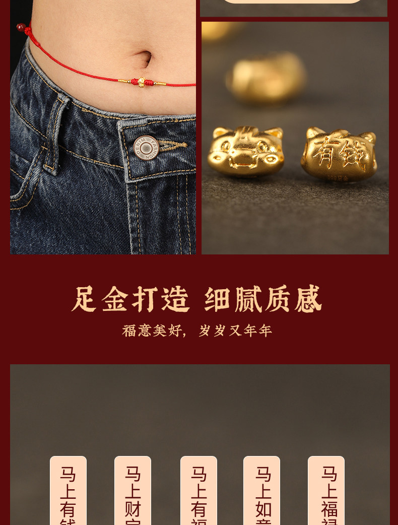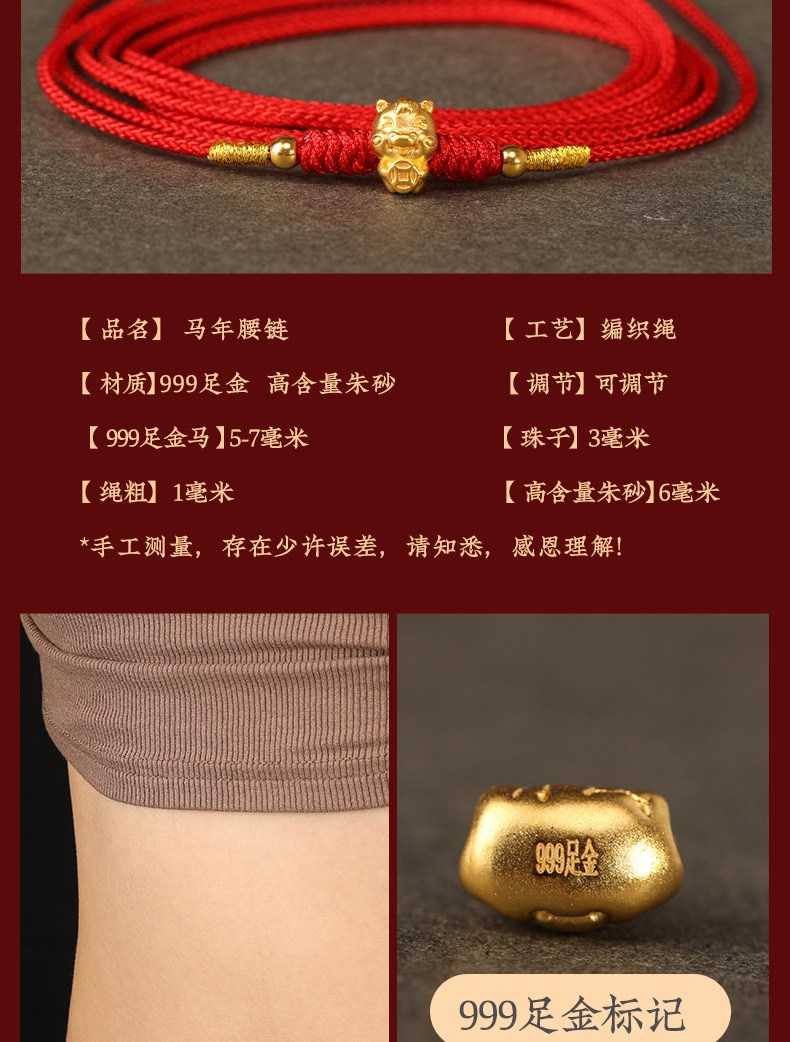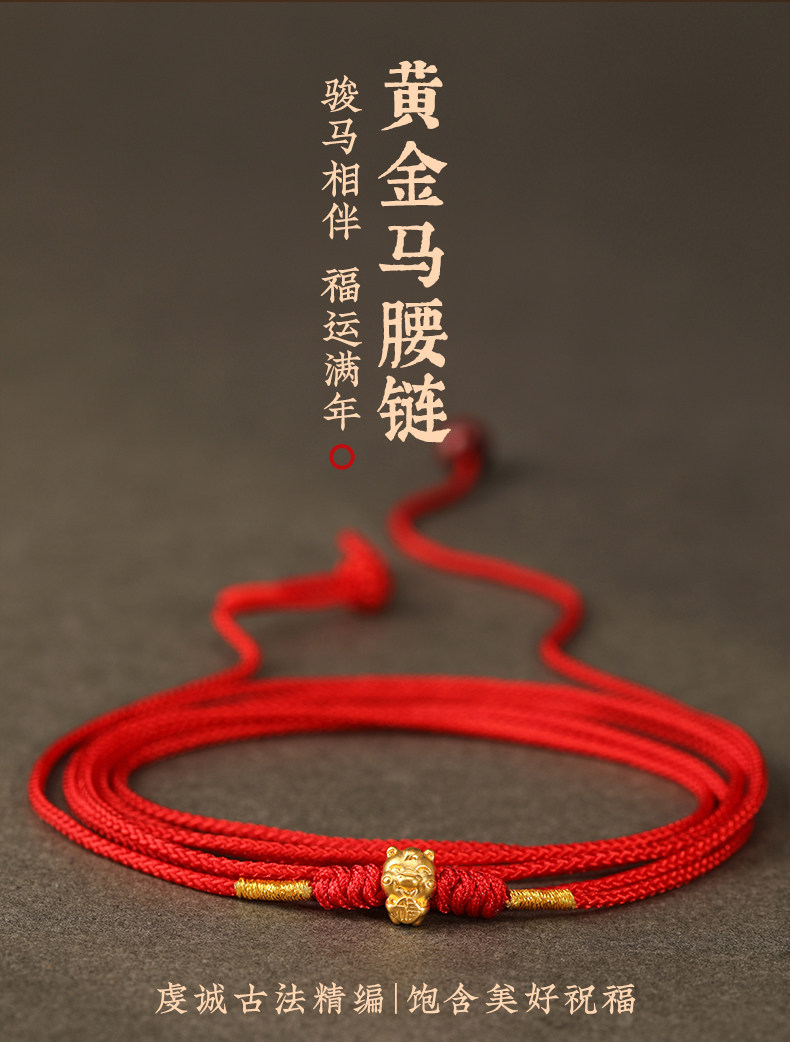 Gold Horse Year Zodiac Year 999 Pure Gold Money-Attracting Waist Chain for Women, Auspicious Red Waist Rope, Unisex Fortune Bead Red Rope