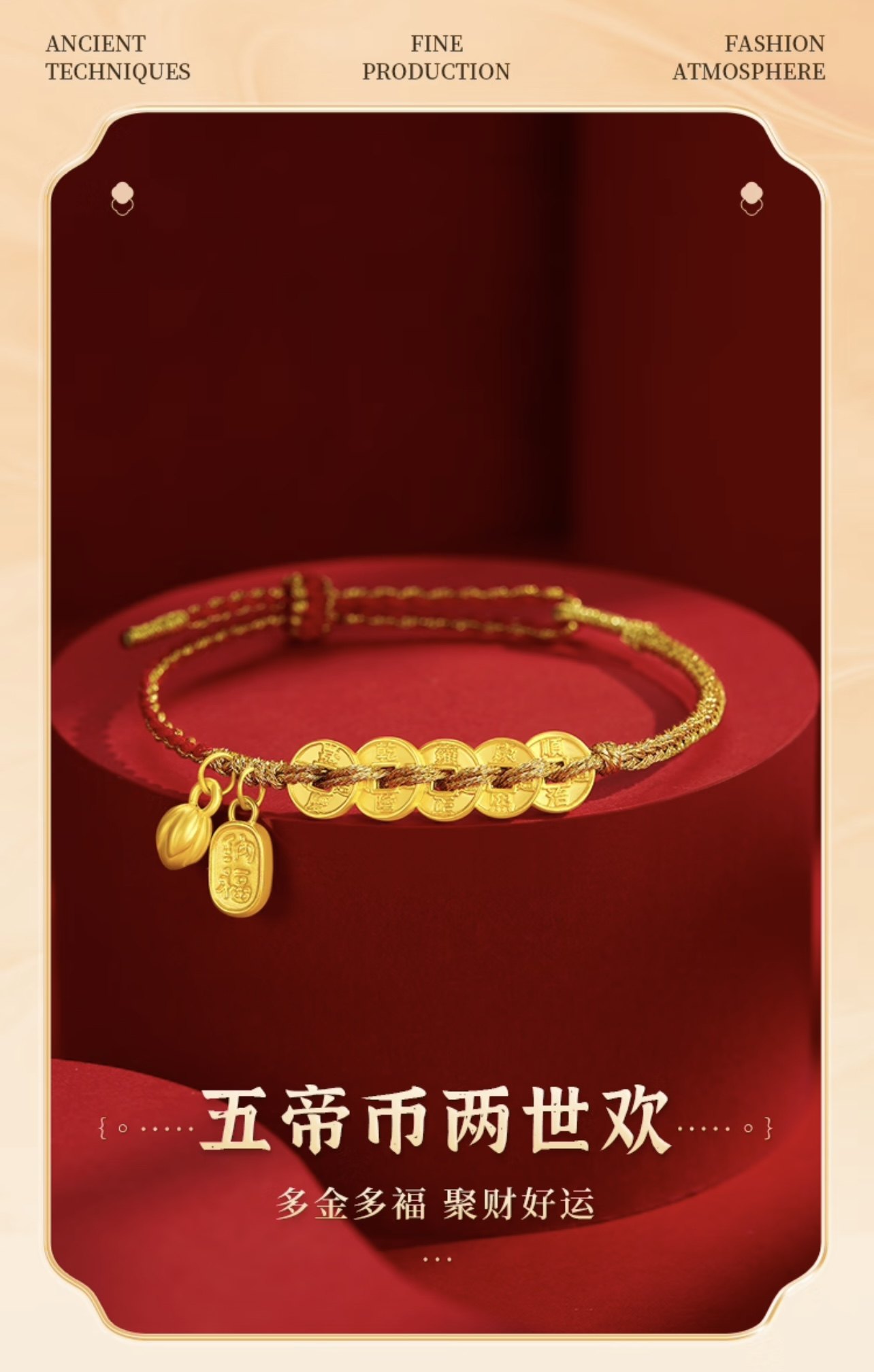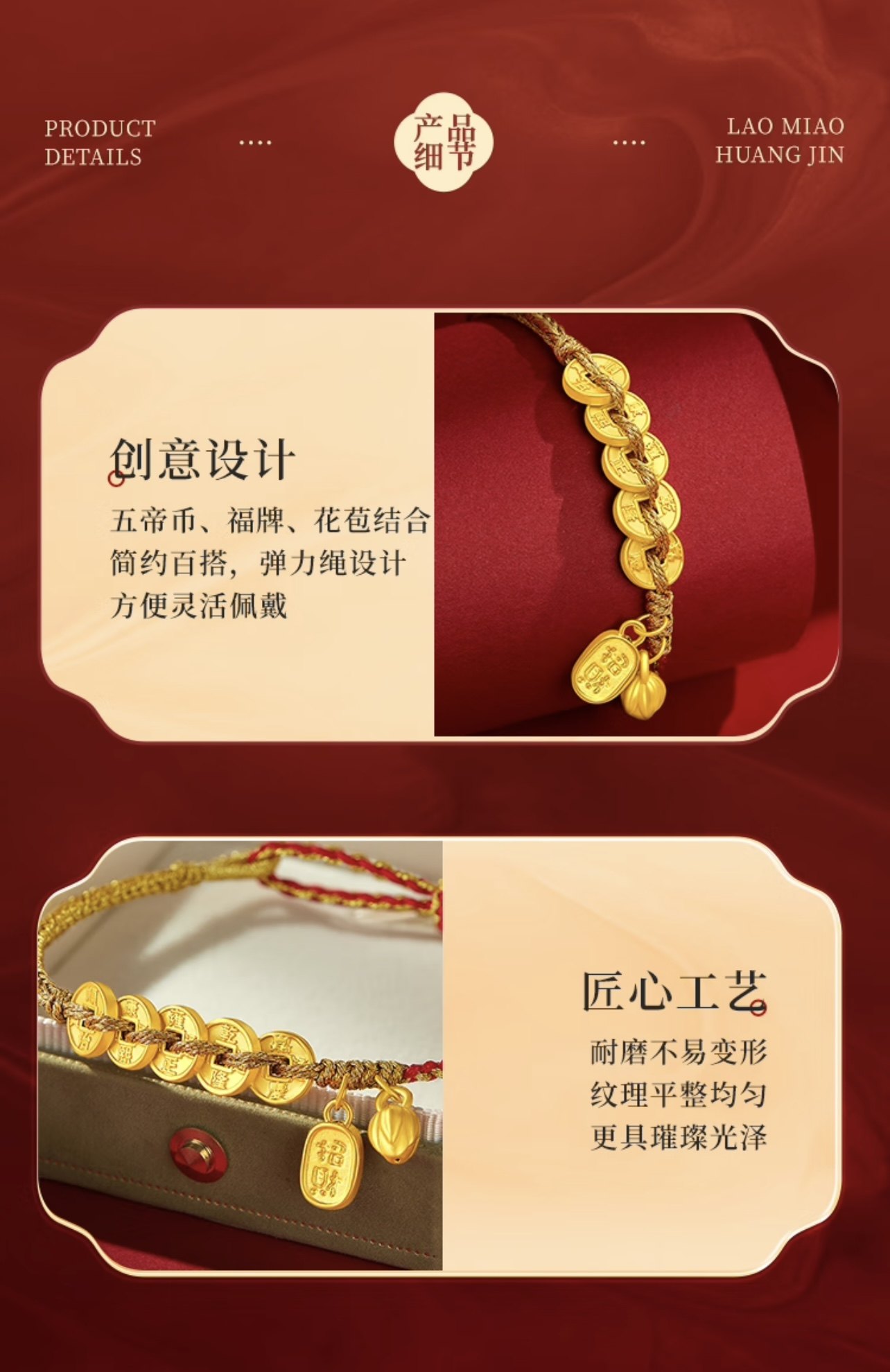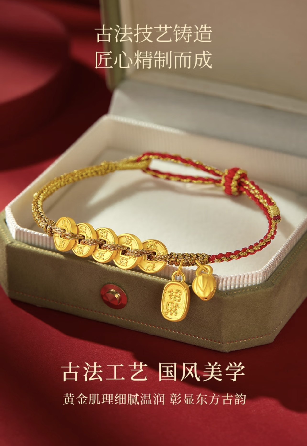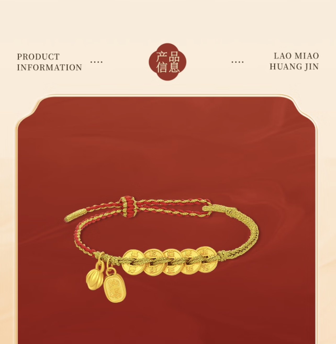 Old Temple Gold Bracelet with Five Emperors Coins and Red String for the Year of Birth, Gold for Wealth and Good Fortune, Gift for Girlfriend or Valentine's Day