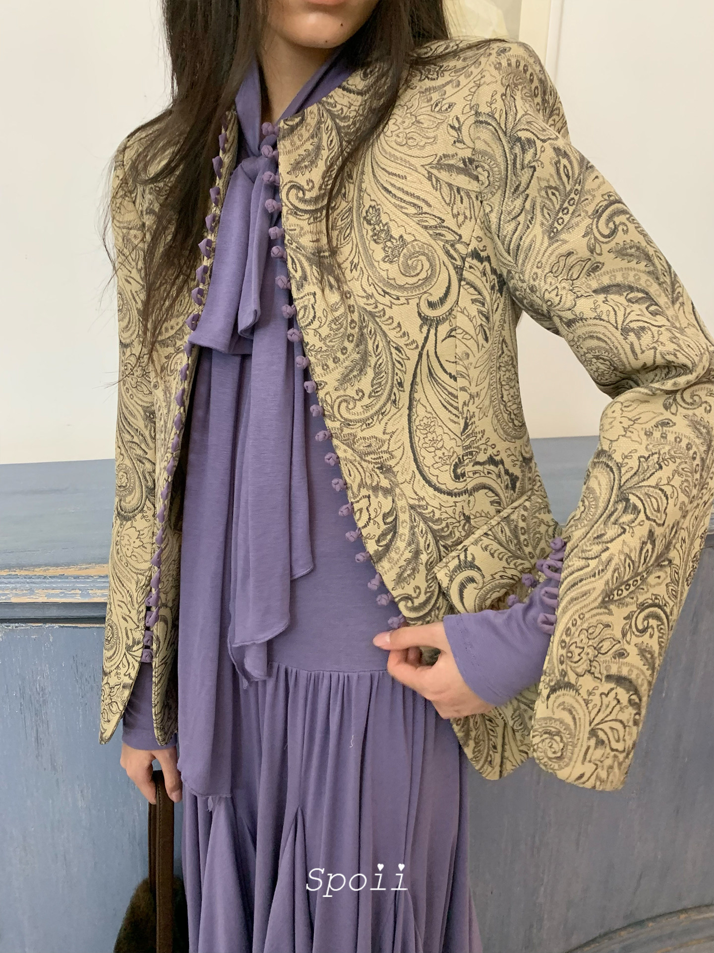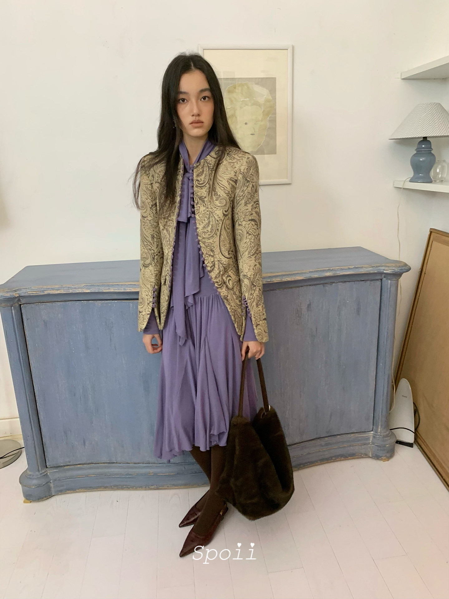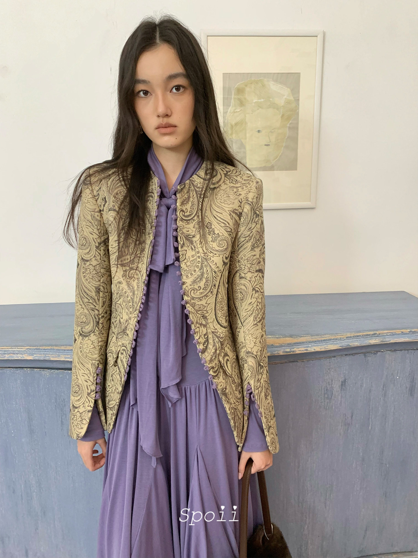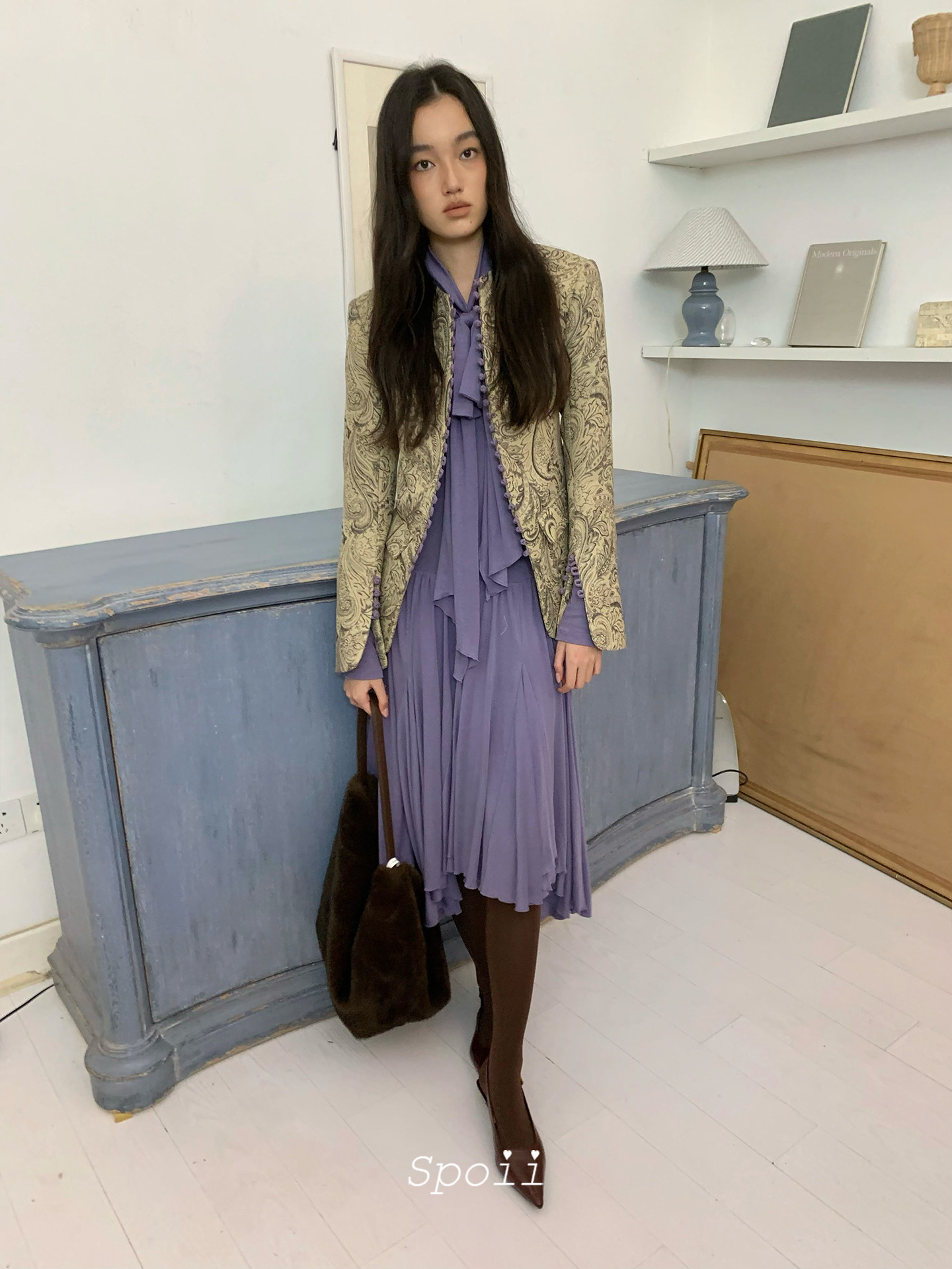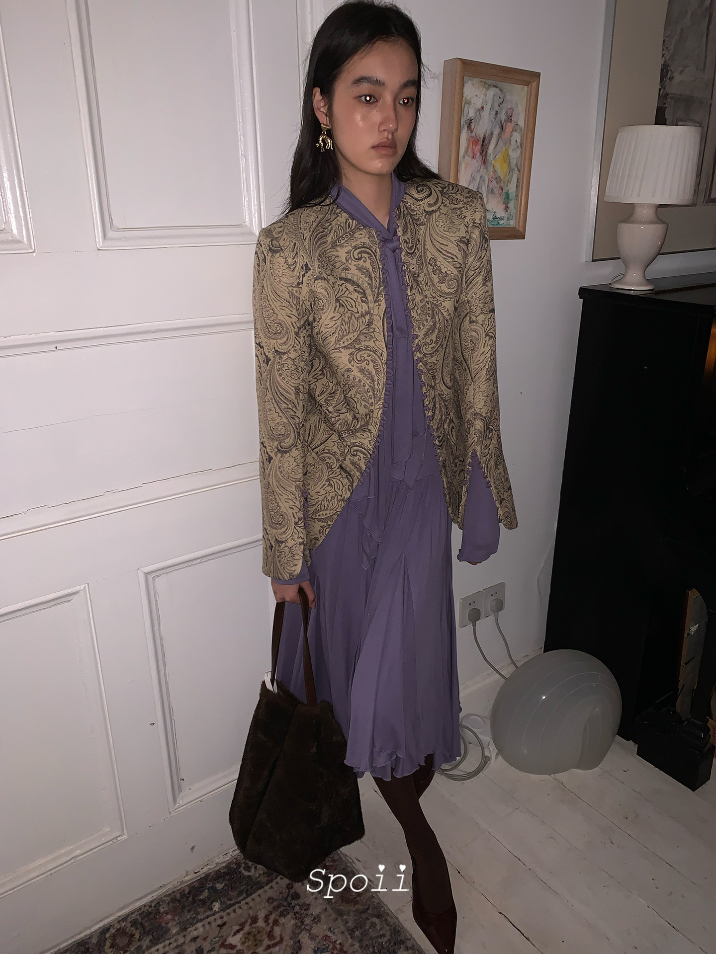Spoii Khaki Retro Paisley Pattern Purple Buttoned Suit Jacket/Purple Bow Dress