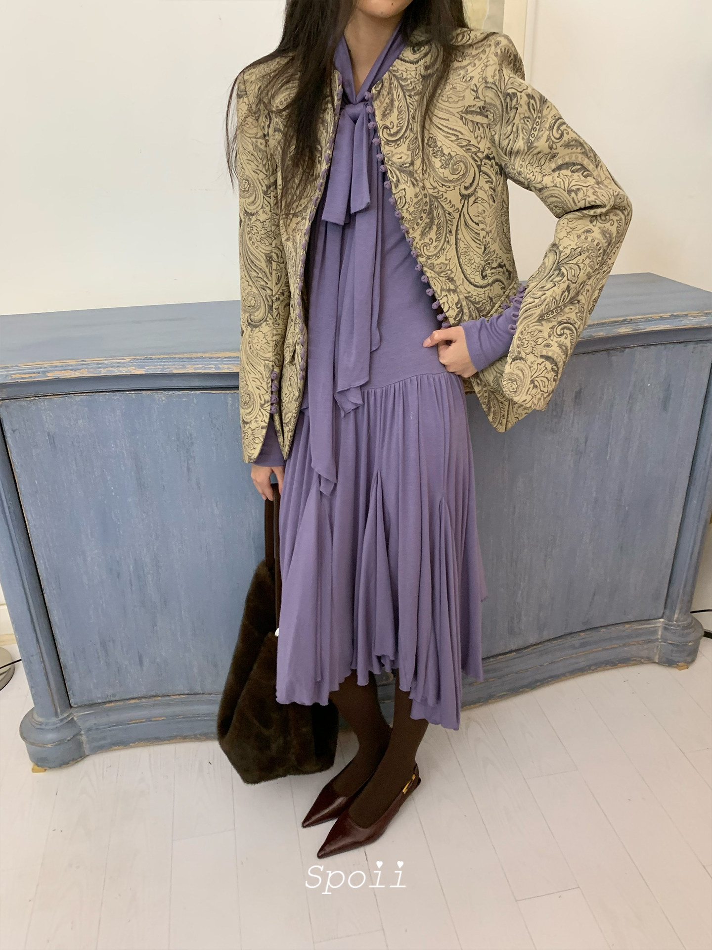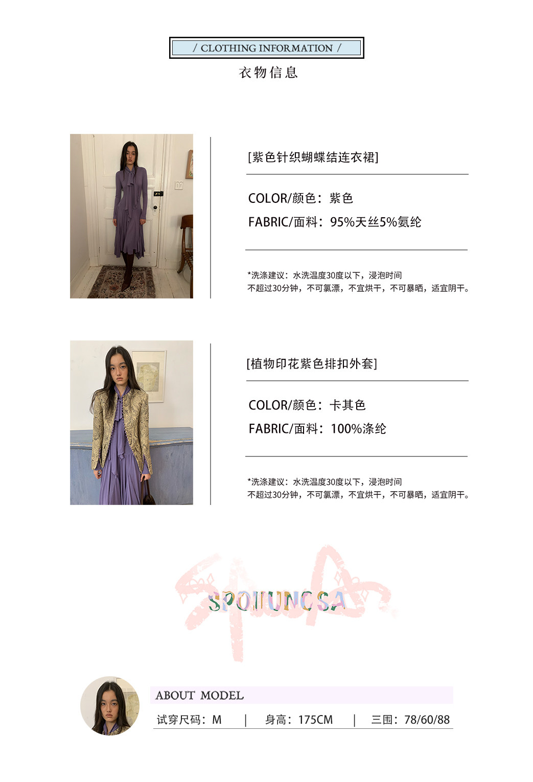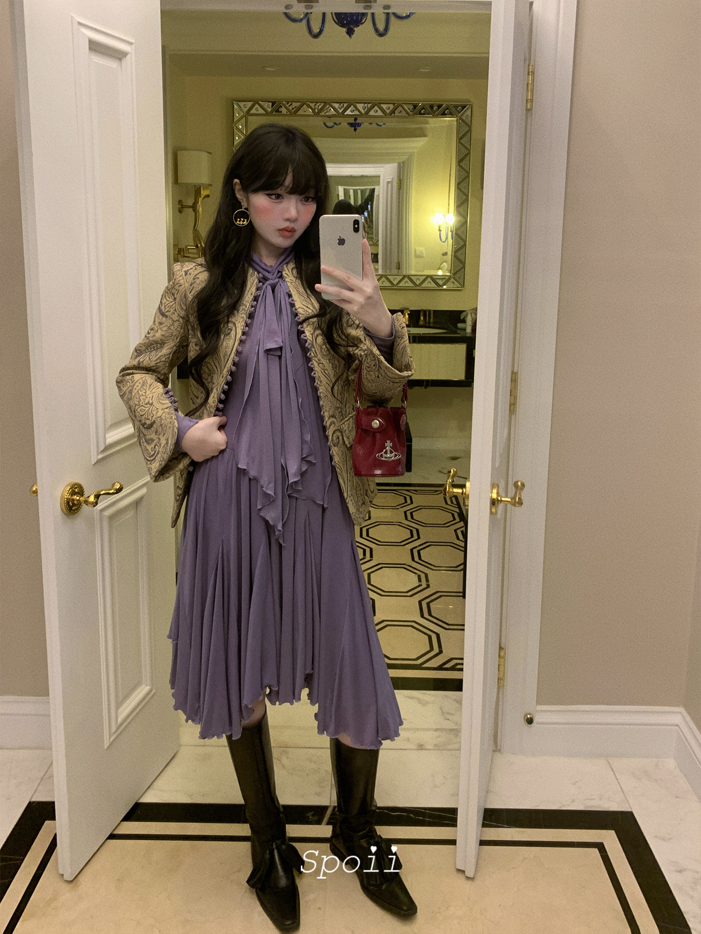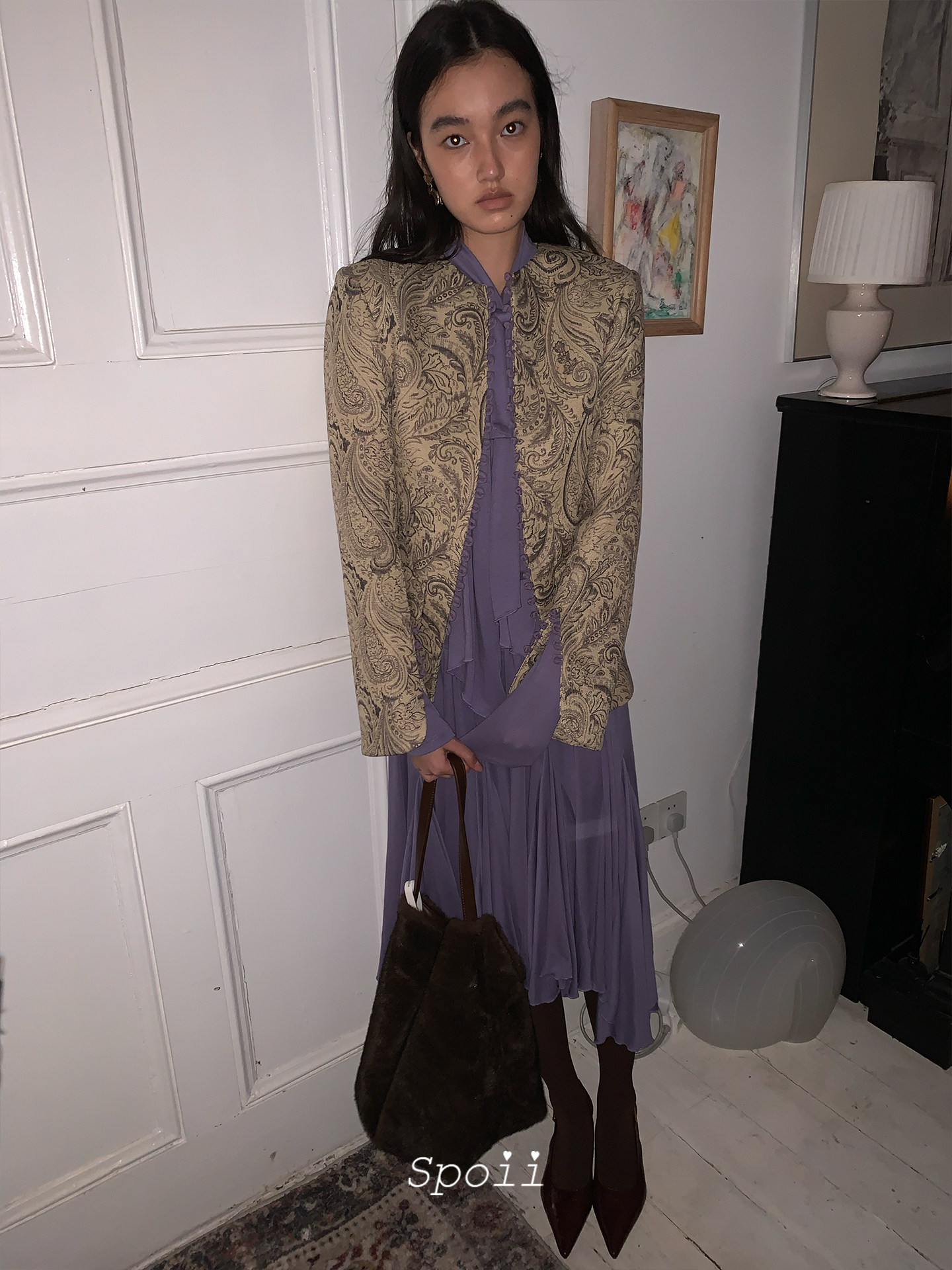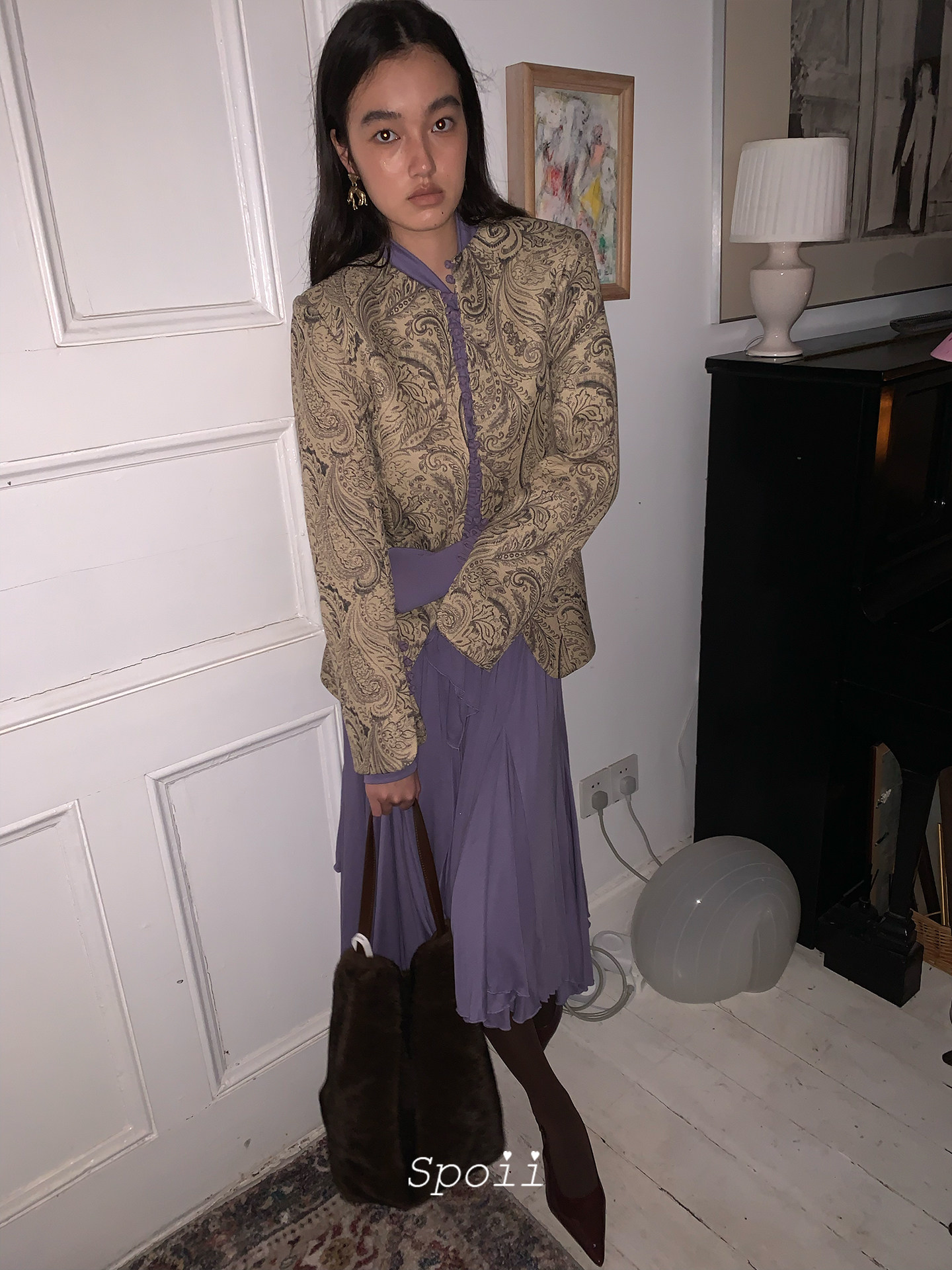 Spoii Khaki Retro Paisley Pattern Purple Buttoned Suit Jacket/Purple Bow Dress
