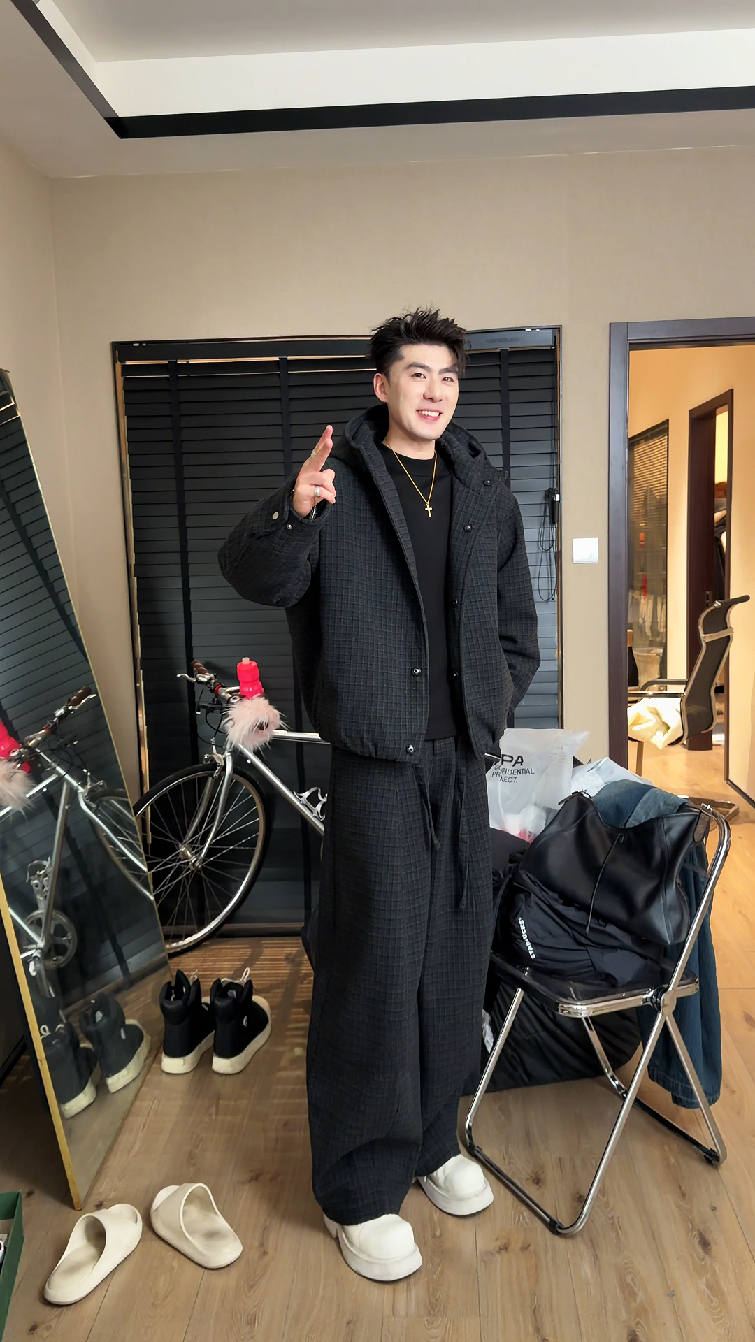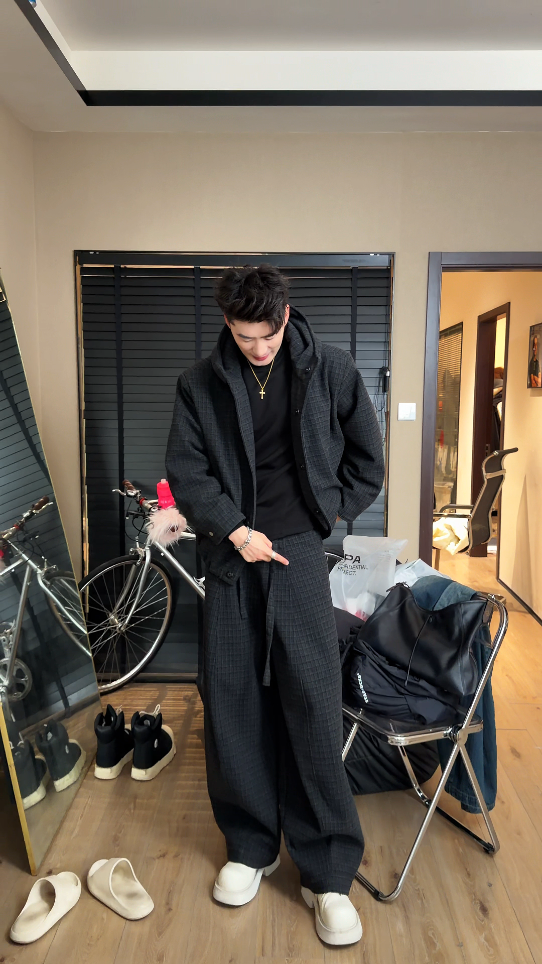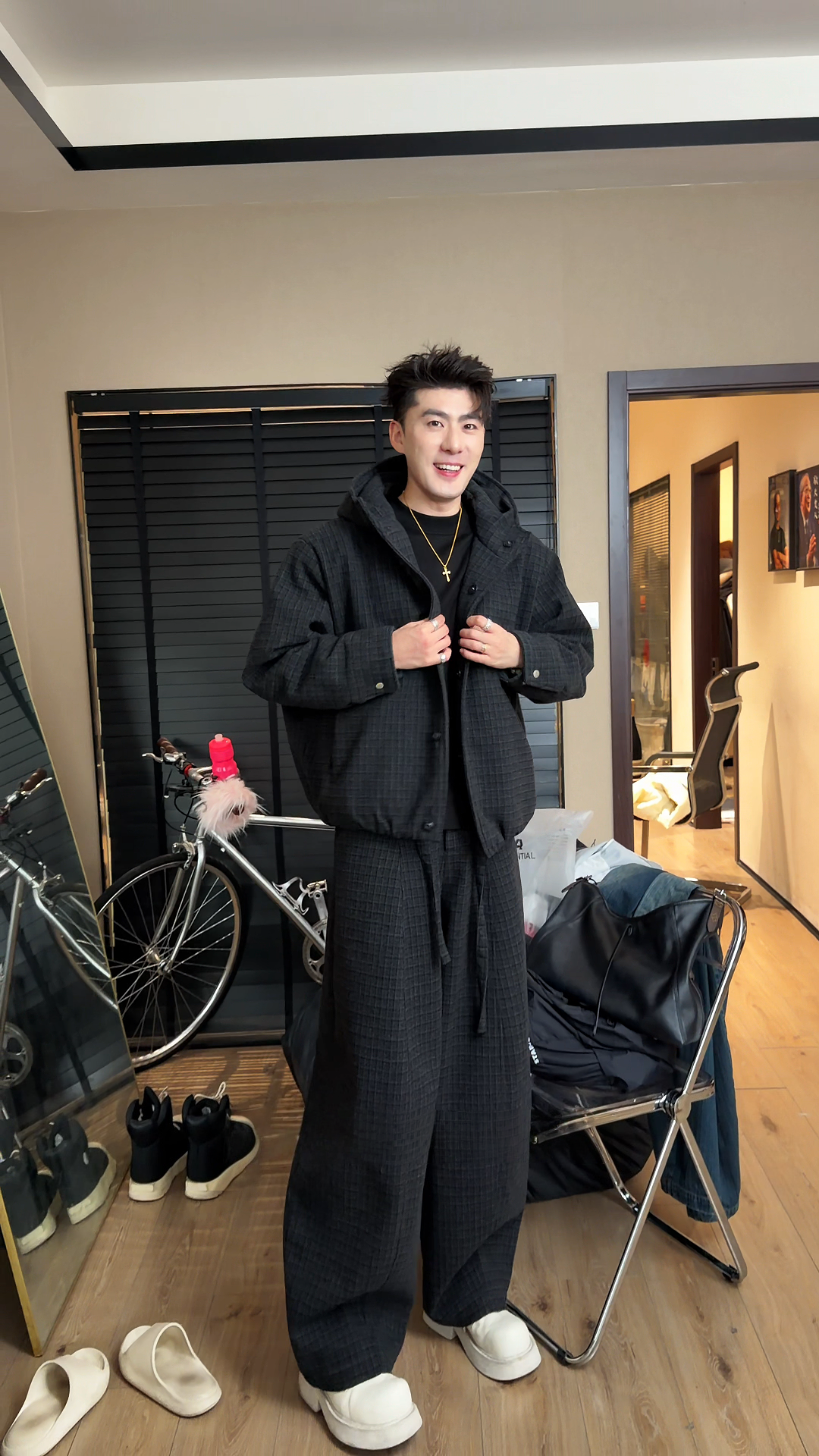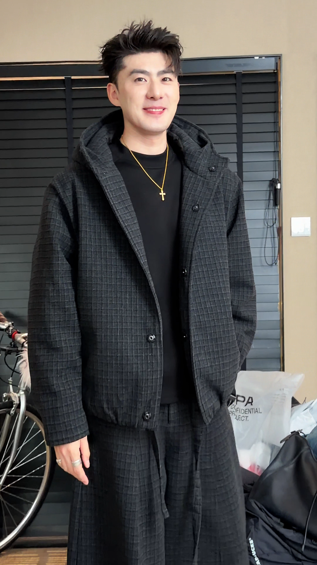 High-End Plaid Hooded Suit for Men, Winter Style, Thickened Jacket, Wide-Leg Pants, Two-Piece Fashion Set