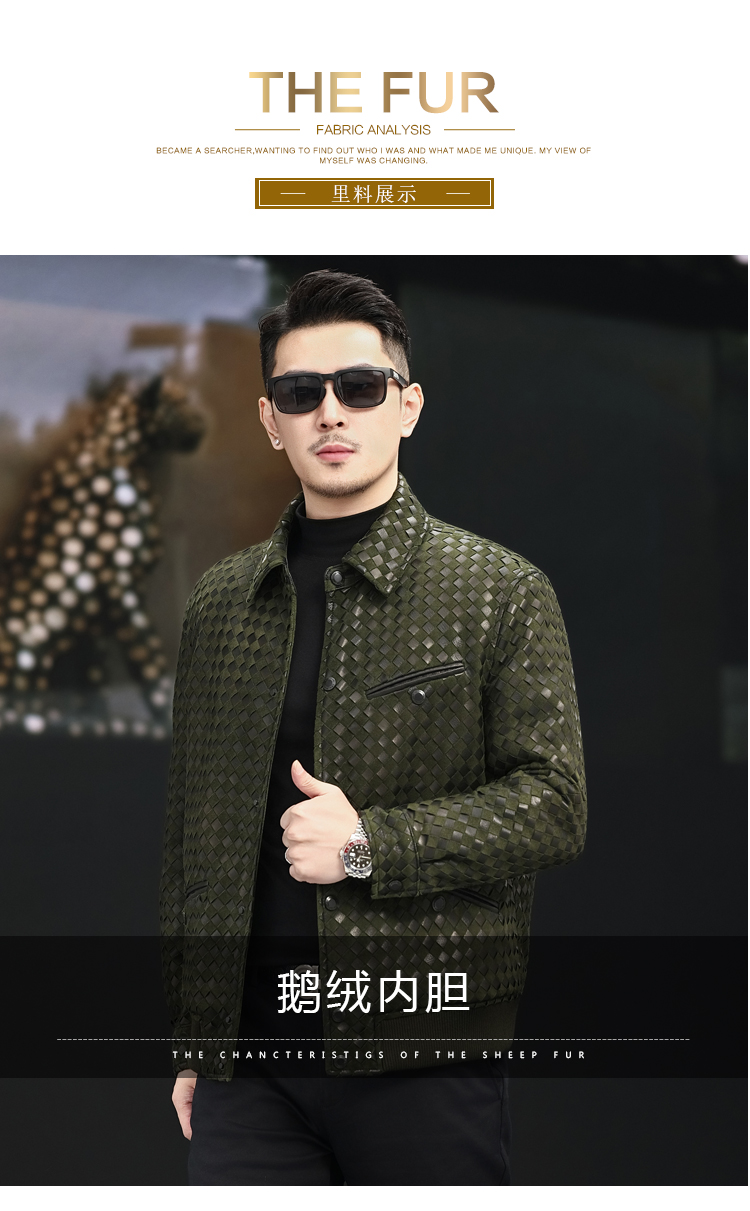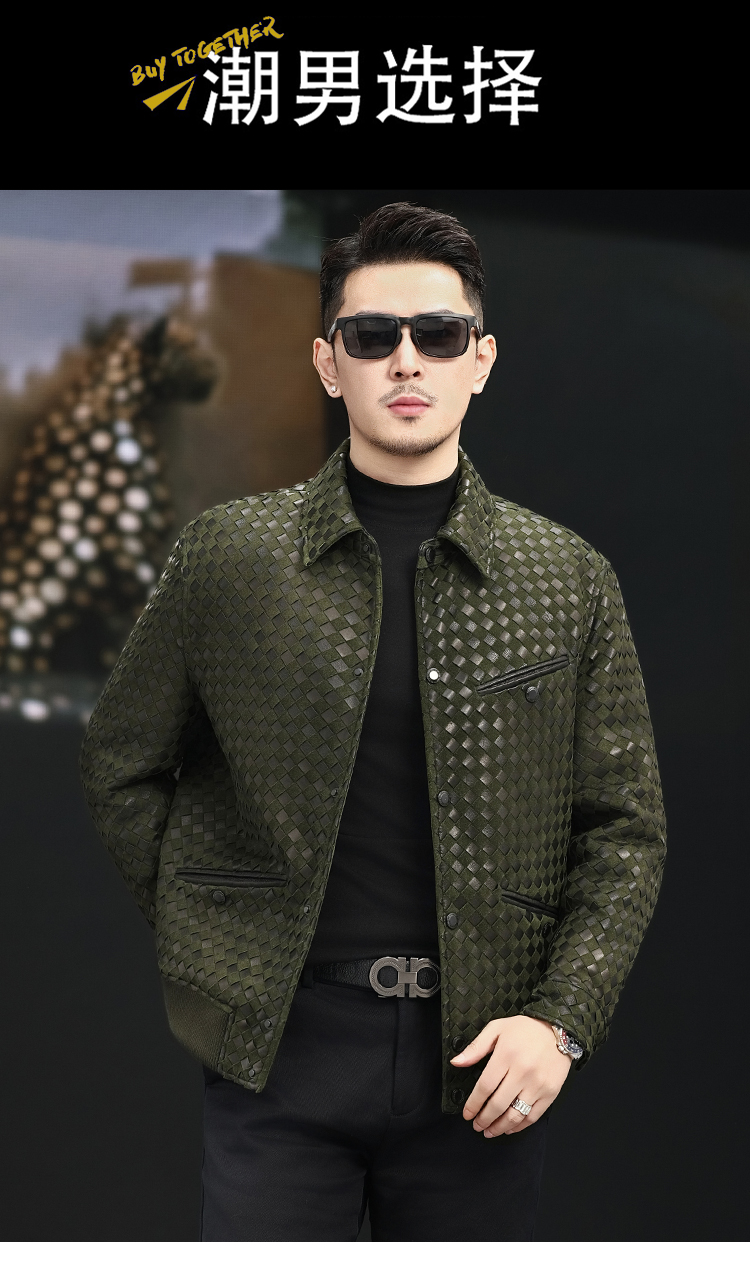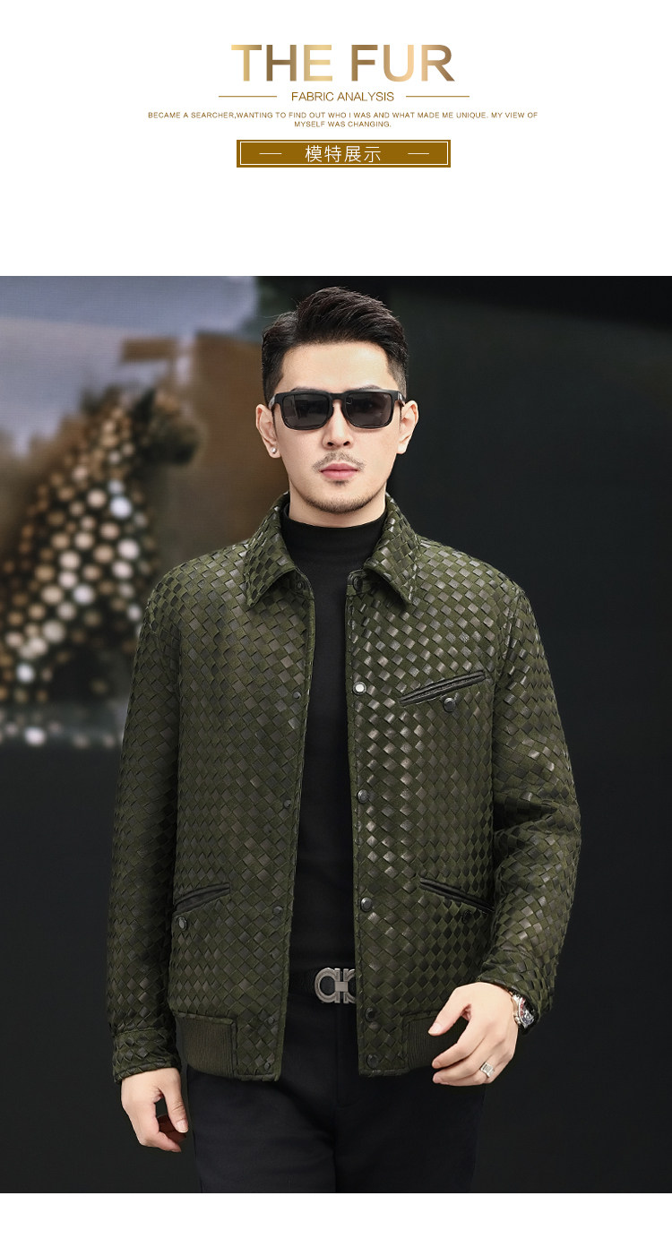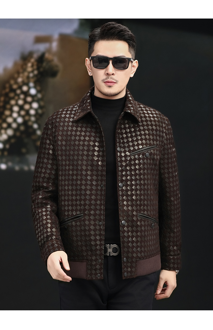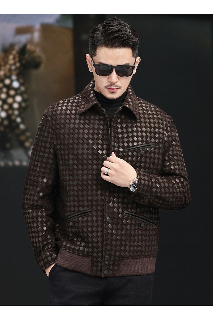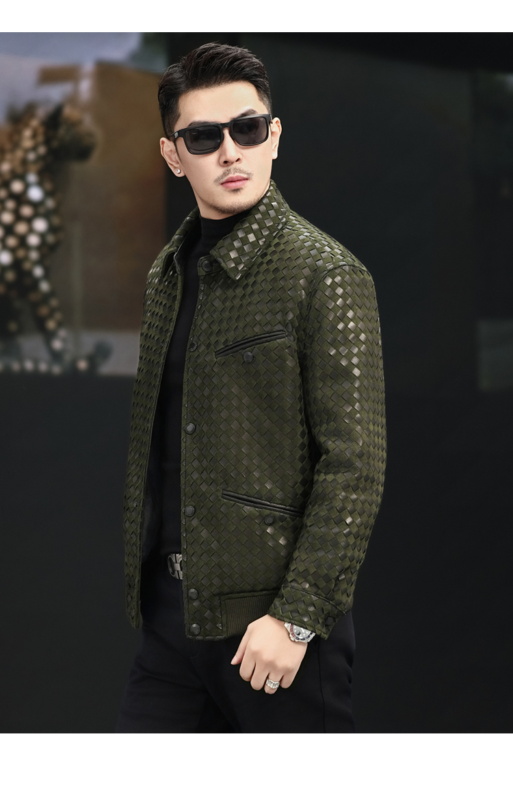High-End Light Luxury Trendy Handmade Woven Jacket Genuine Leather Goose down Coat Men's Leather Jacket Short Style with Lapel