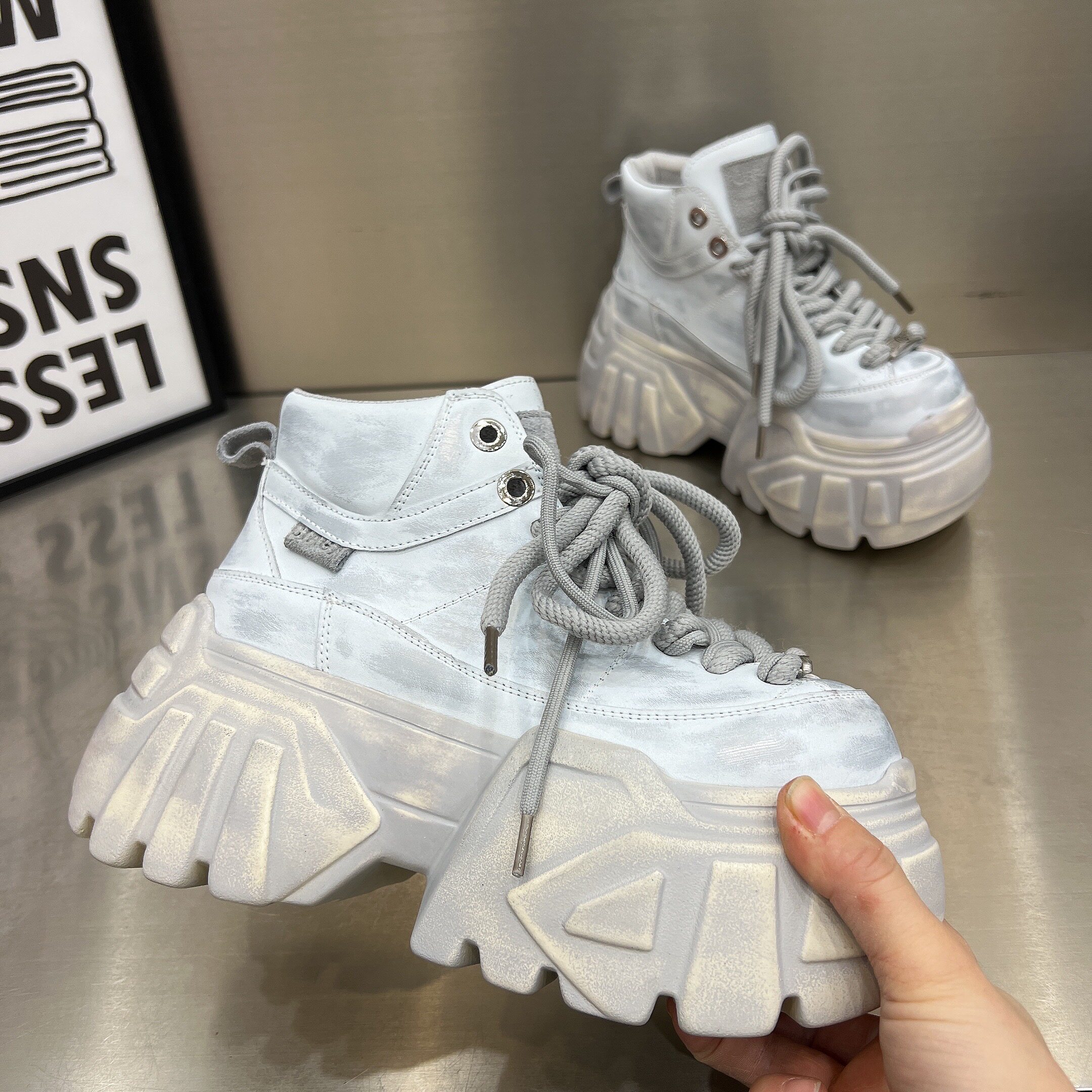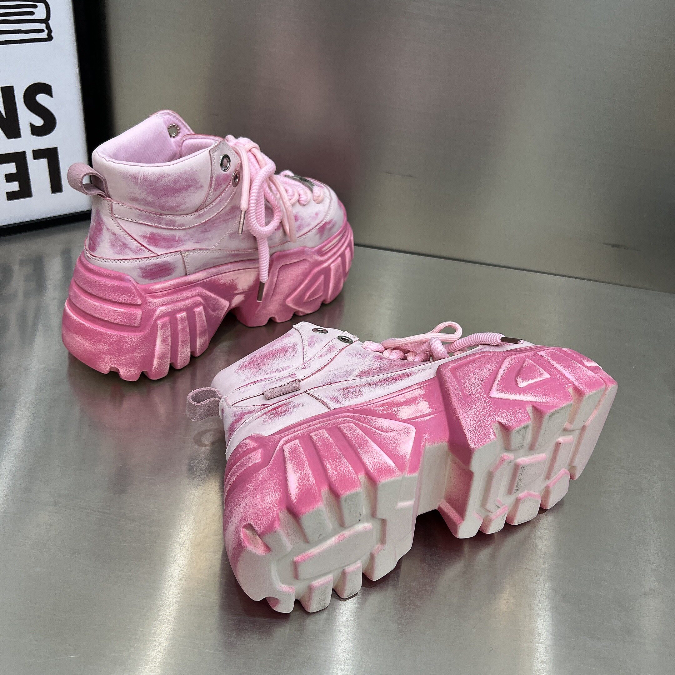 Worn-Out Color-Blocked Lace-Up Casual Shoes for Women, Thick-Soled Platform, Ultra-High Heel, 7cm Pink High-Top Shoes for Petite Women