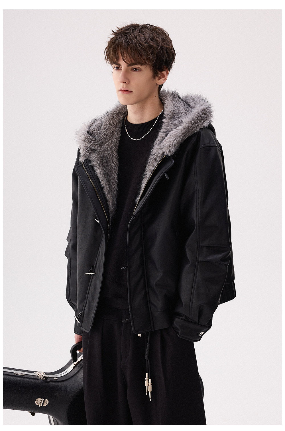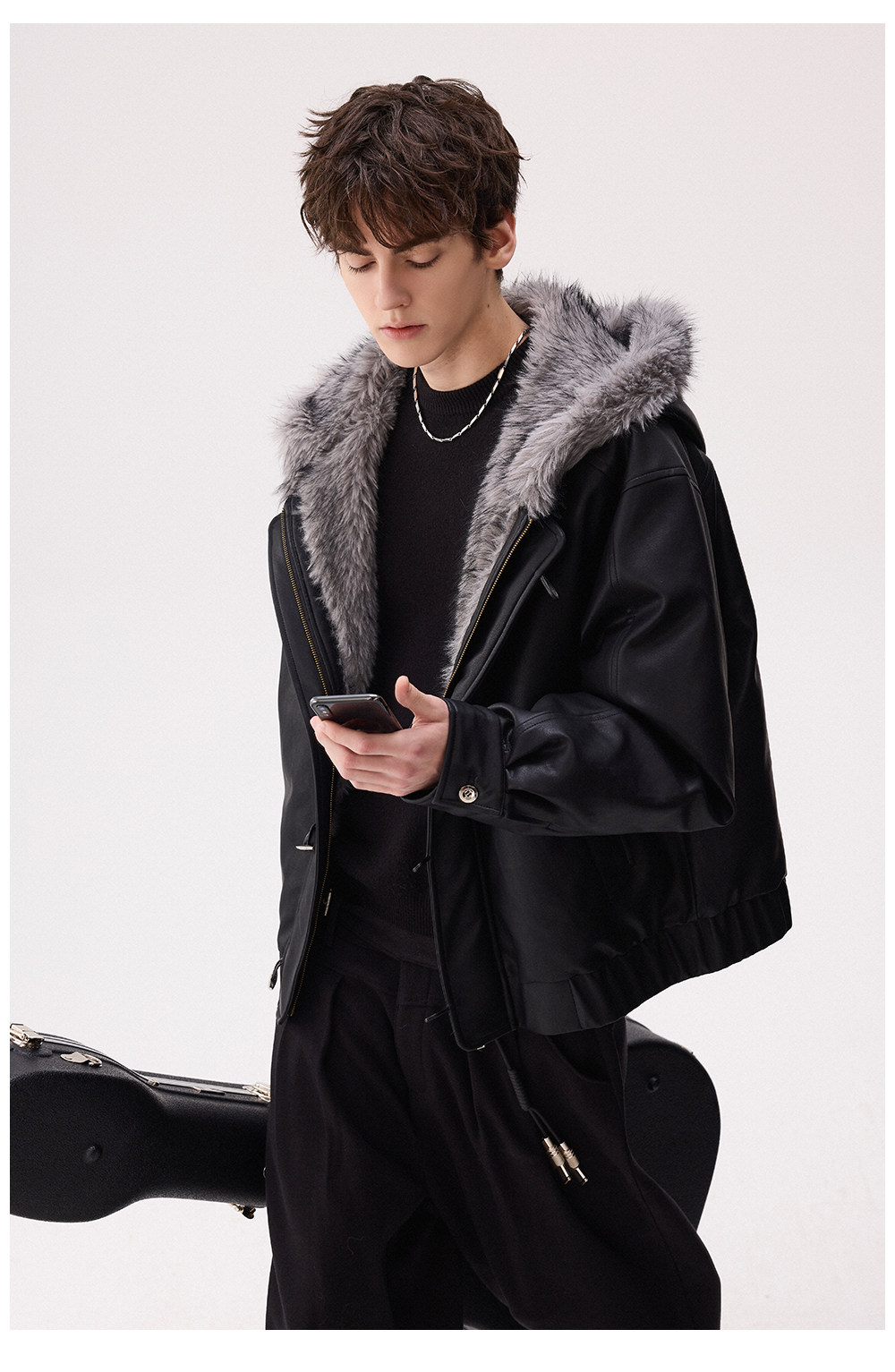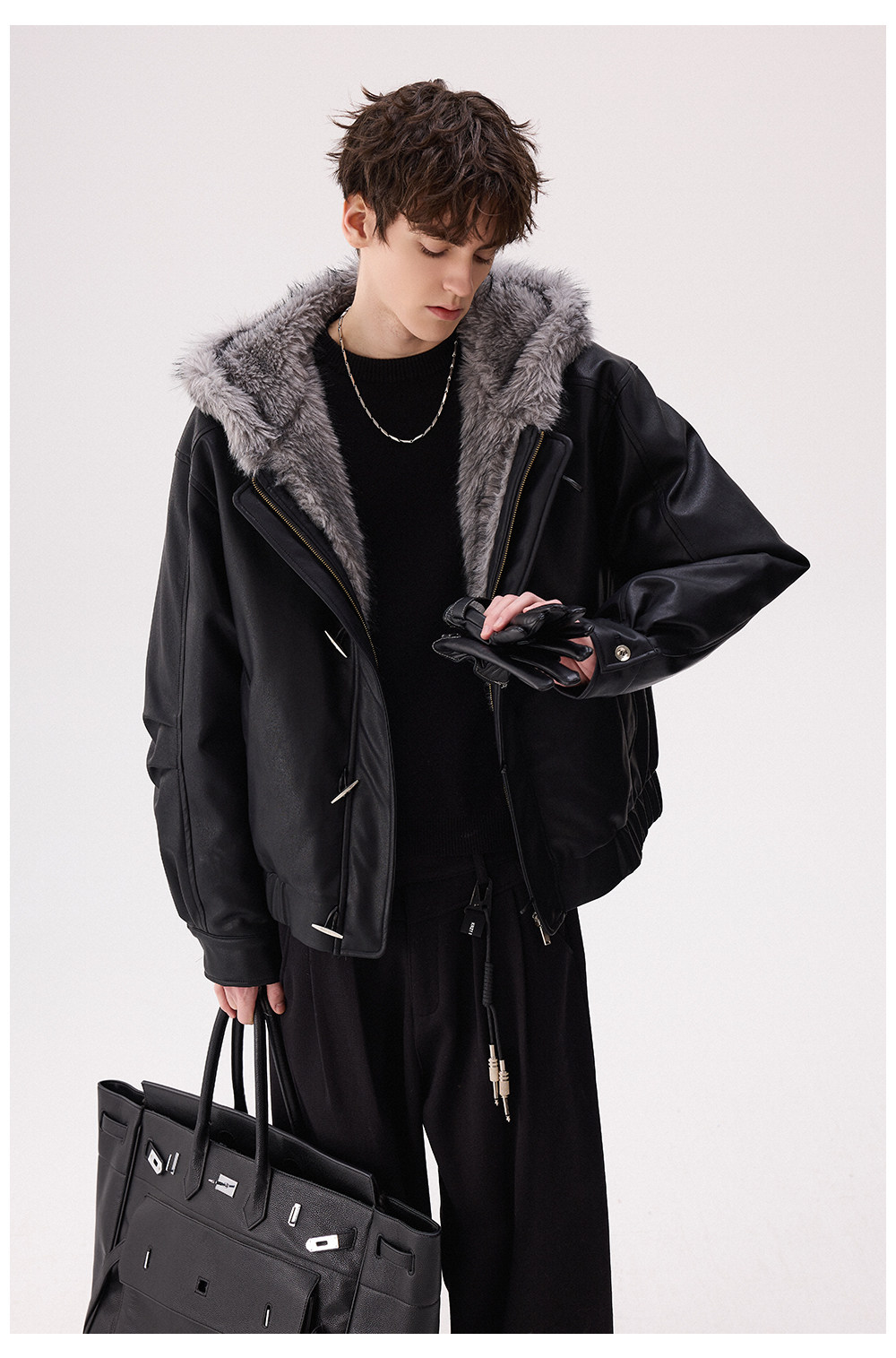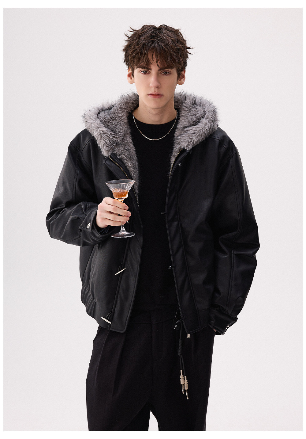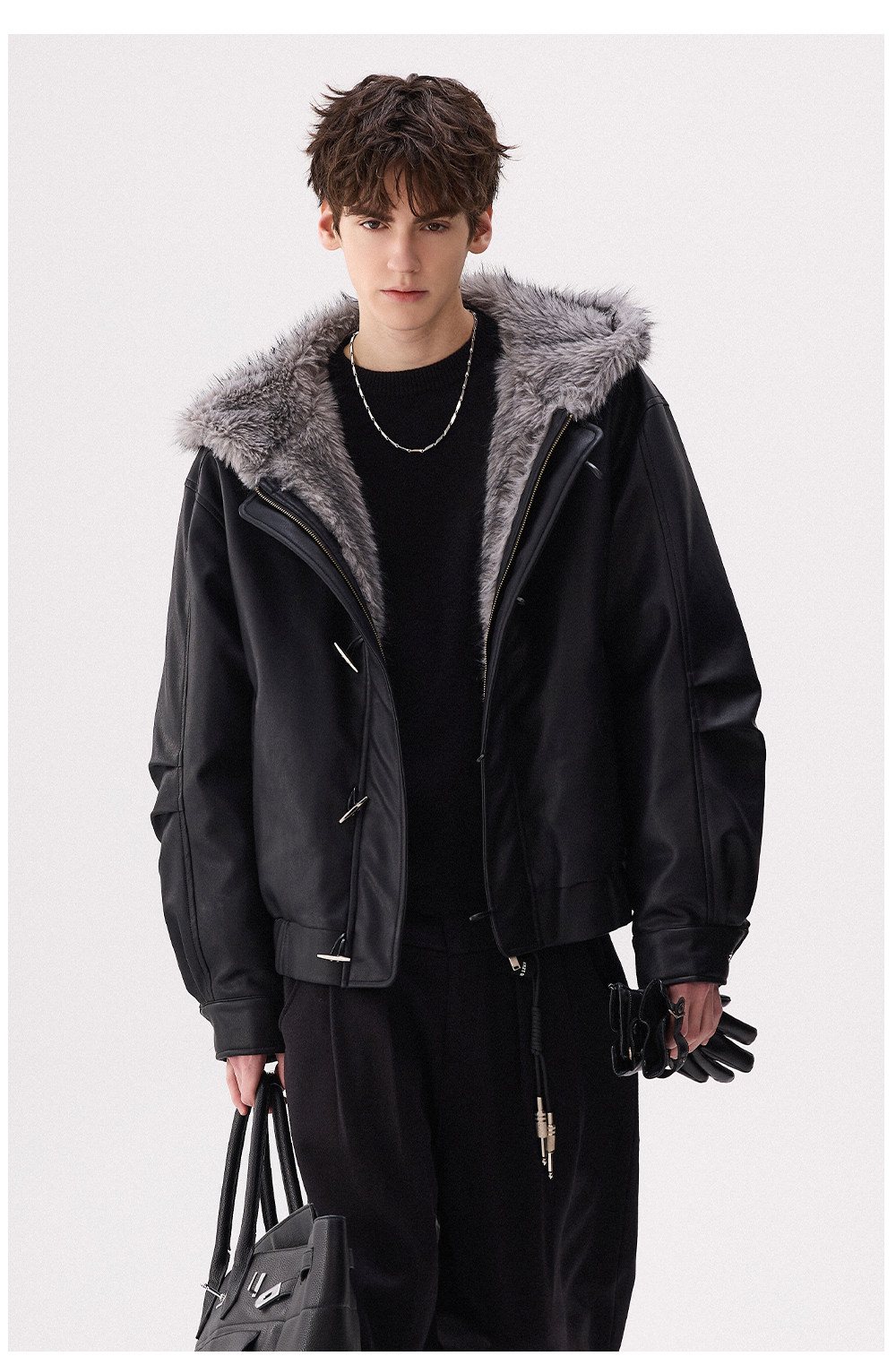 Chicerro Sicilian Men's Stylish Protein Leather Hooded Fur Collar Cotton Jacket Black Leather Coat Men's Clothing