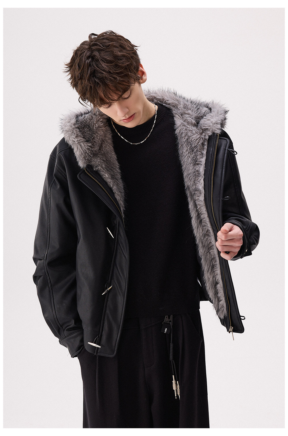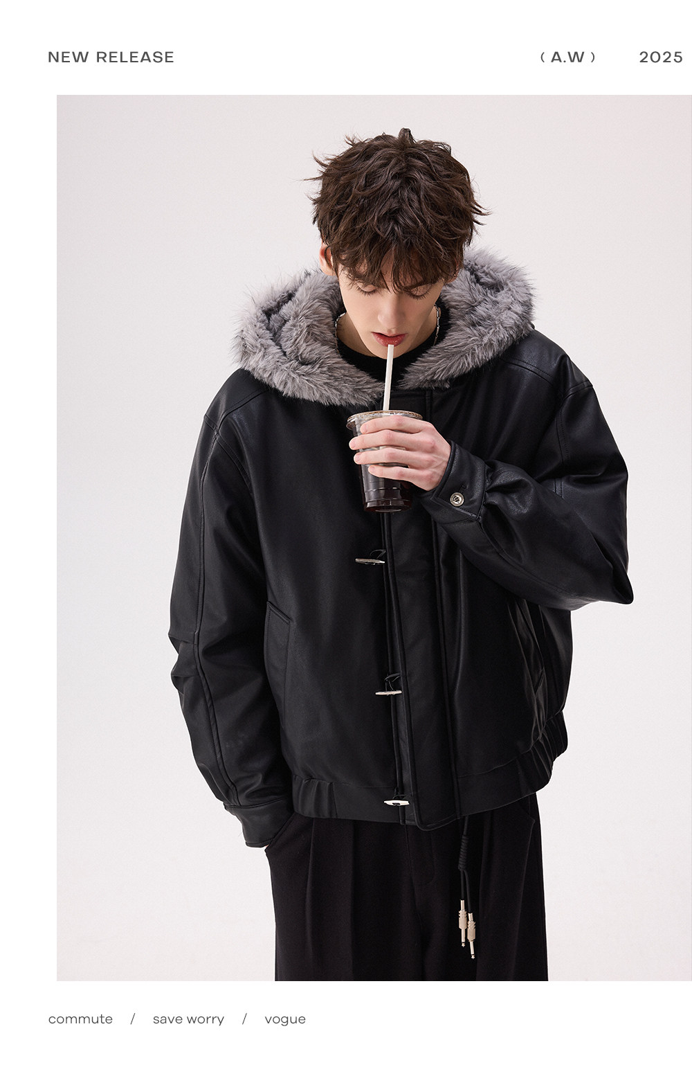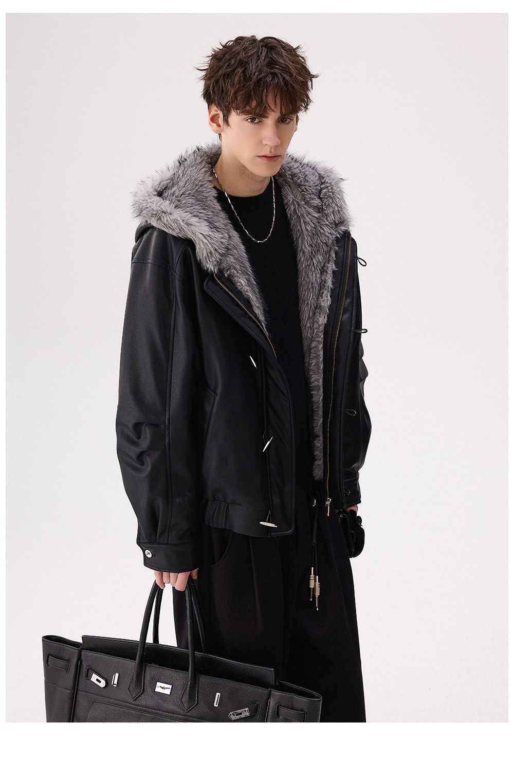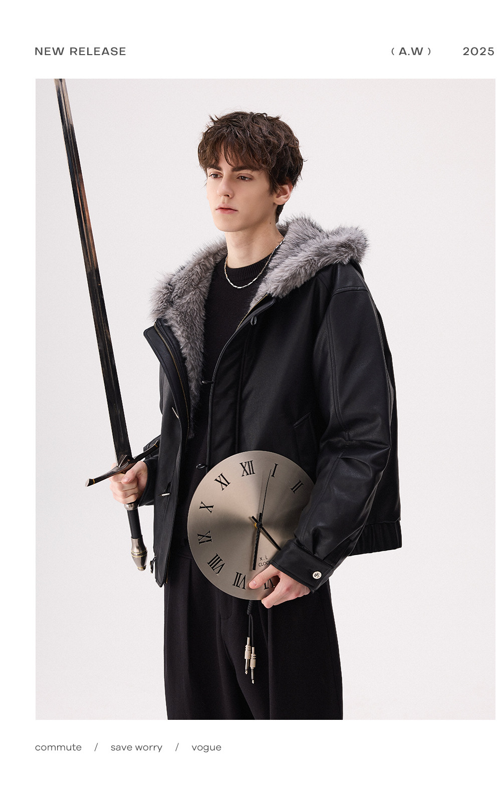 Chicerro Sicilian Men's Stylish Protein Leather Hooded Fur Collar Cotton Jacket Black Leather Coat Men's Clothing