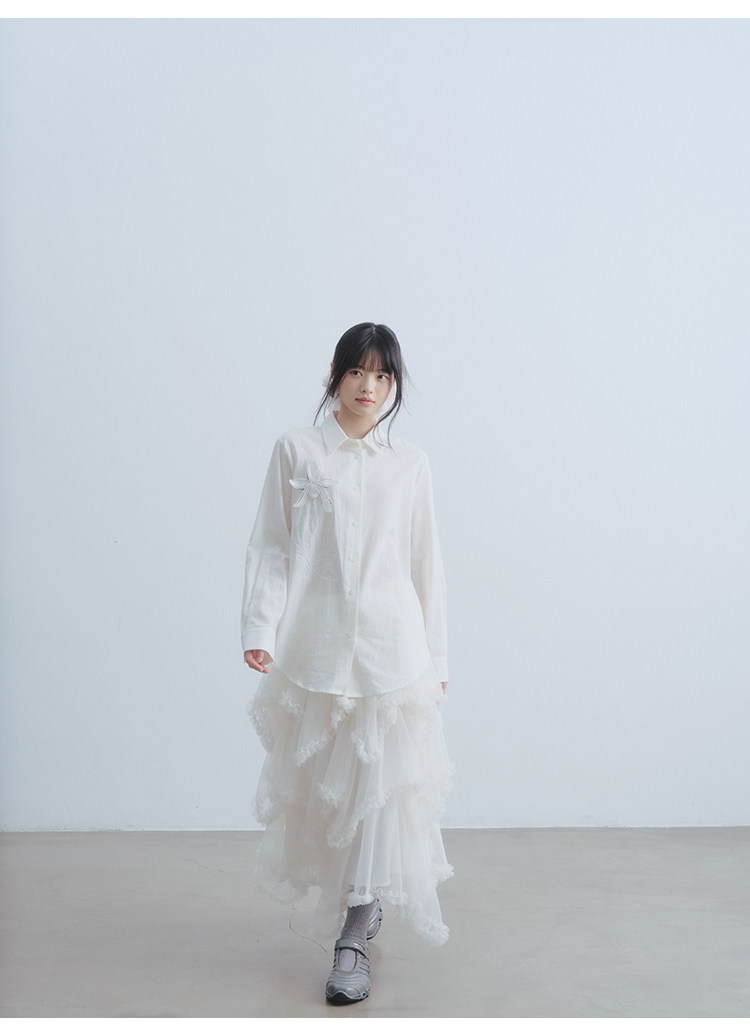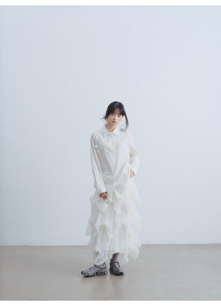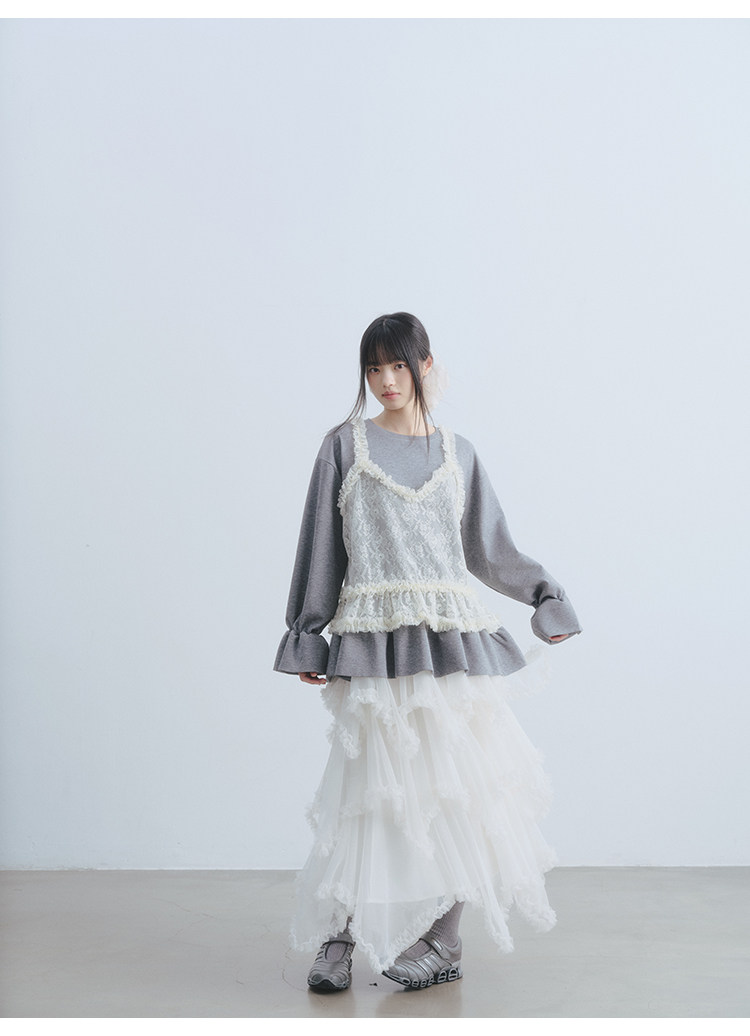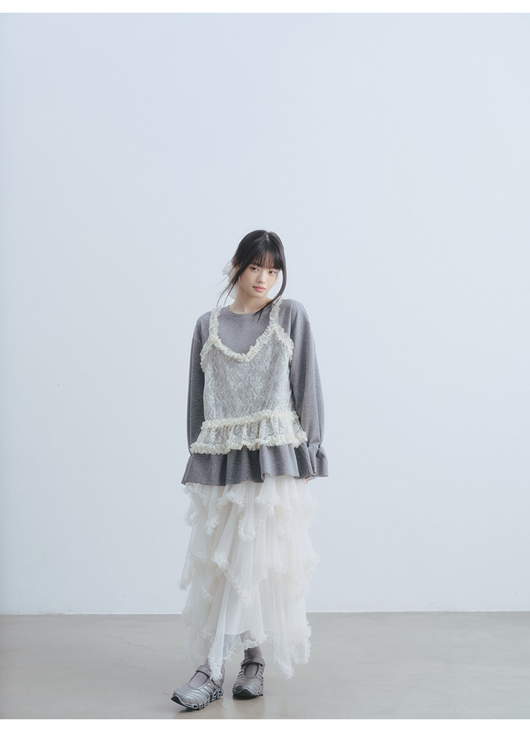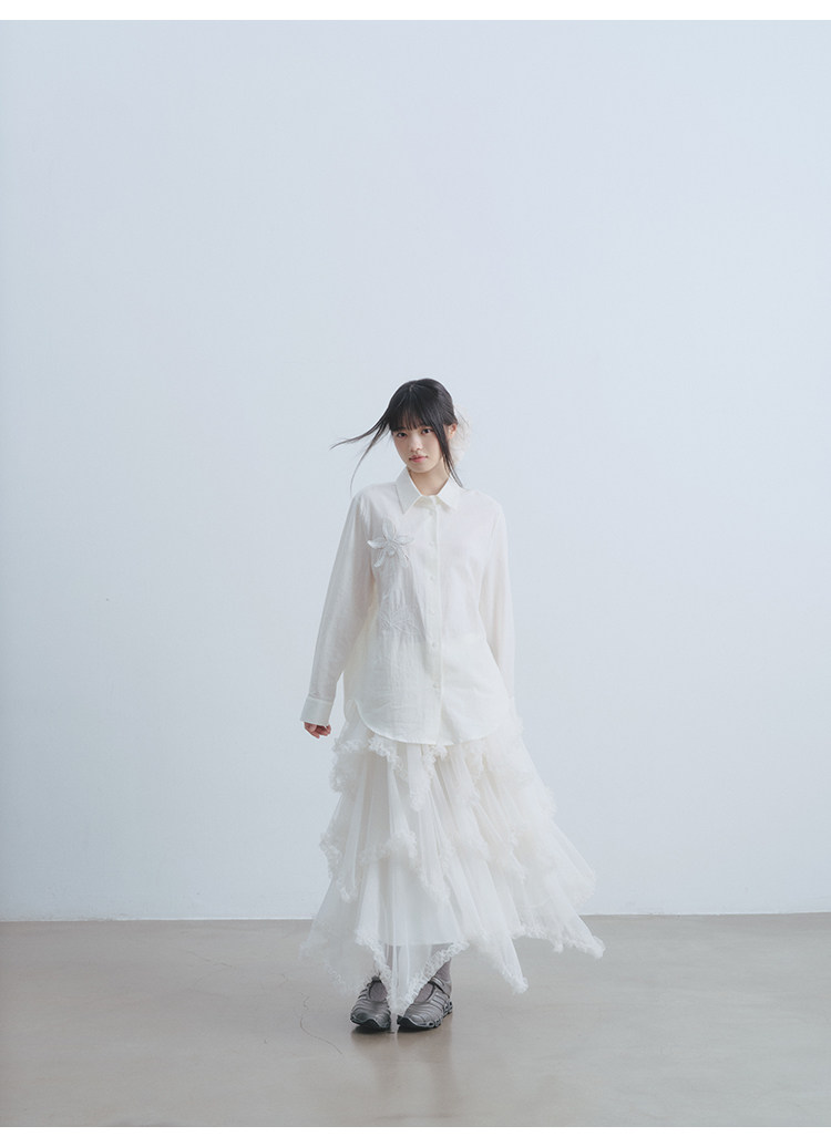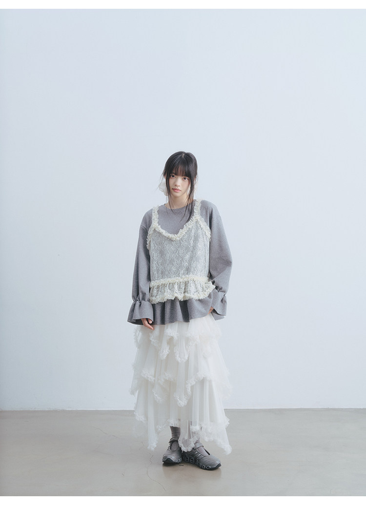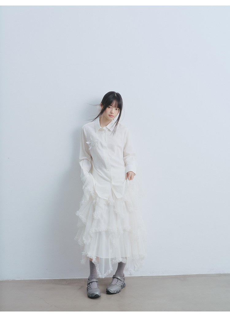 Ddgirl's Design Features an Asymmetrical Cake Mesh A-Line Midi Skirt with Ruffled Edges