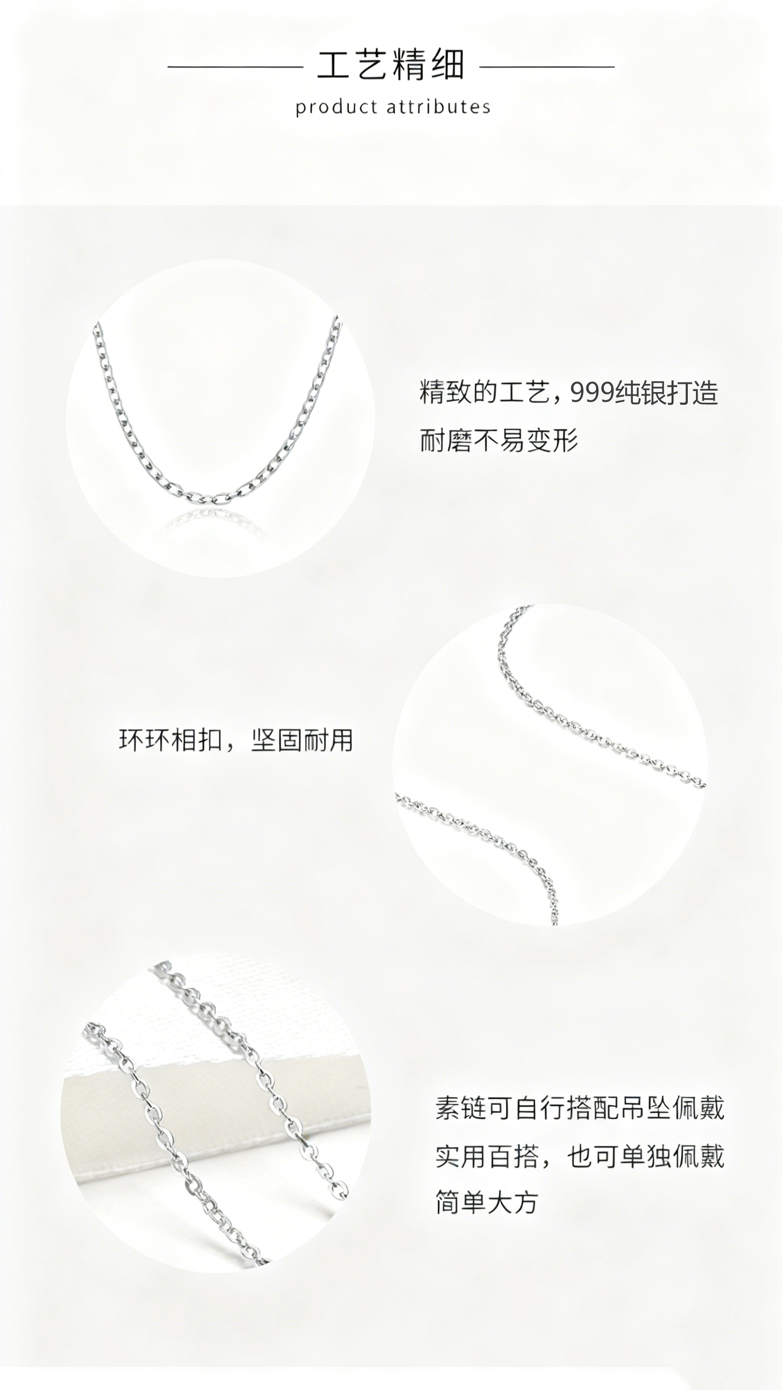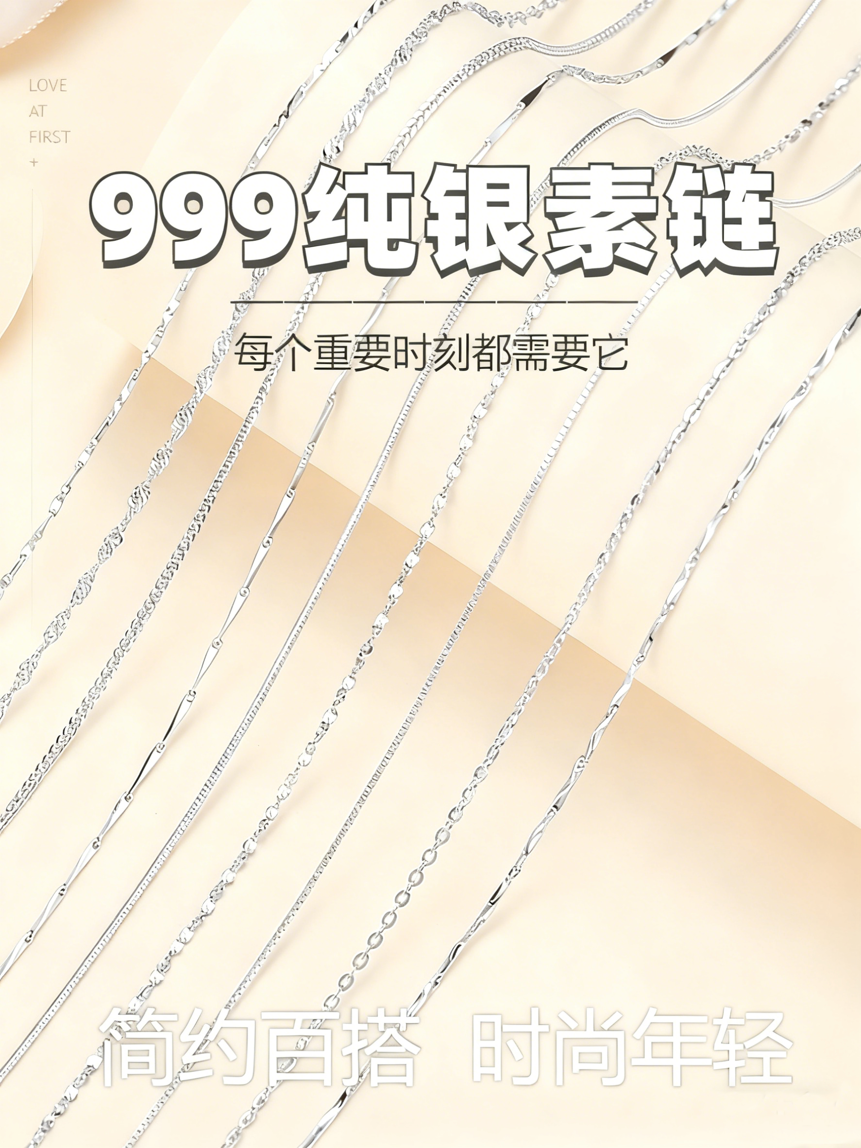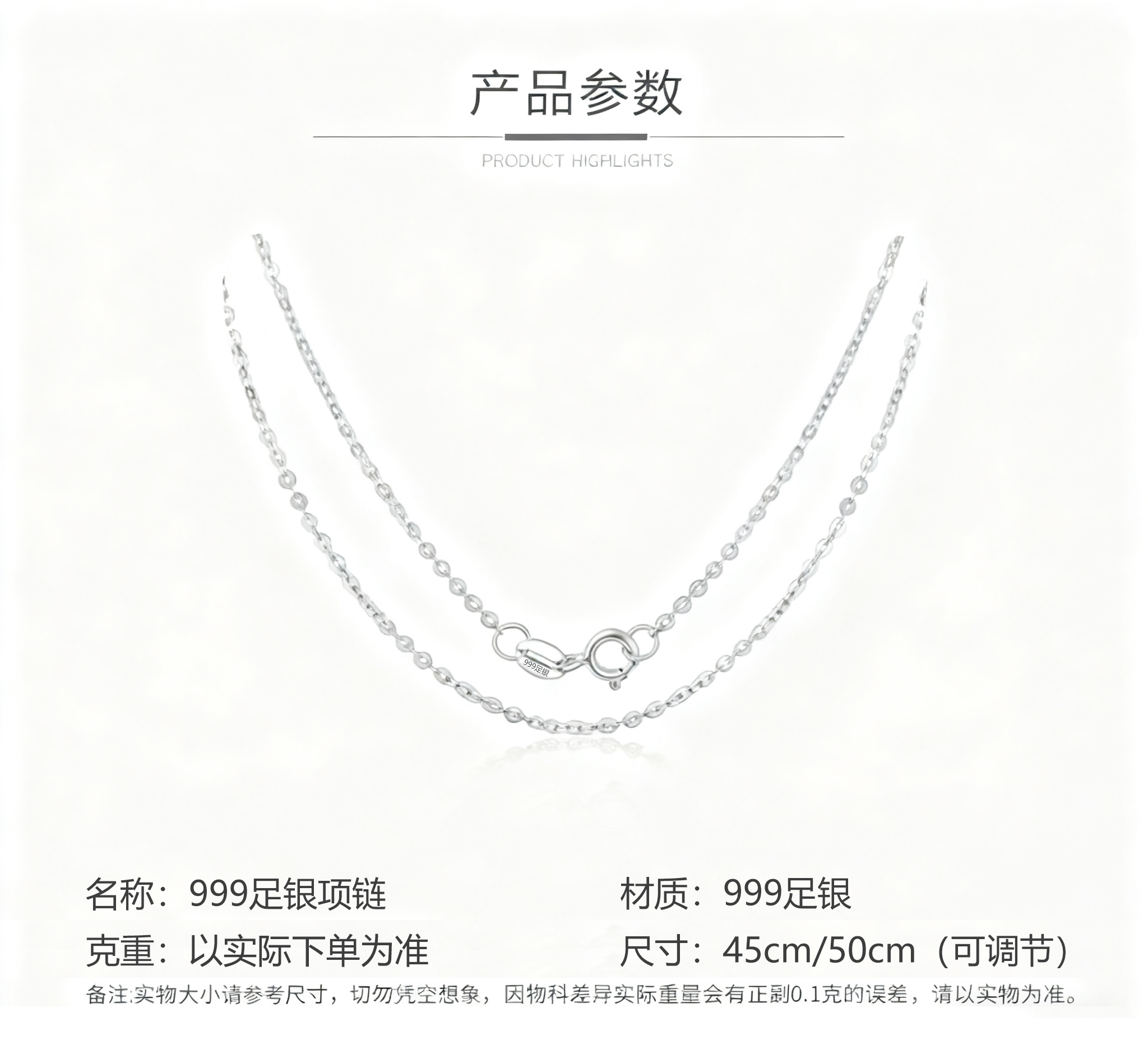 999 Pure Silver Plain Chain for Women, Genuine Silver Jewelry Necklace, Simple and Versatile O-Shaped Chain, Suitable for Pendants, Bare Chain, Clavicle Chain for Women