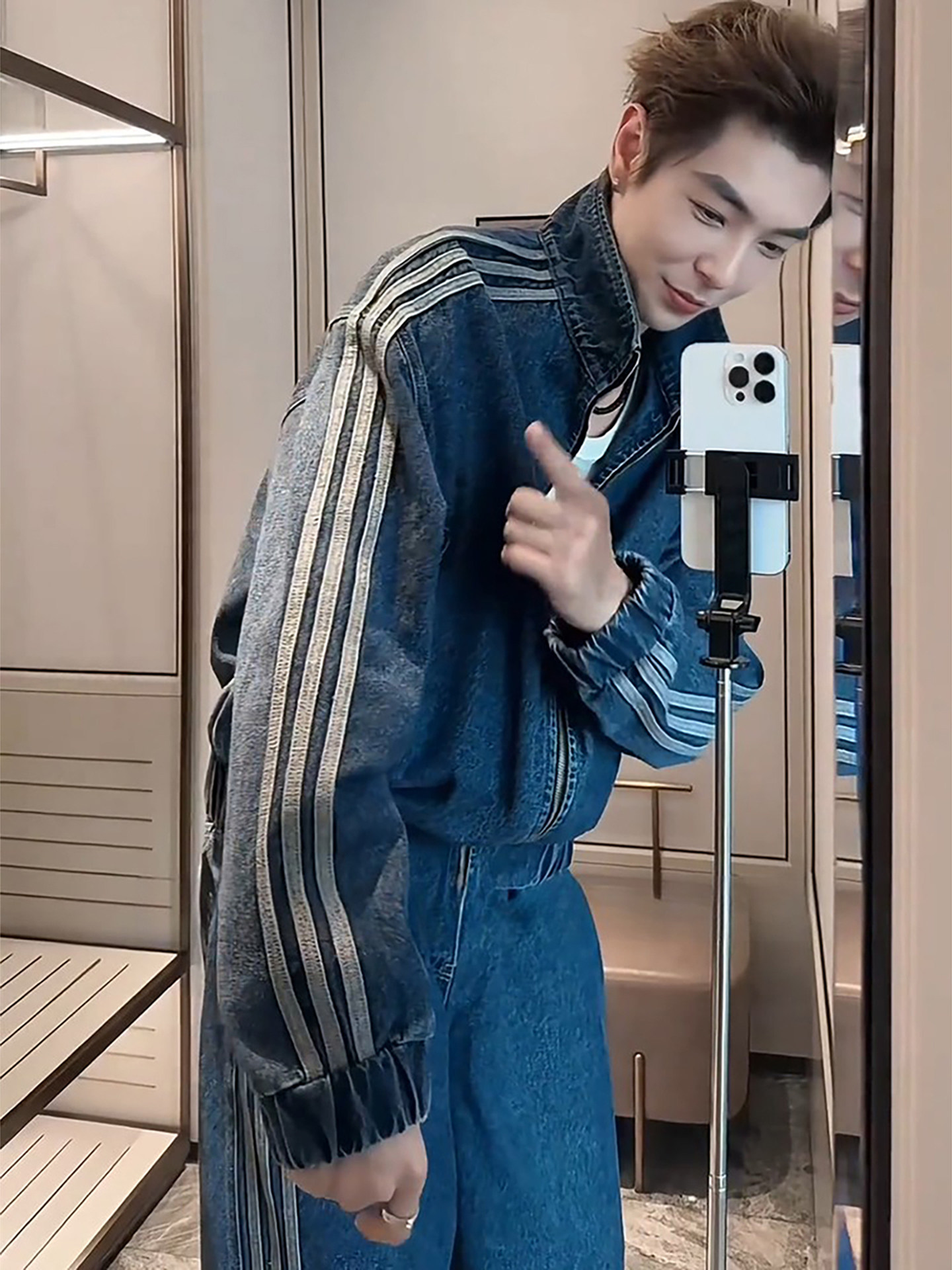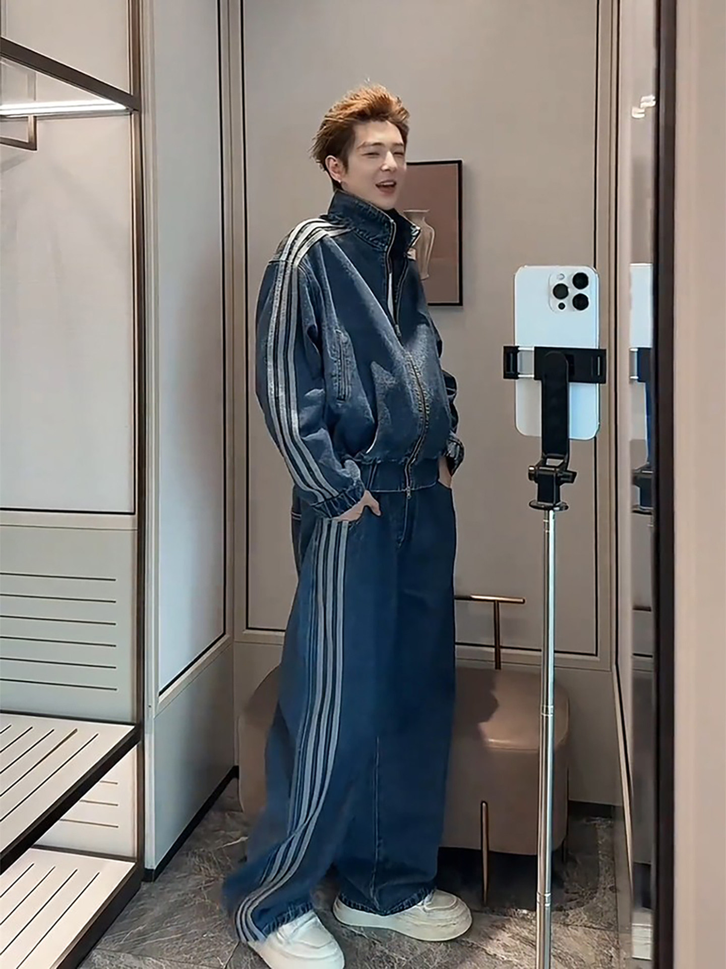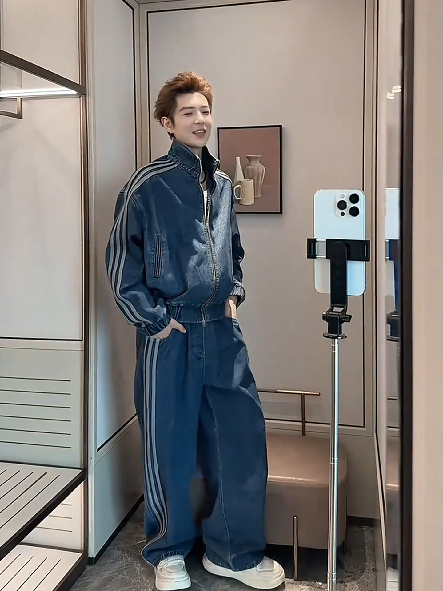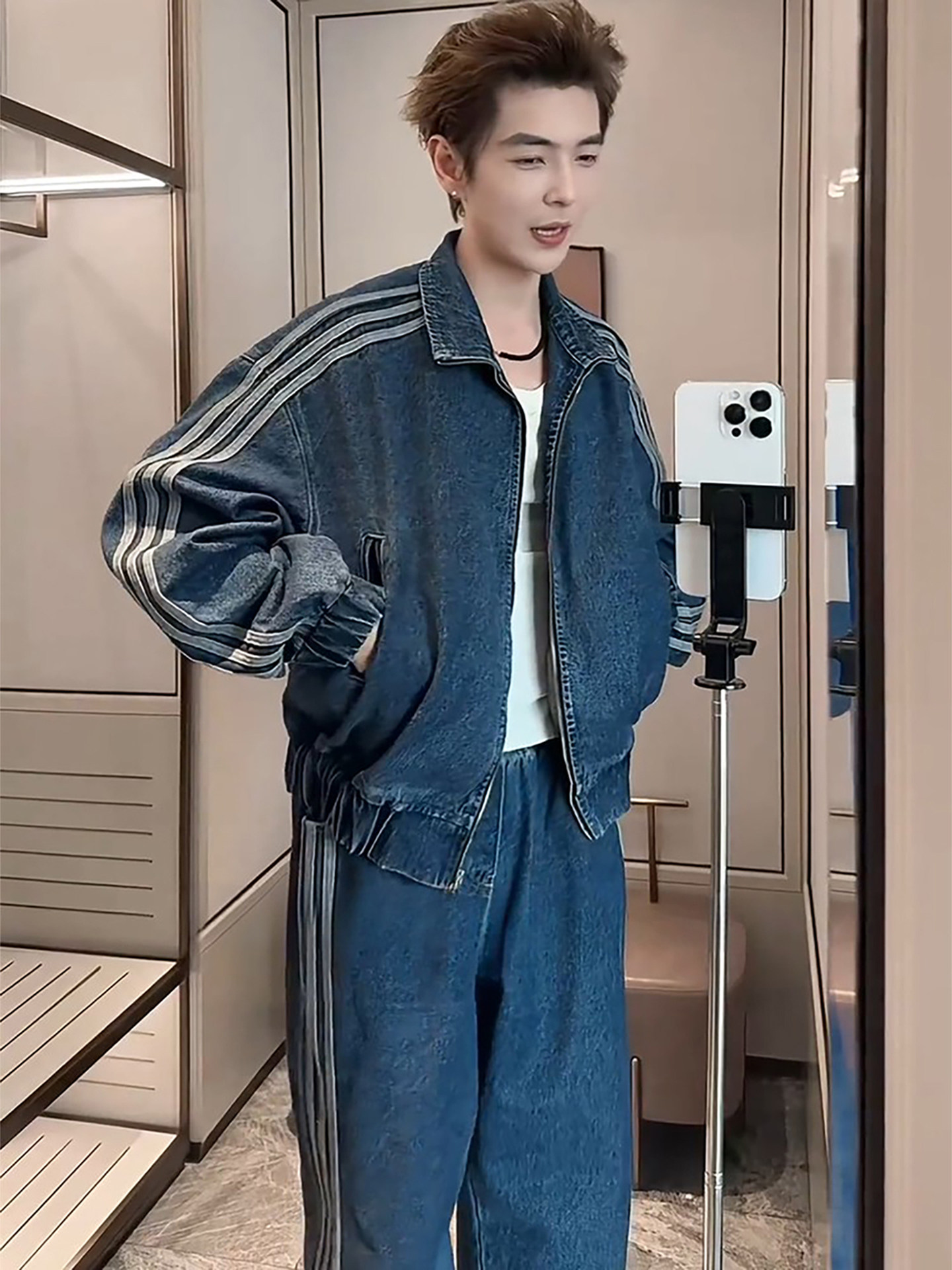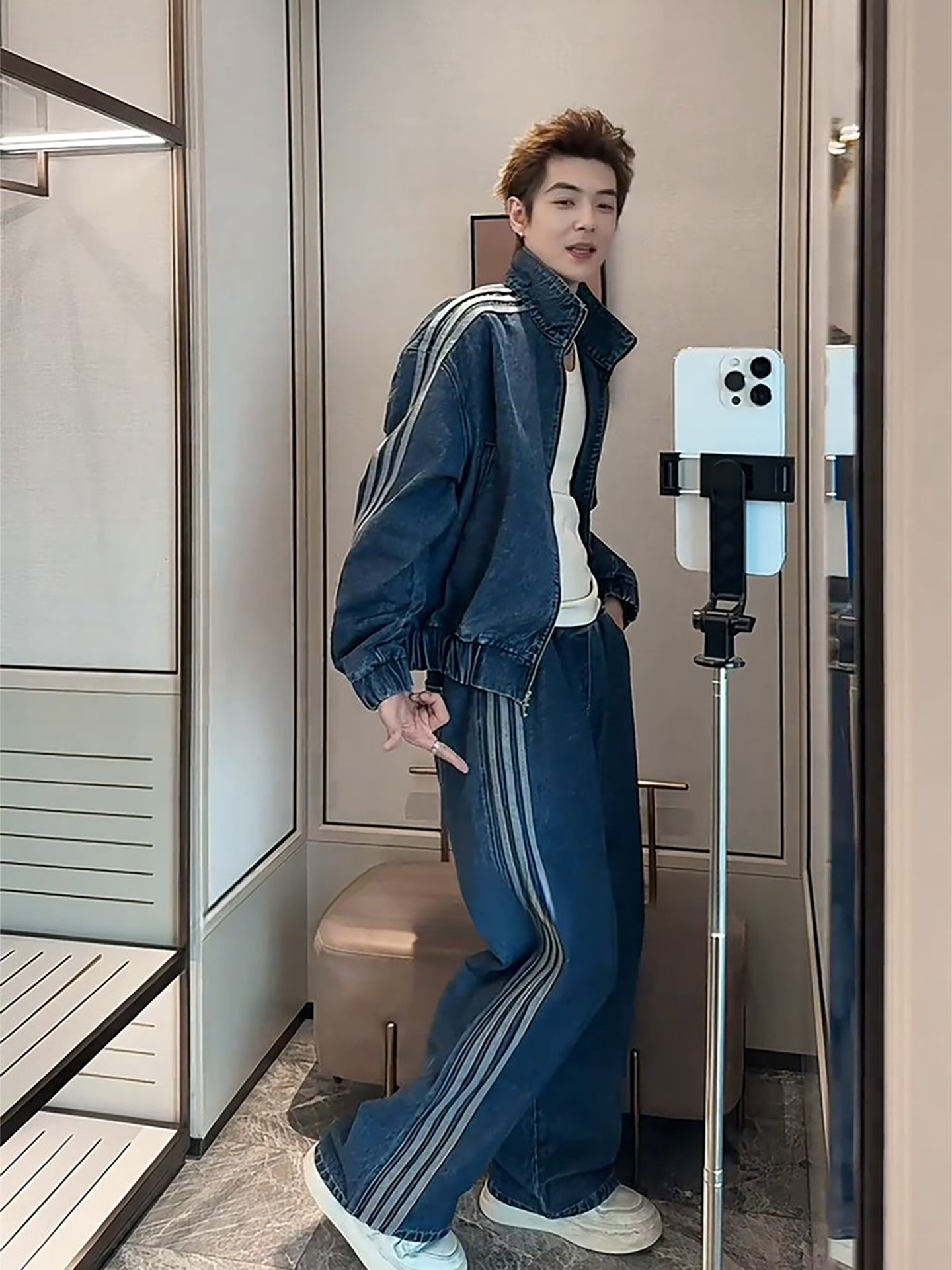 American-Style Trendy Brand Three-Stripe Denim Jacket for Men, Cool and Stylish Outfit, Complete Set with Korean-Style High-End Straight-Leg Wide-Leg Pants