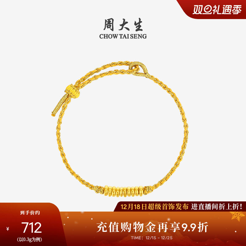 Chow Tai Sheng's gold good luck coil bracelet foot gold hard gold beaded bracelet rope coil wrap gold Christmas gift for girlfriend