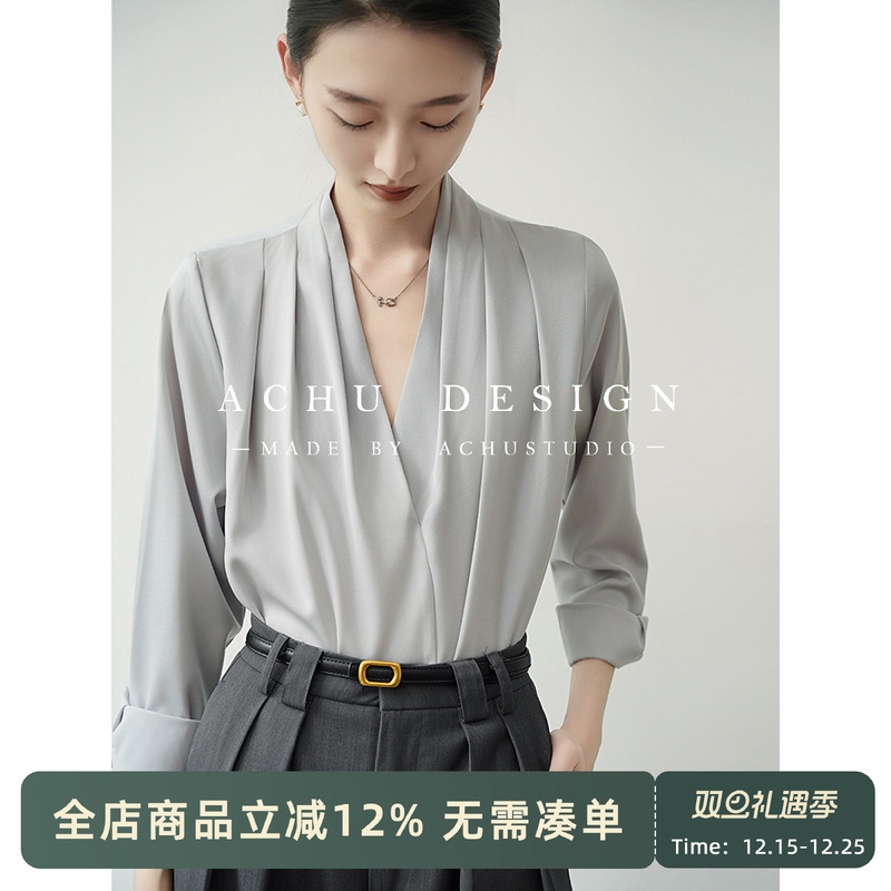ACHU temperament shou selection gray V-neck satin shirt women's professional shirt light workplace commuter wear top