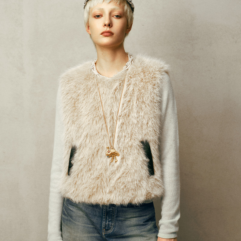CyNi [Caramel Afternoon] Maillard vintage plush patchwork cropped top fake two pieces of furry coat for women