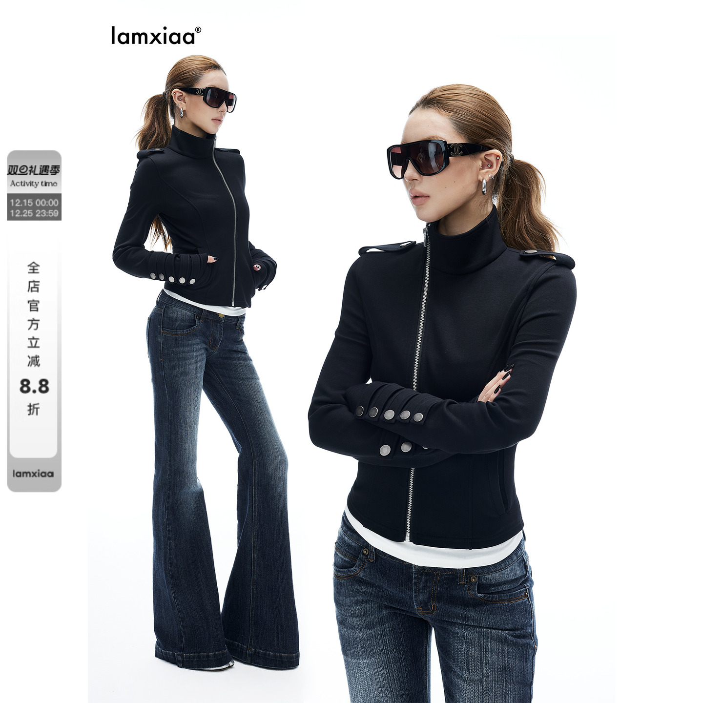 iamxiaa* scan zipper distressed buckle design stand-up collar epaulettes slim cropped cotton knit sweatshirt jacket