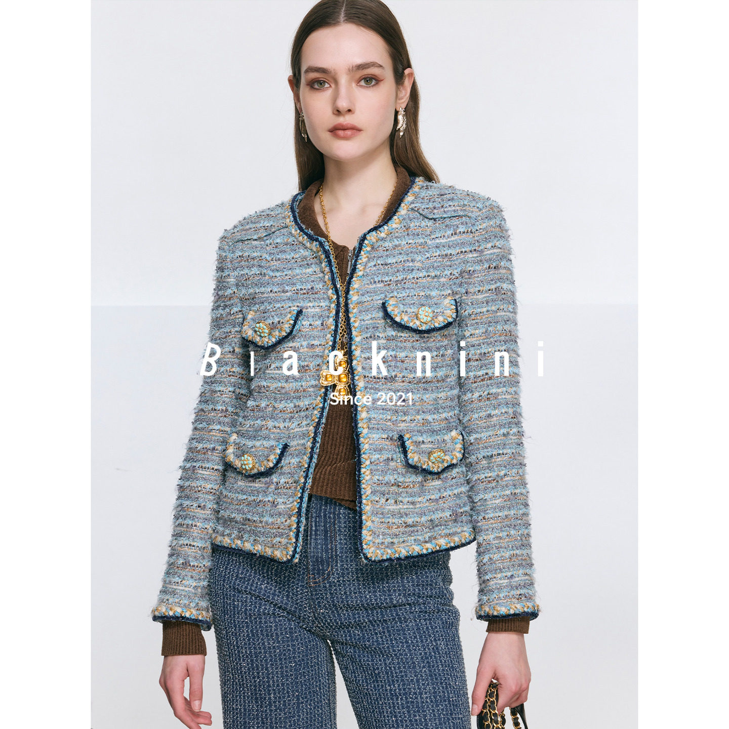 Blacknini "Blue Cuban" tweed is a shame to be a flower board! European ACT3 handicraft workshop small fragrance jacket
