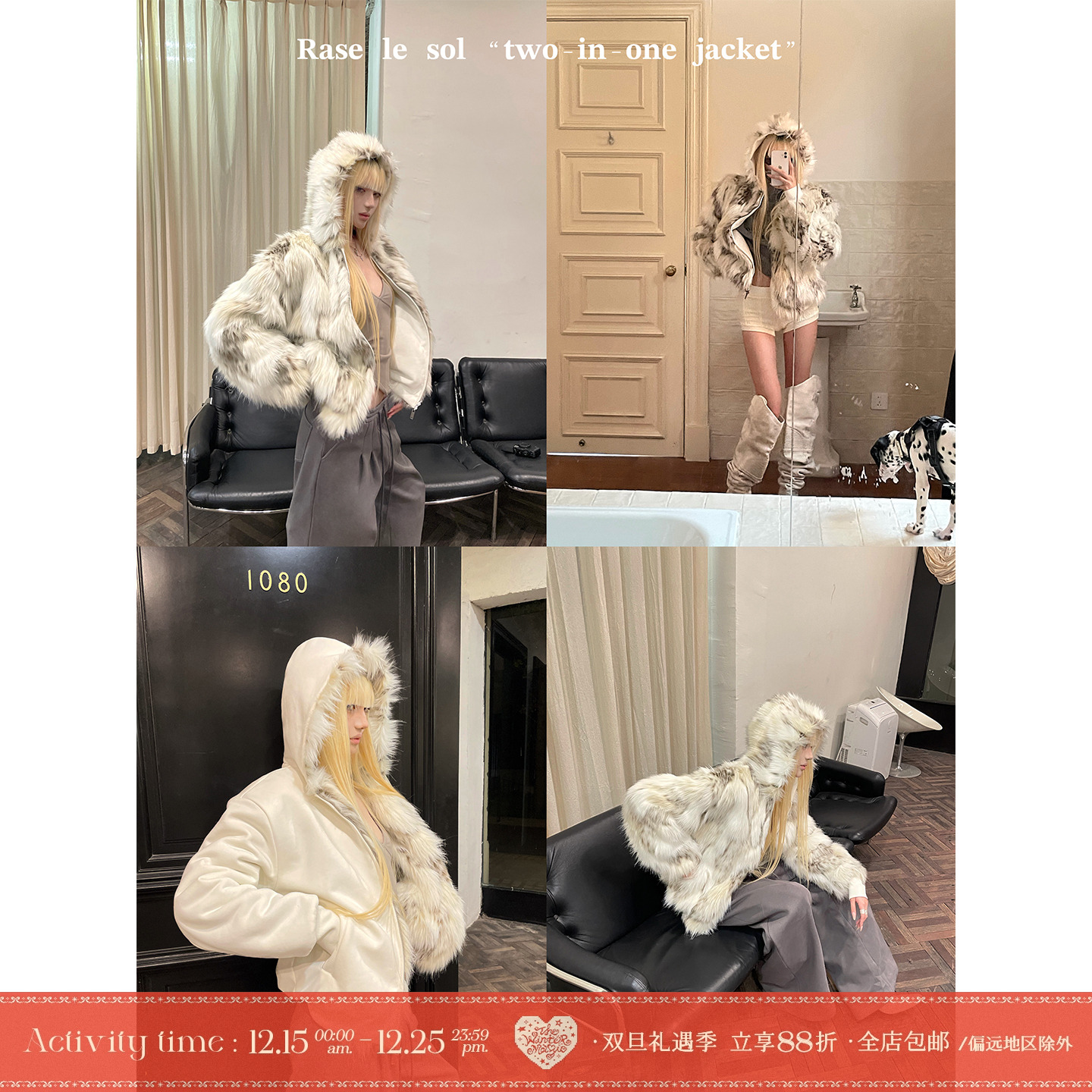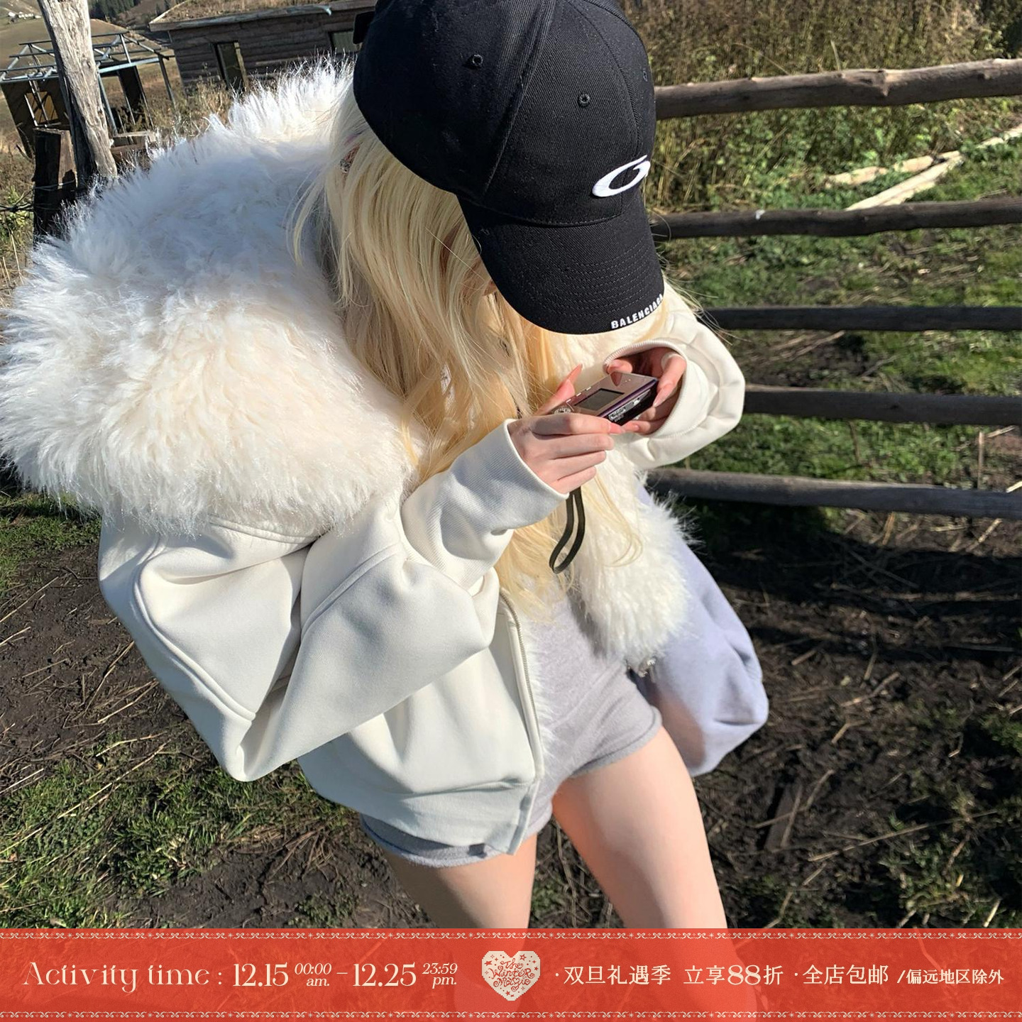 Rase le sol 'Love of Fate' white fur collar with fleece cropped hooded thickened sweatshirt jacket