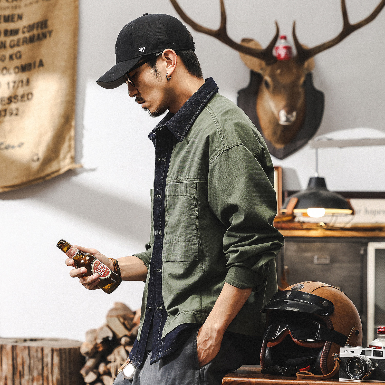 American retro trendy brand fake two denim jackets men's spring new ruffian handsome loose shirt jacket men's style