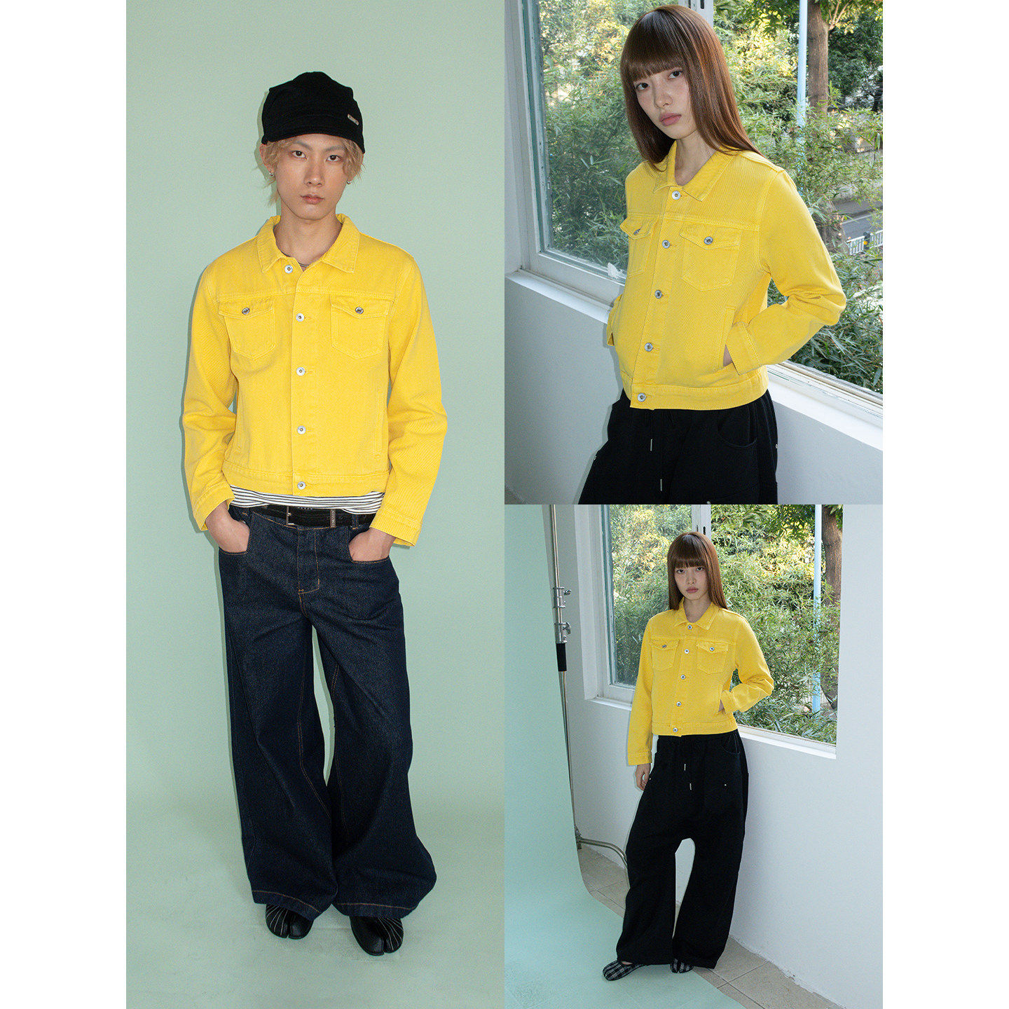 FUNKYFUN bright yellow washed and distressed cropped lapel jacket denim jacket
