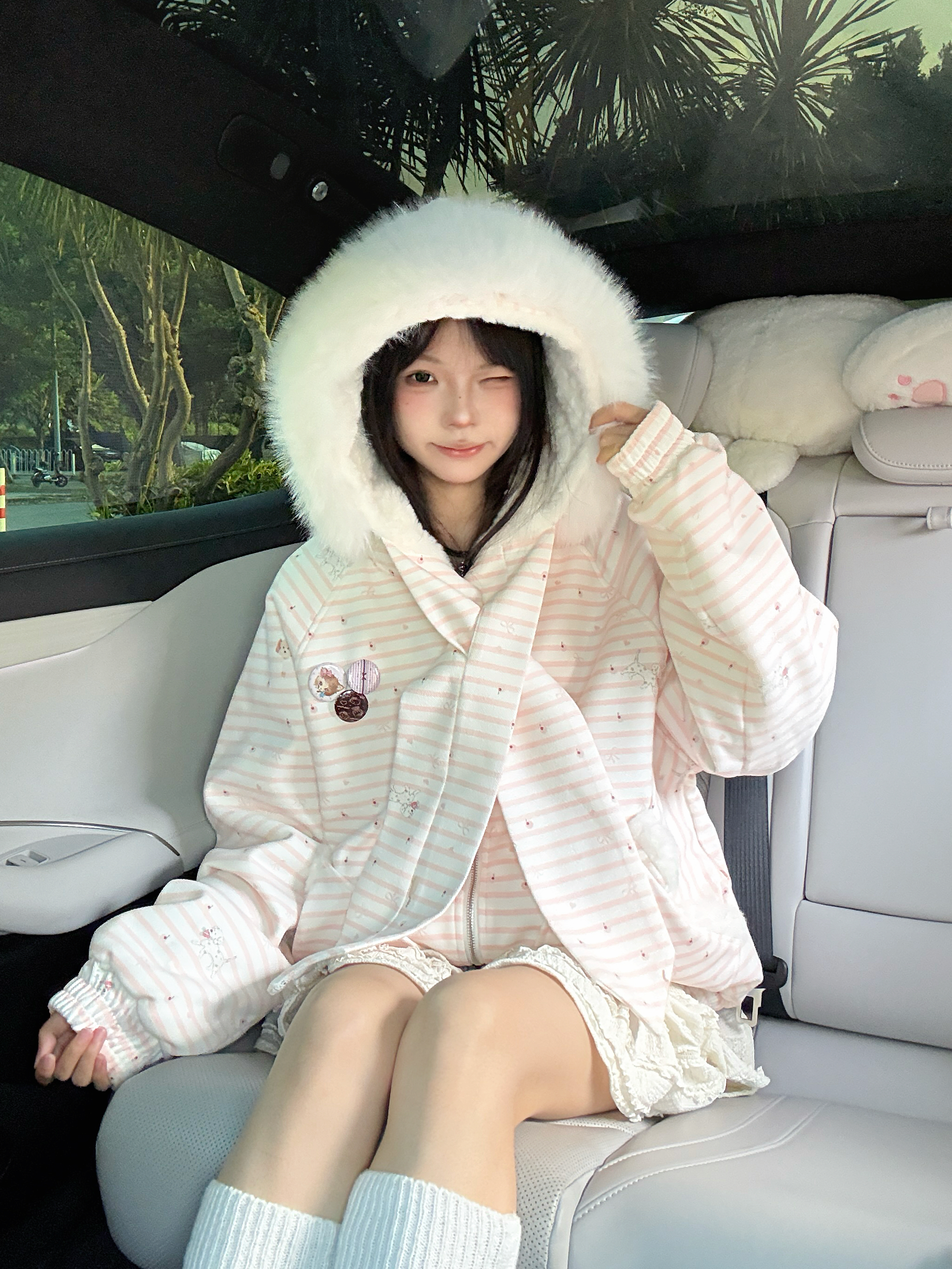 Dreaming of a special student original Korean sweet strap-on striped cotton jacket plush warm and loose cropped top