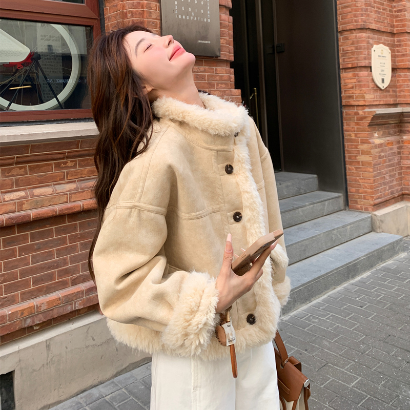 ins Internet celebrity hit stand-up collar suede fur integrated small man thickened lambswool short coat women's winter new model