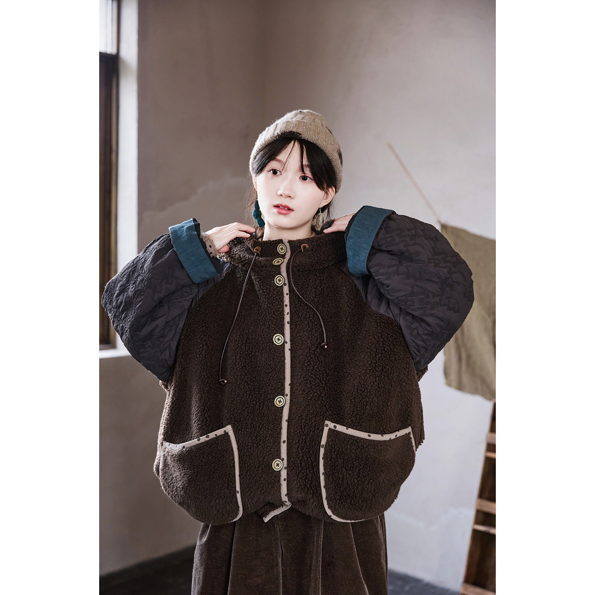 Air Little Warmth! Light and warm pearl fleece wool cotton jacket knitted patchwork stand-up collar loose jacket women's autumn and winter