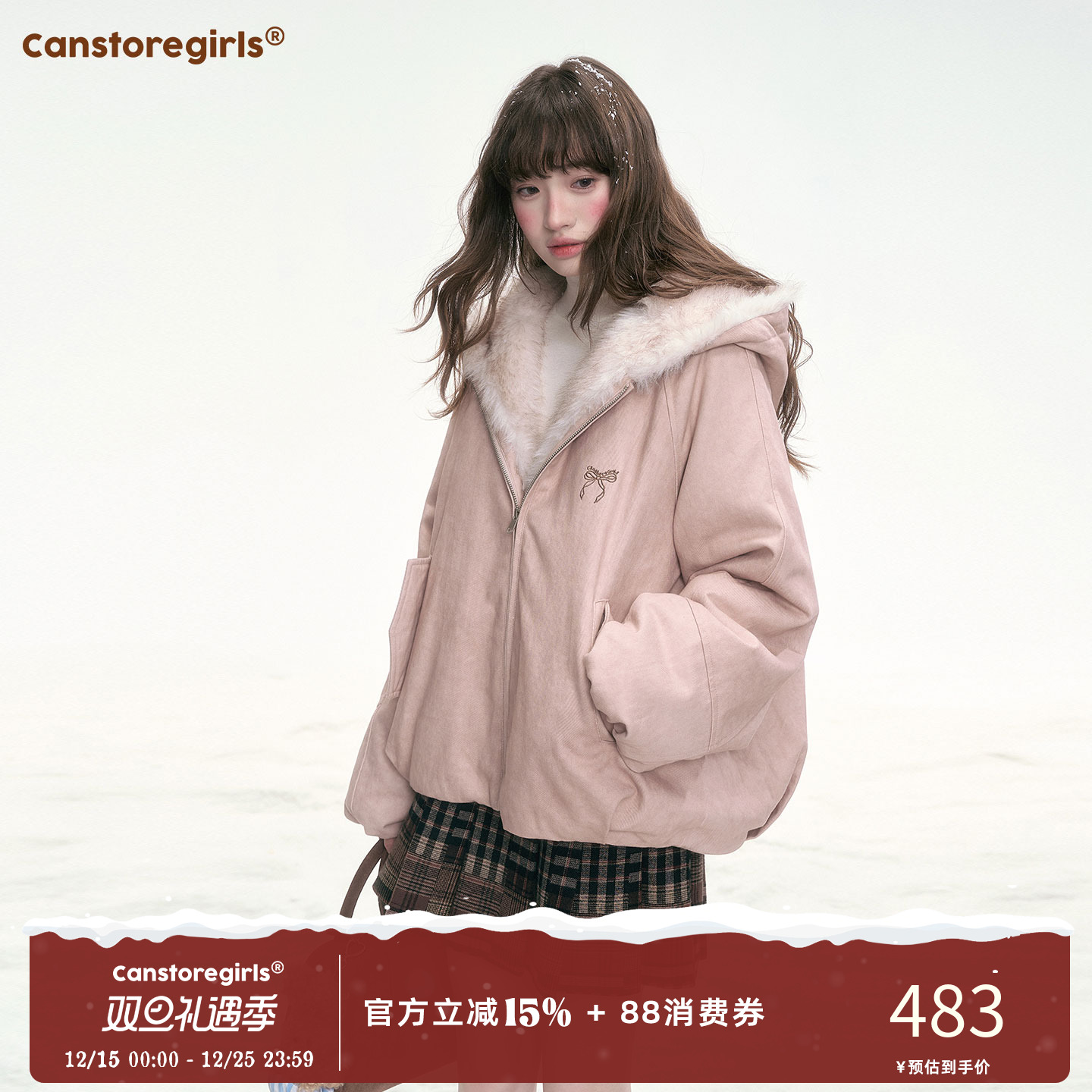 Canned stores 'Mist Peach Velvet Pocket' winter eco-friendly fur jacket warm cotton jacket wearing a parka on both sides