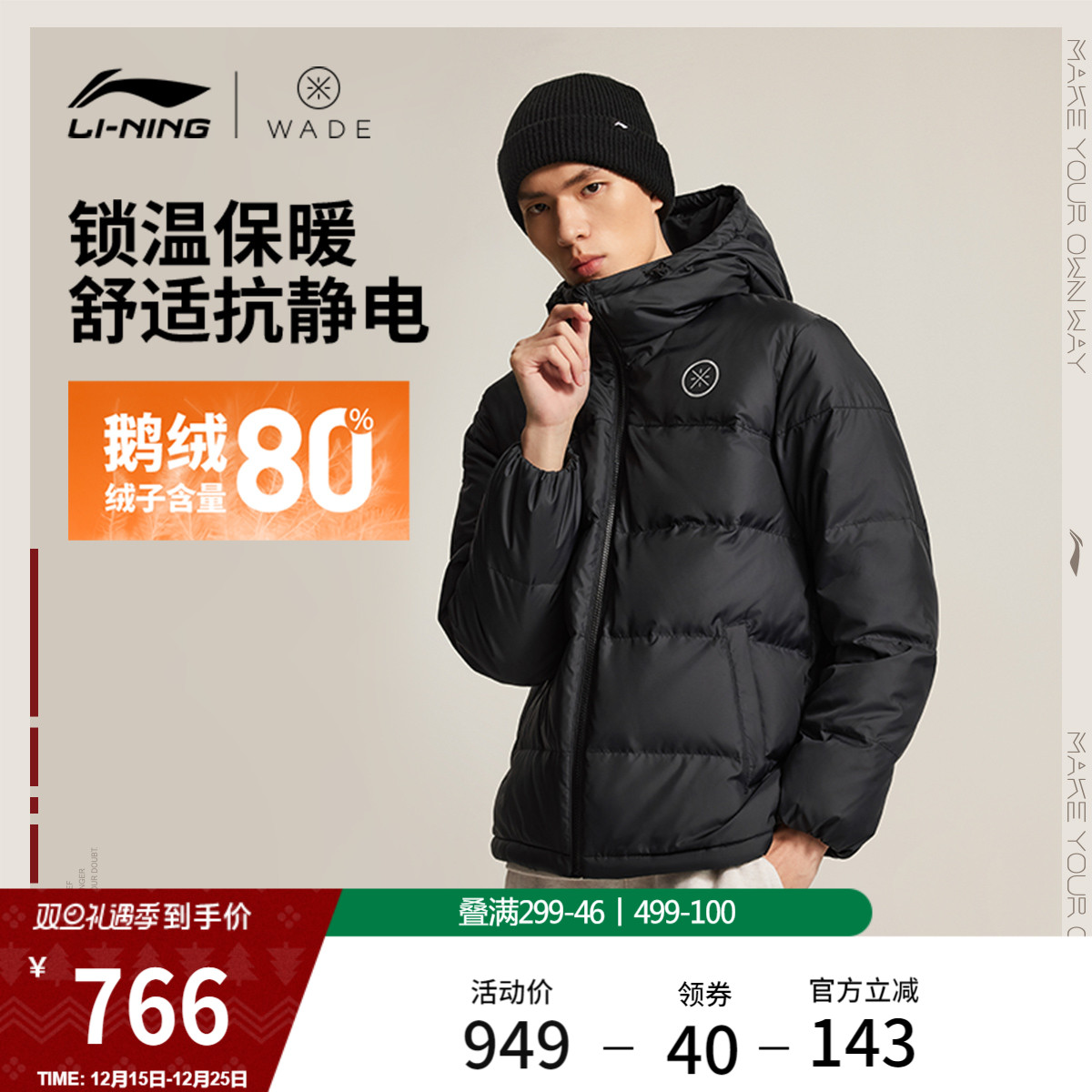 Li Ning Down Jacket Men's Winter 2025 New Wade Series Short Hooded Top Goose Down Cold-proof Sportswear
